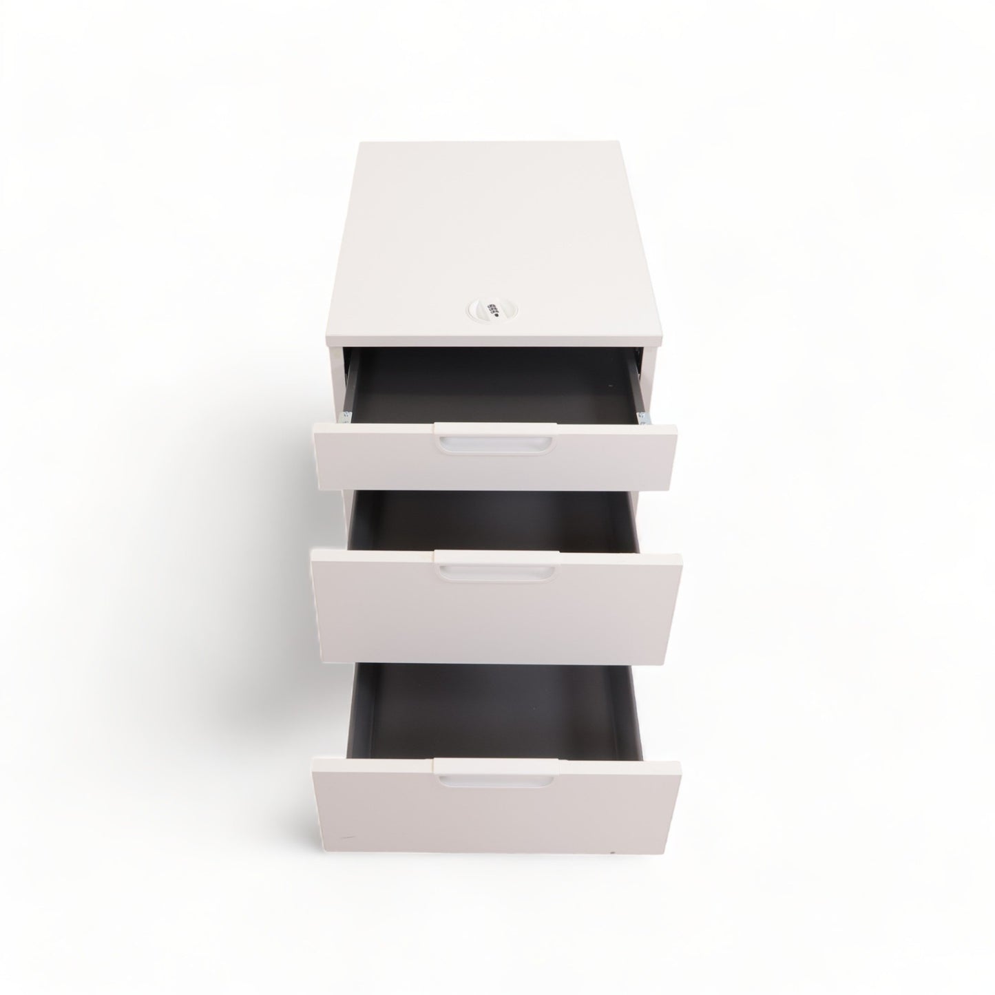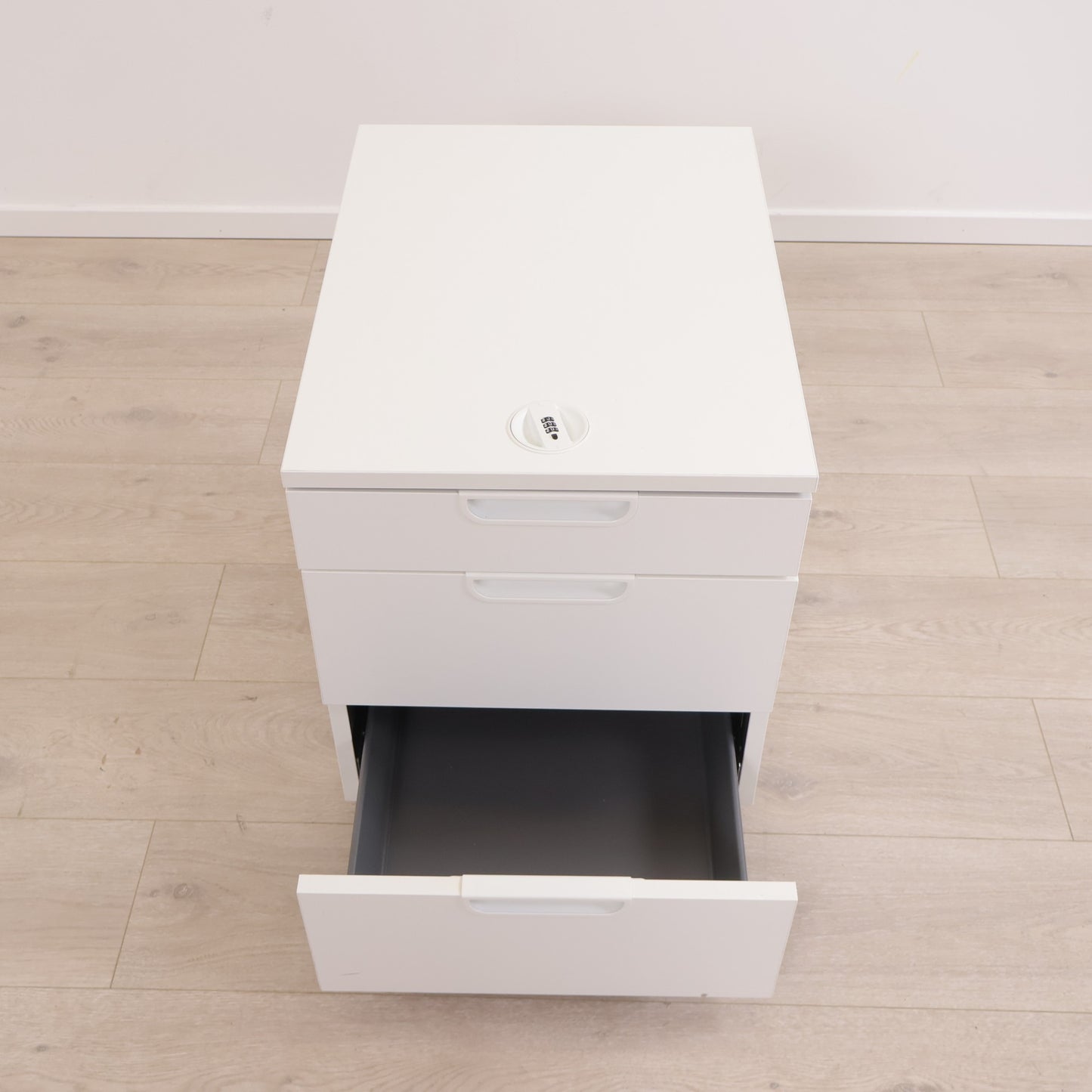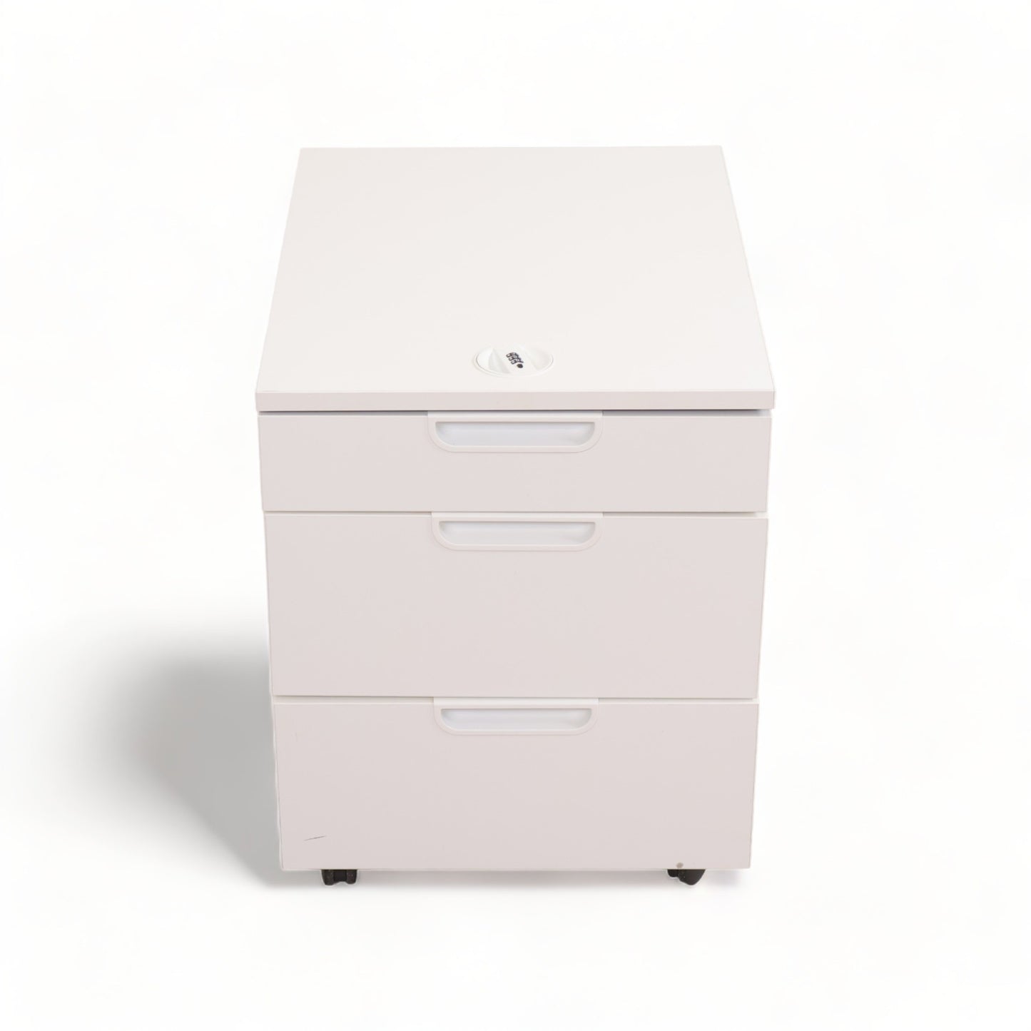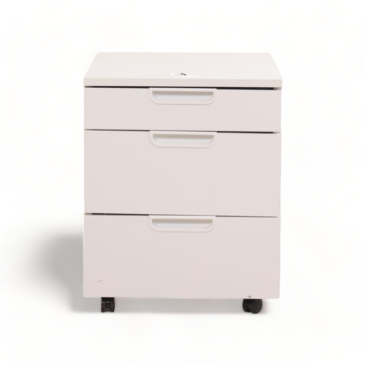 Hvit IKEA skuffseksjon med lås og hjul. Hold dokumentene dine trygge med denne skuffseksjonen med lås fra IKEA. Skuffseksjonen har en moderne stil, og er utstyrt med hjul som gjør at den lett kan rulles under en pult eller et bord. De tre skuffene har i tillegg dempere som gjør at de kan lukkes mykt og forsiktig. Noen bruksmerker vises på de siste bildene. Ellers er skuffeseksjonen i god stand.