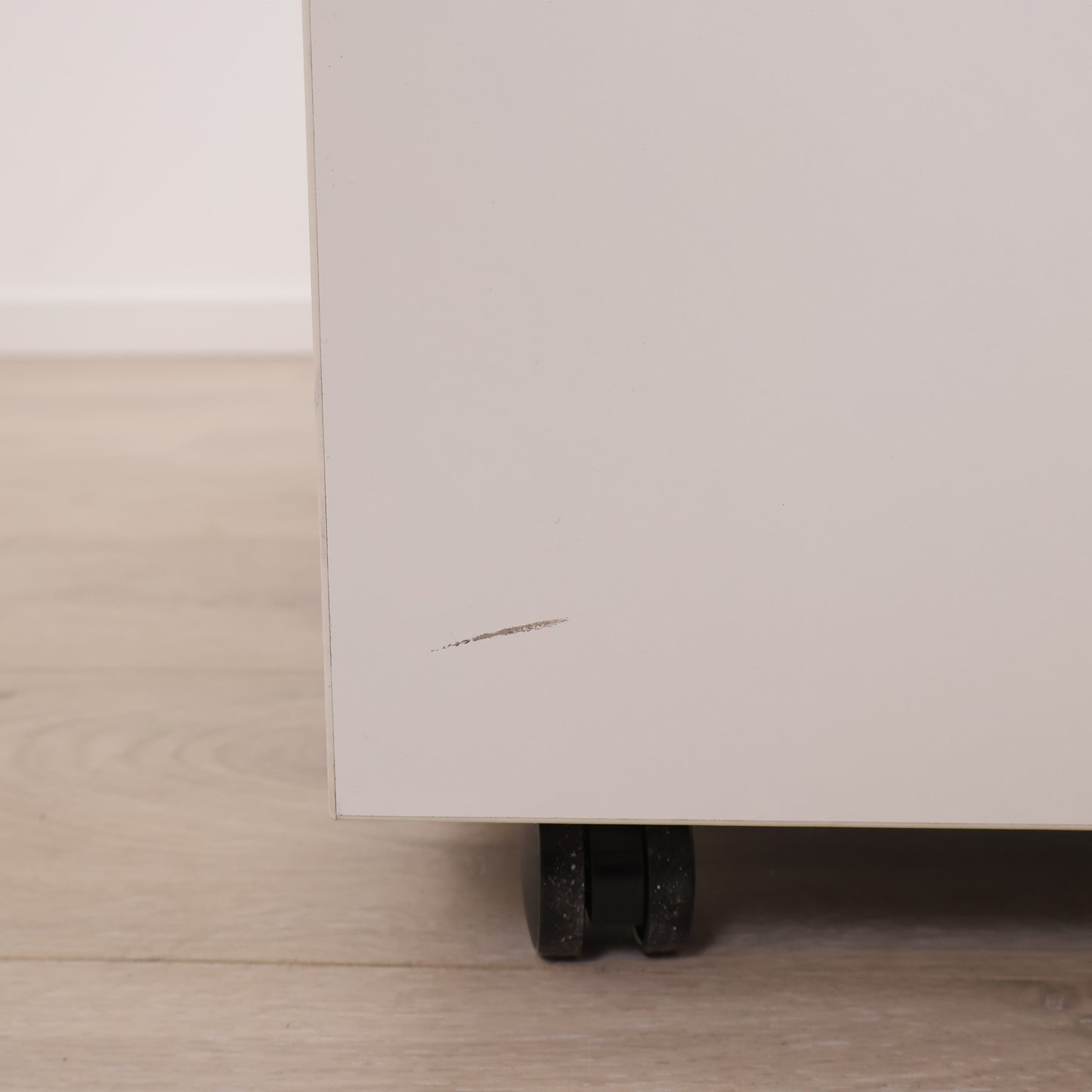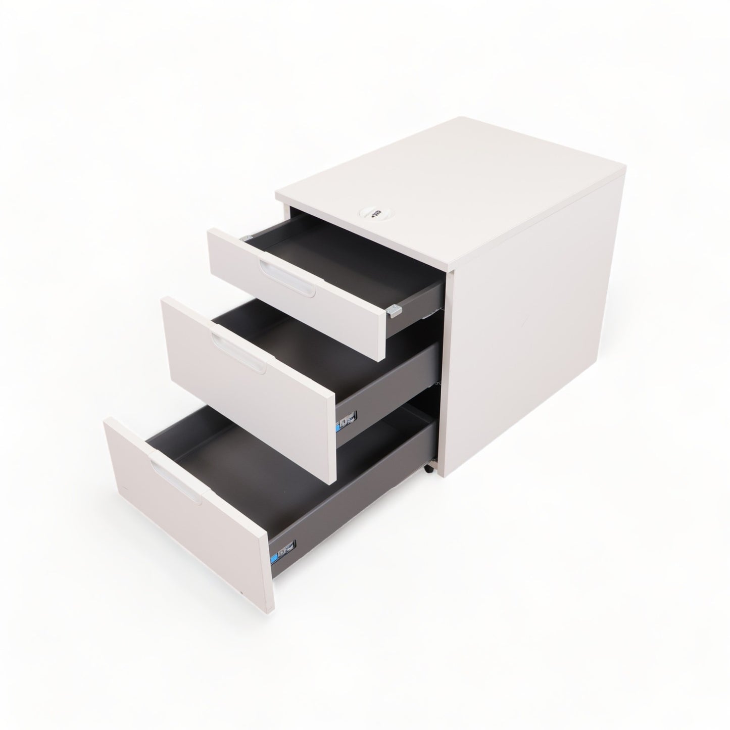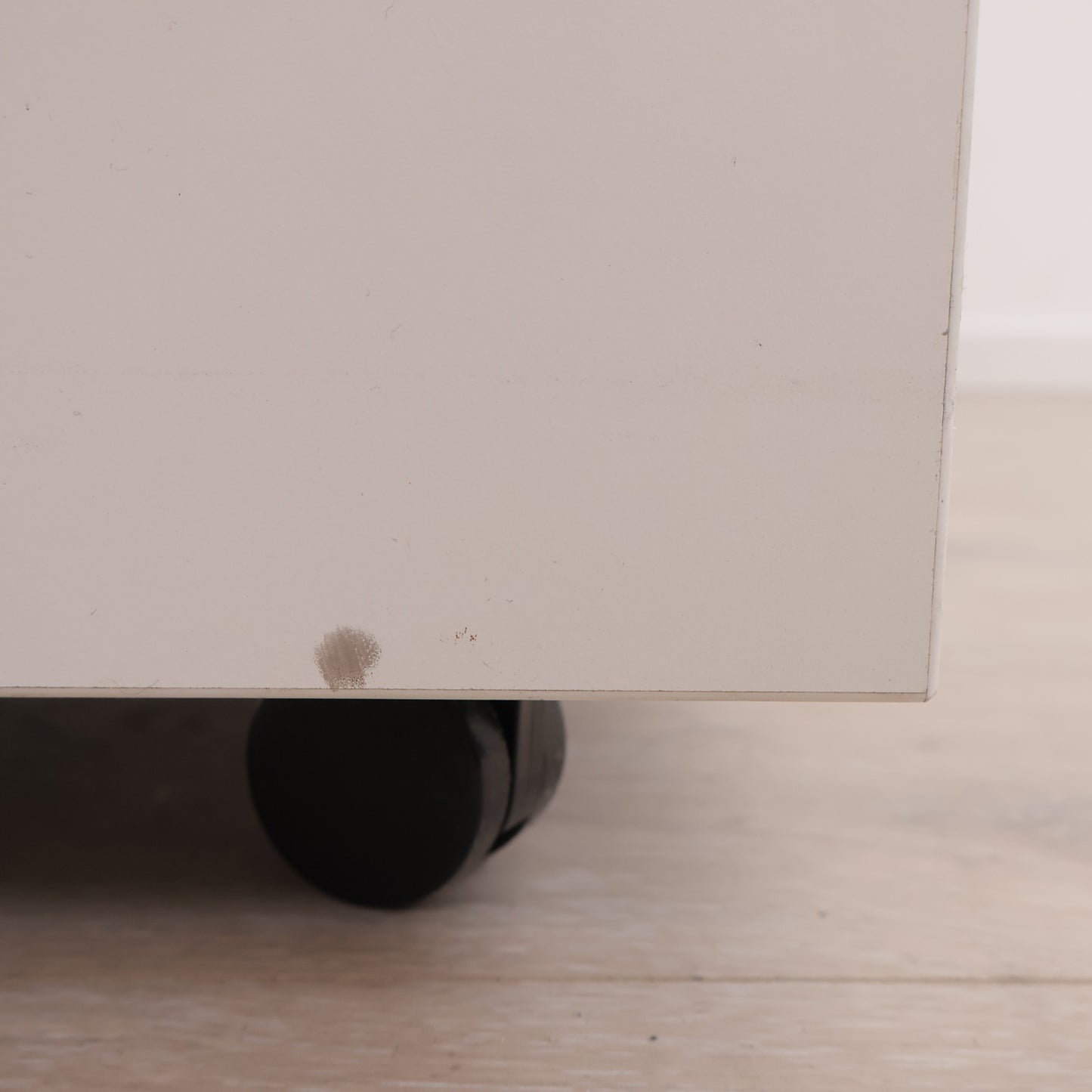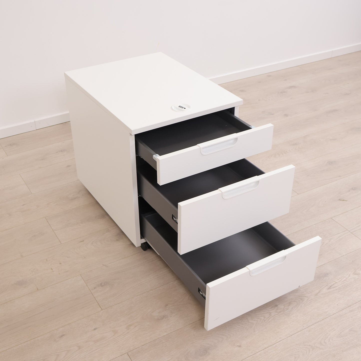 Hvit IKEA skuffseksjon med lås og hjul. Hold dokumentene dine trygge med denne skuffseksjonen med lås fra IKEA. Skuffseksjonen har en moderne stil, og er utstyrt med hjul som gjør at den lett kan rulles under en pult eller et bord. De tre skuffene har i tillegg dempere som gjør at de kan lukkes mykt og forsiktig. Noen bruksmerker vises på de siste bildene. Ellers er skuffeseksjonen i god stand.