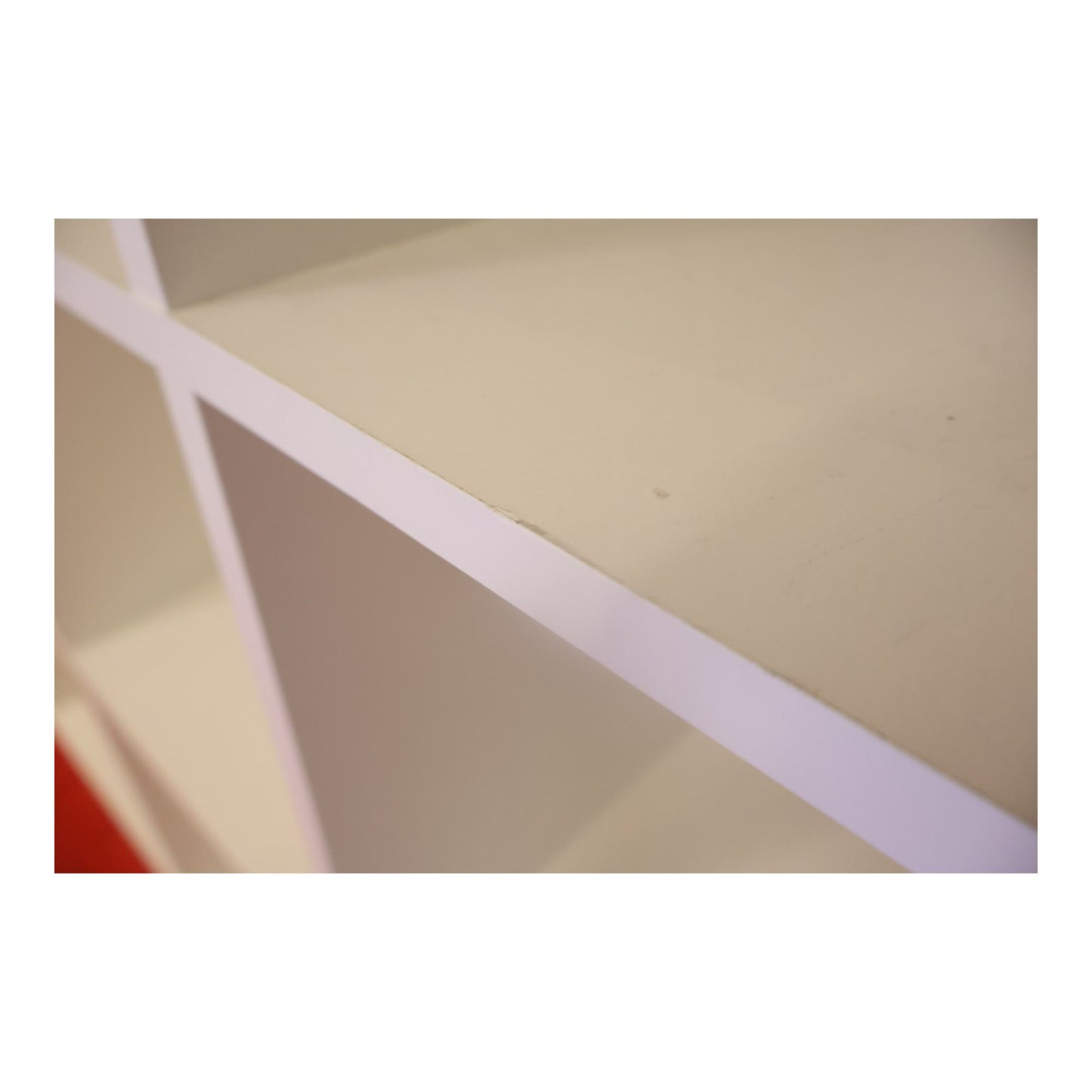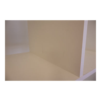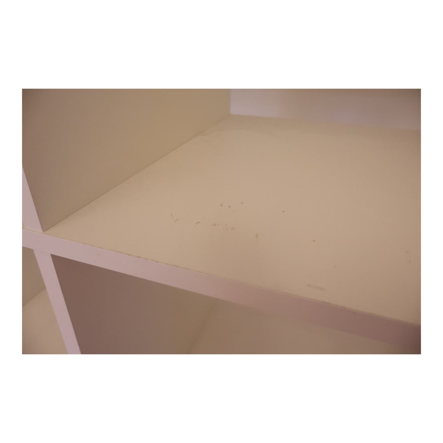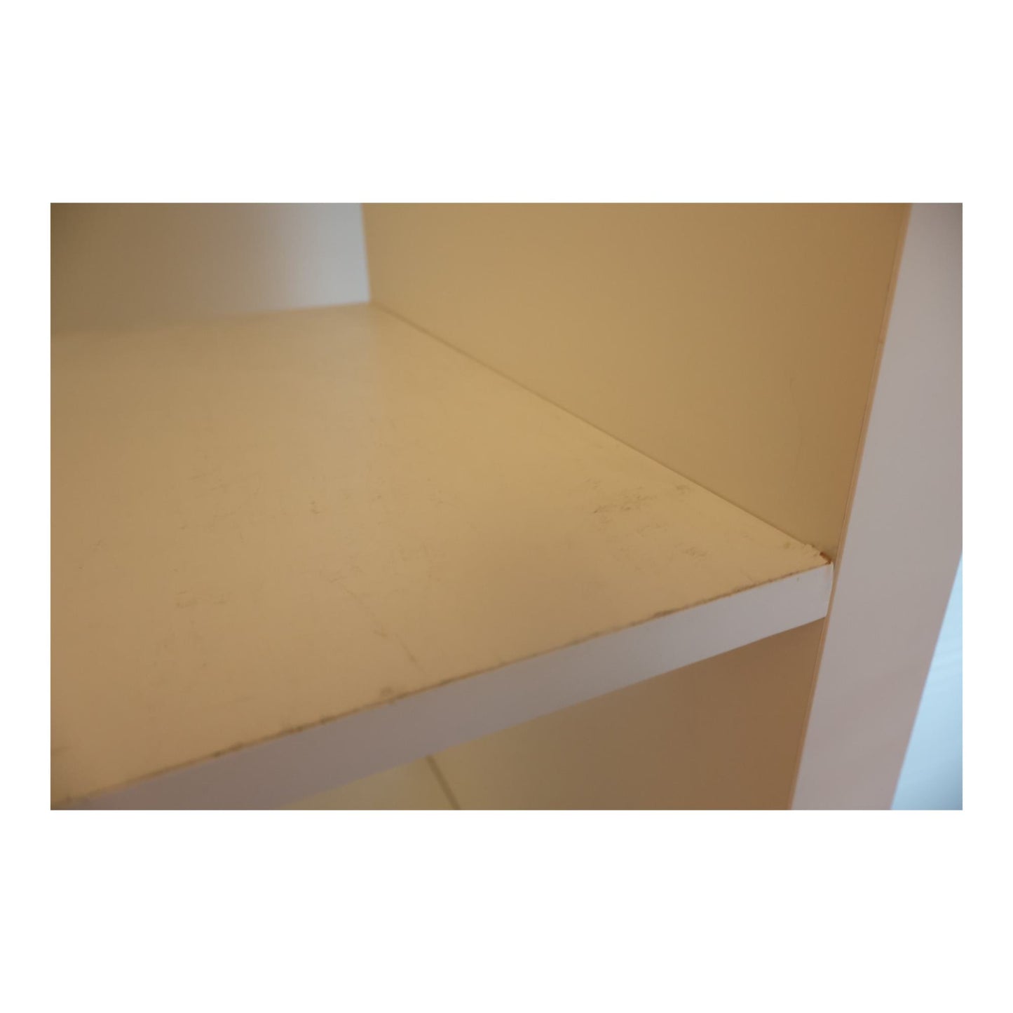 Noen skader på kantene og innsiden av hyllene, men helheten er fortsatt funksjonell. Dårlig lys gjør at den ser noe gul ut, men fargen på hyllen er hvit.