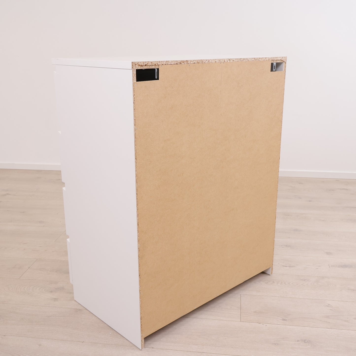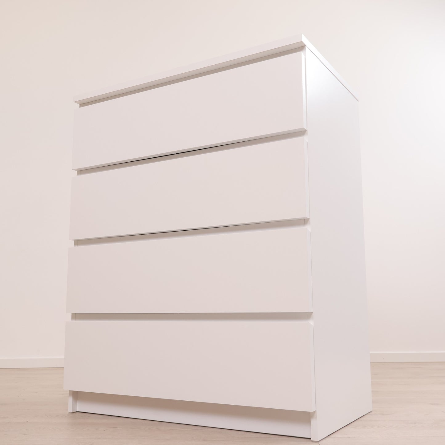 Moderne og stilren IKEA Malm kommode i hvit, perfekt for kontoret eller soverommet. Den har fire glatte skuffer som gir rikelig med oppbevaringsplass, samtidig som den tilfører et rent estetisk uttrykk til rommet.