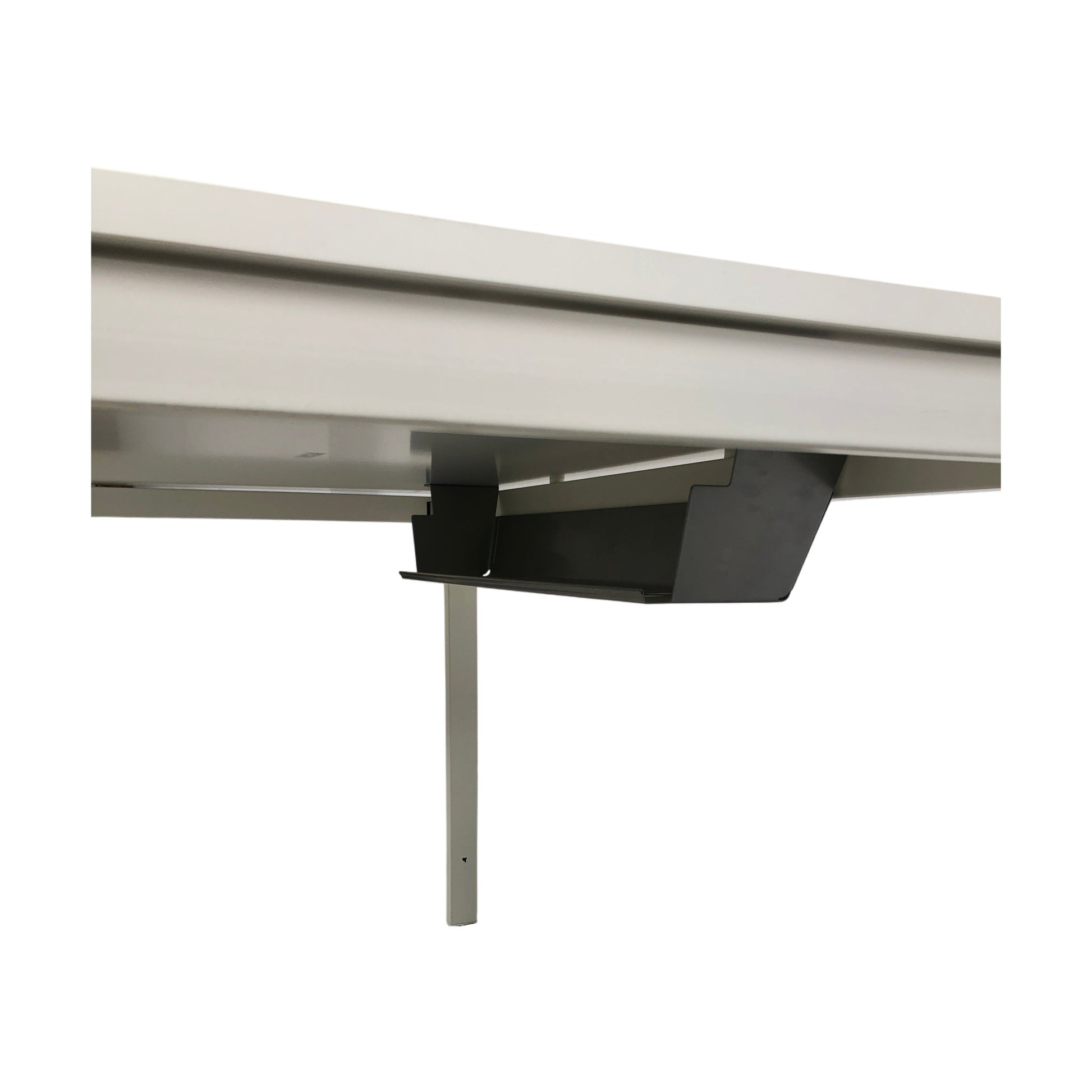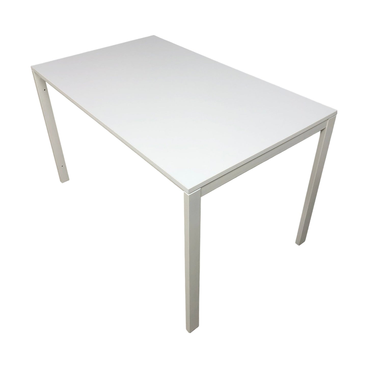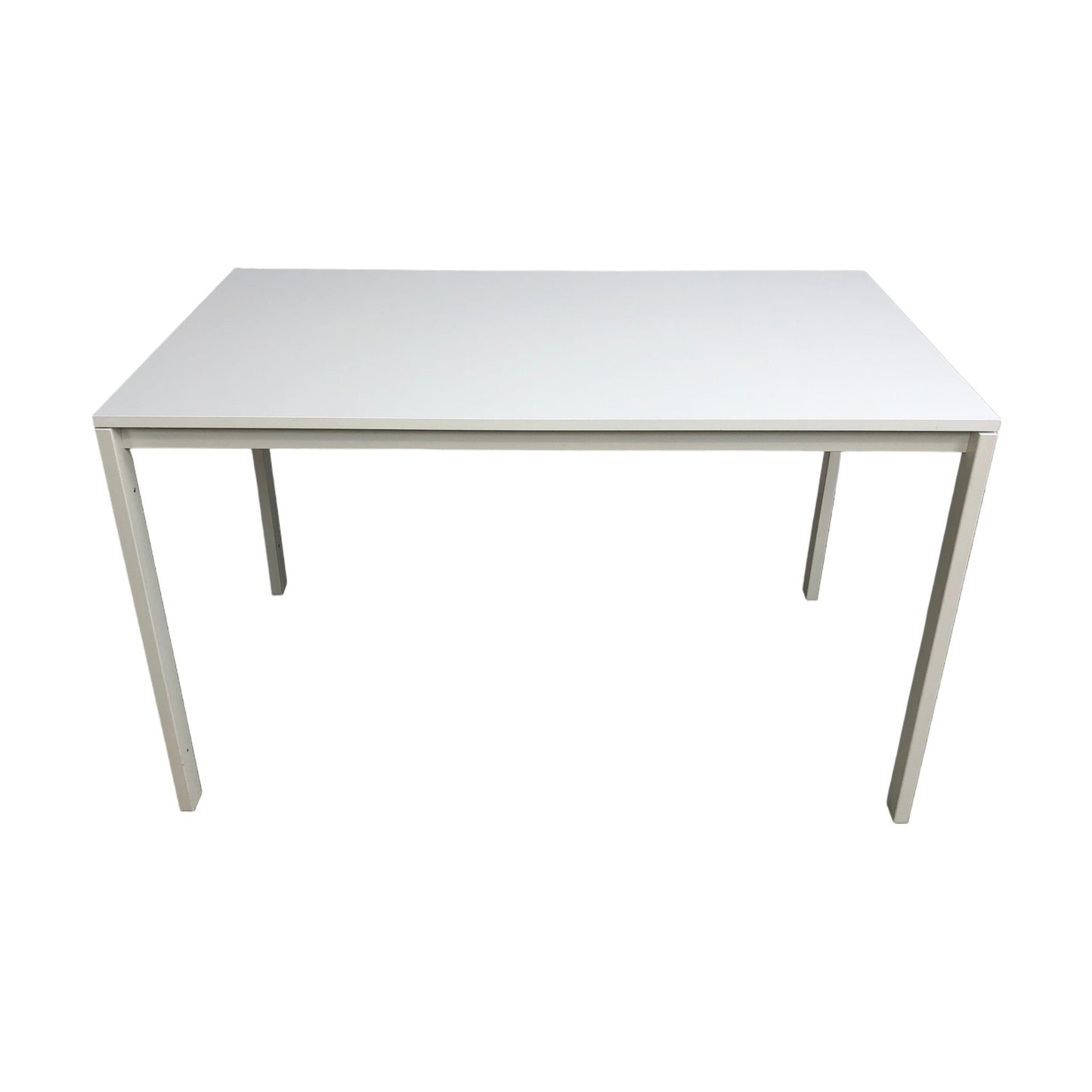 Enkelt skrivebord fra IKEA Meltorp med en stilren helhvit finish og praktisk kabelkurv på undersiden for organisert ledningshåndtering. Dette skrivebordet passer perfekt til hjemmekontoret eller arbeidsplassen, og gir et rent og funksjonelt uttrykk. Det kan også brukes som et møtebord.