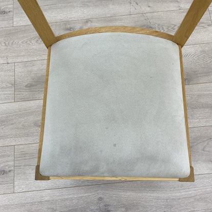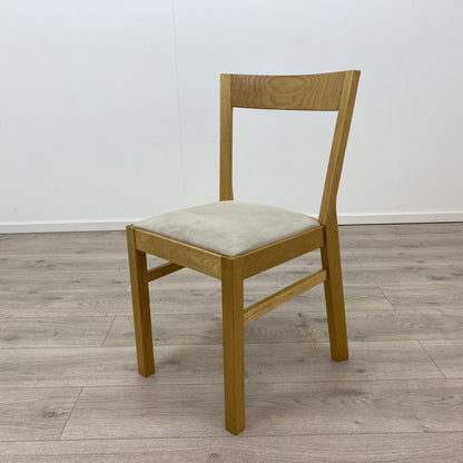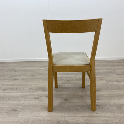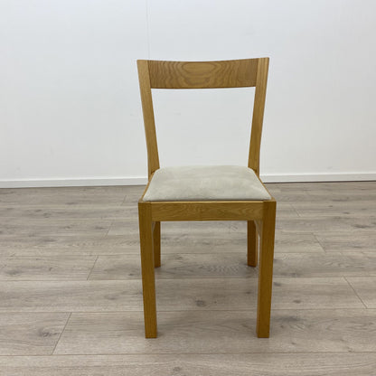 ROGER spisestoler med polstret sete og lav ryggstøtte. Farge og materiale: Gul massiv bjørk, beiset og lakkert med klar akryllakk. Hvite trekk på setene av fløyel materiale. Lite bruksmerker.