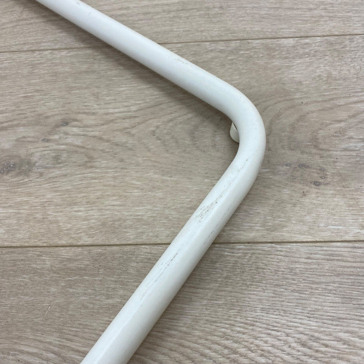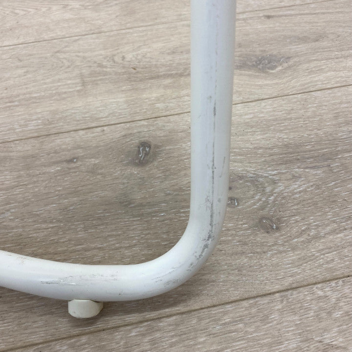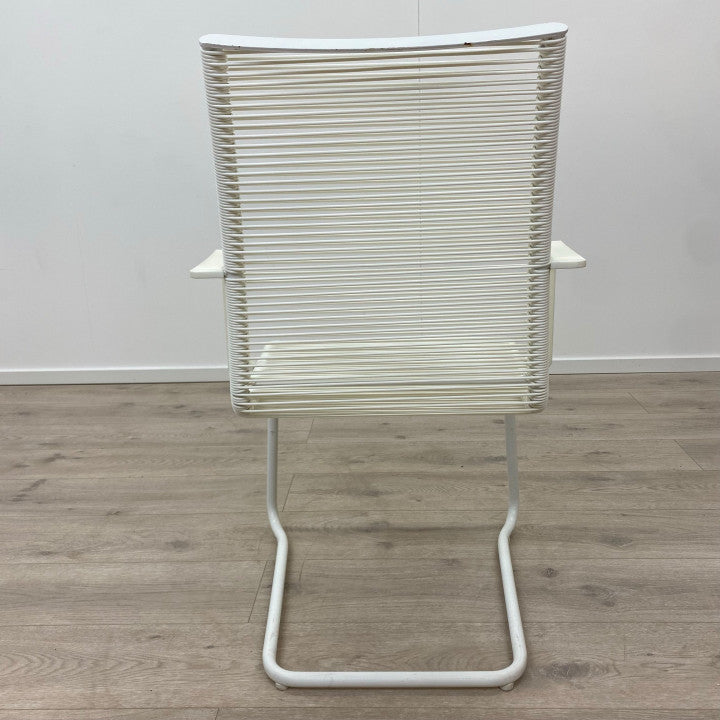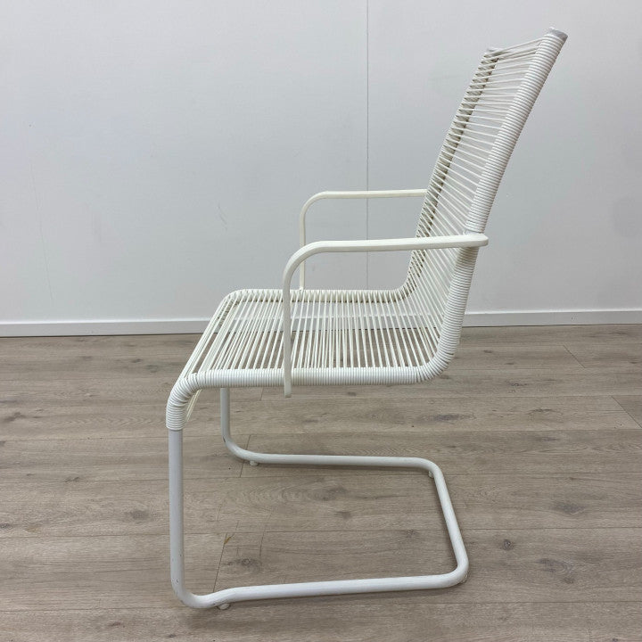 Stablebare IKEA VÅSMAN utendørs stoler med armlener i fargen hvit. Normale bruksmerker