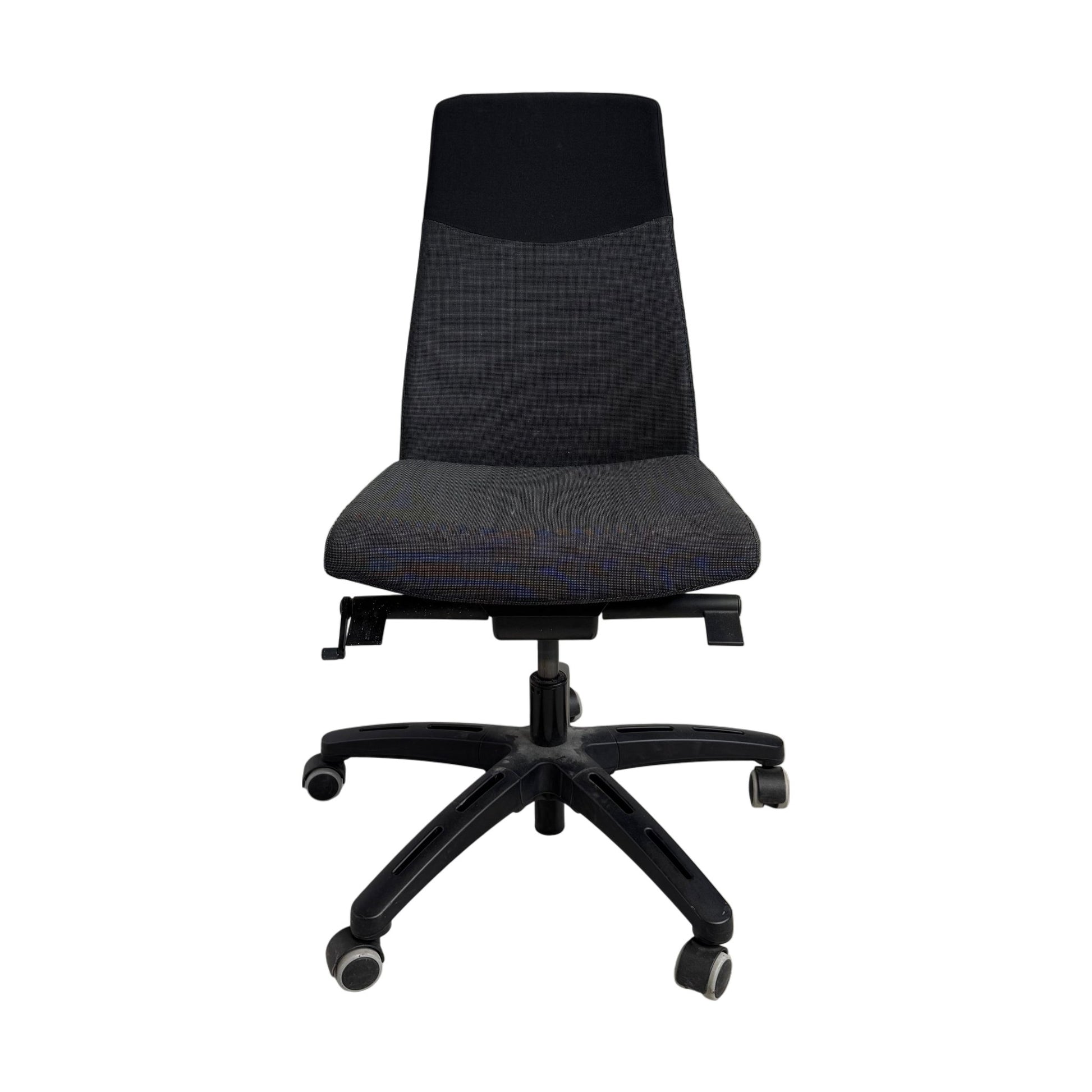Stolen er i god stand, med noen mindre bruksmerker. Hev/senk-funksjonen av setet er noe treg, men dette påvirker ikke bruken, og den gir fortsatt god støtte og komfort. Perfekt for deg som ønsker et pålitelig møbel med enkel stil.