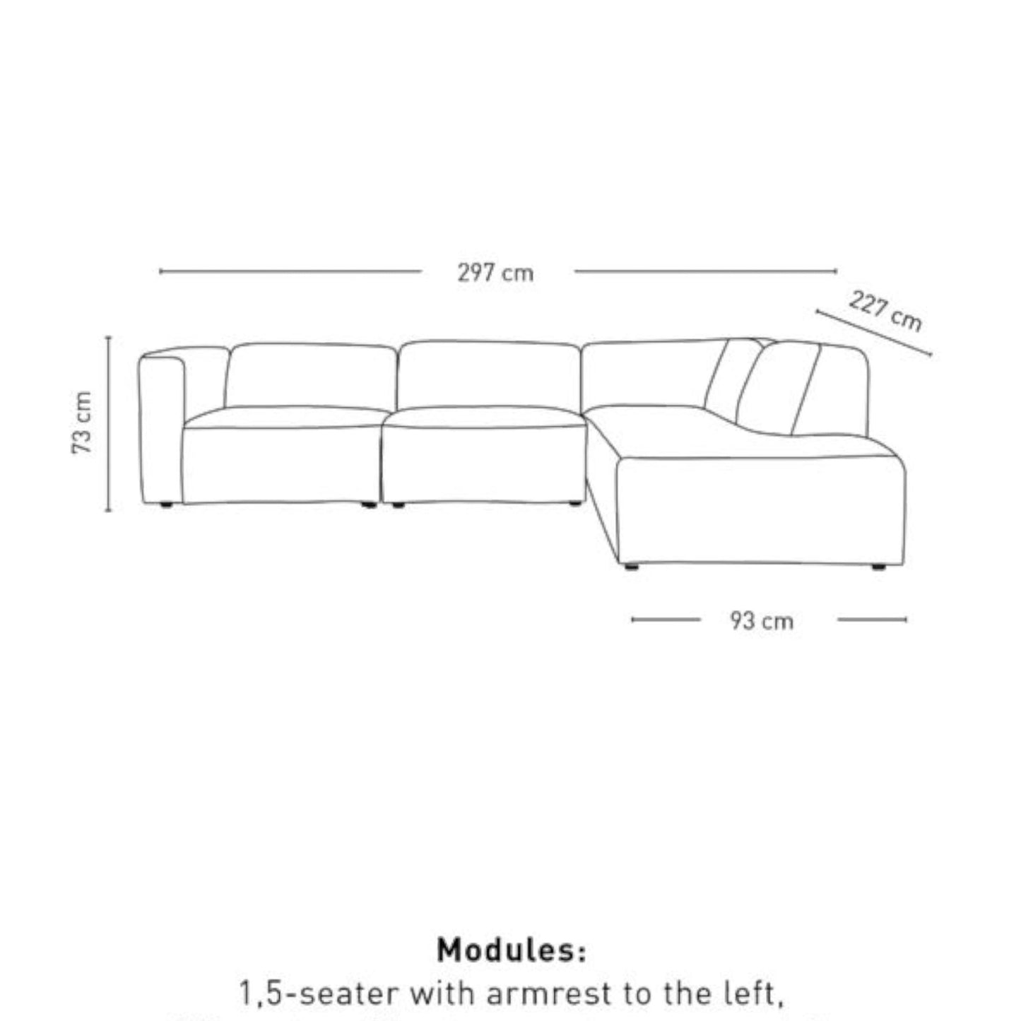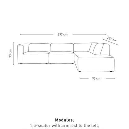 Den robuste utformingen med skjulte ben tilfører komfort i stilen, samtidig som sømmene strammer opp og gir sofamodulene et moderne preg. Modulsofaen er solid og består av materialer som gir god komfort og holder godt på fasongen. Den er bygget på en ramme av heltre furu og kryssfiner, som gir en stødig og holdbar kvalitet. Leveres med klips som holder modulene sammen.