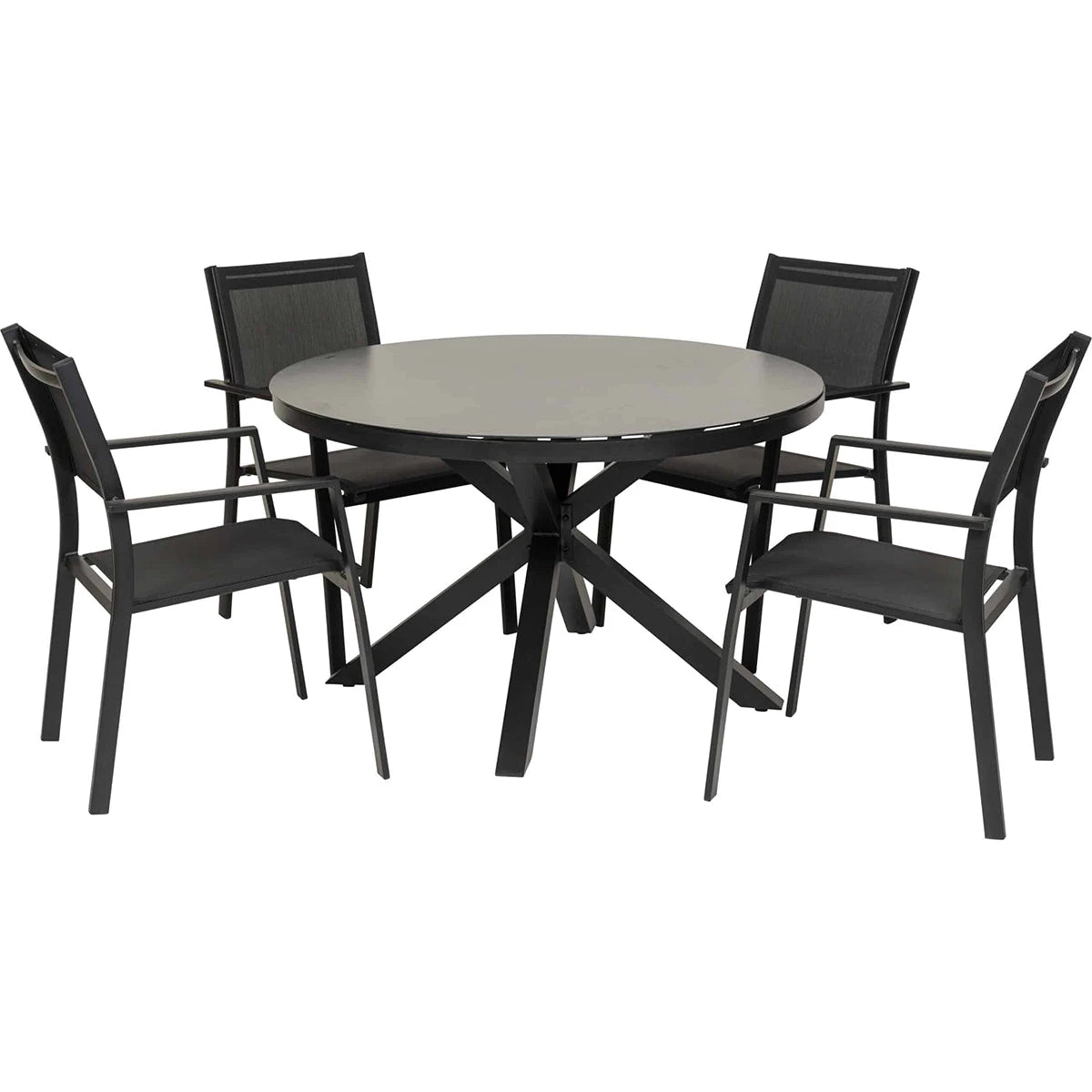 Jackson Spisebordets stilrene design og materialvalg gjør det til et ideelt valg for de som verdsetter både estetikk og praktisk bruk. Den sortlakkerte aluminiumsrammen sikrer lang levetid og motstand mot vær og vind, mens glassplaten med grå 3D-print ikke bare er vakker å se på, men også enkel å rengjøre etter bruk.
