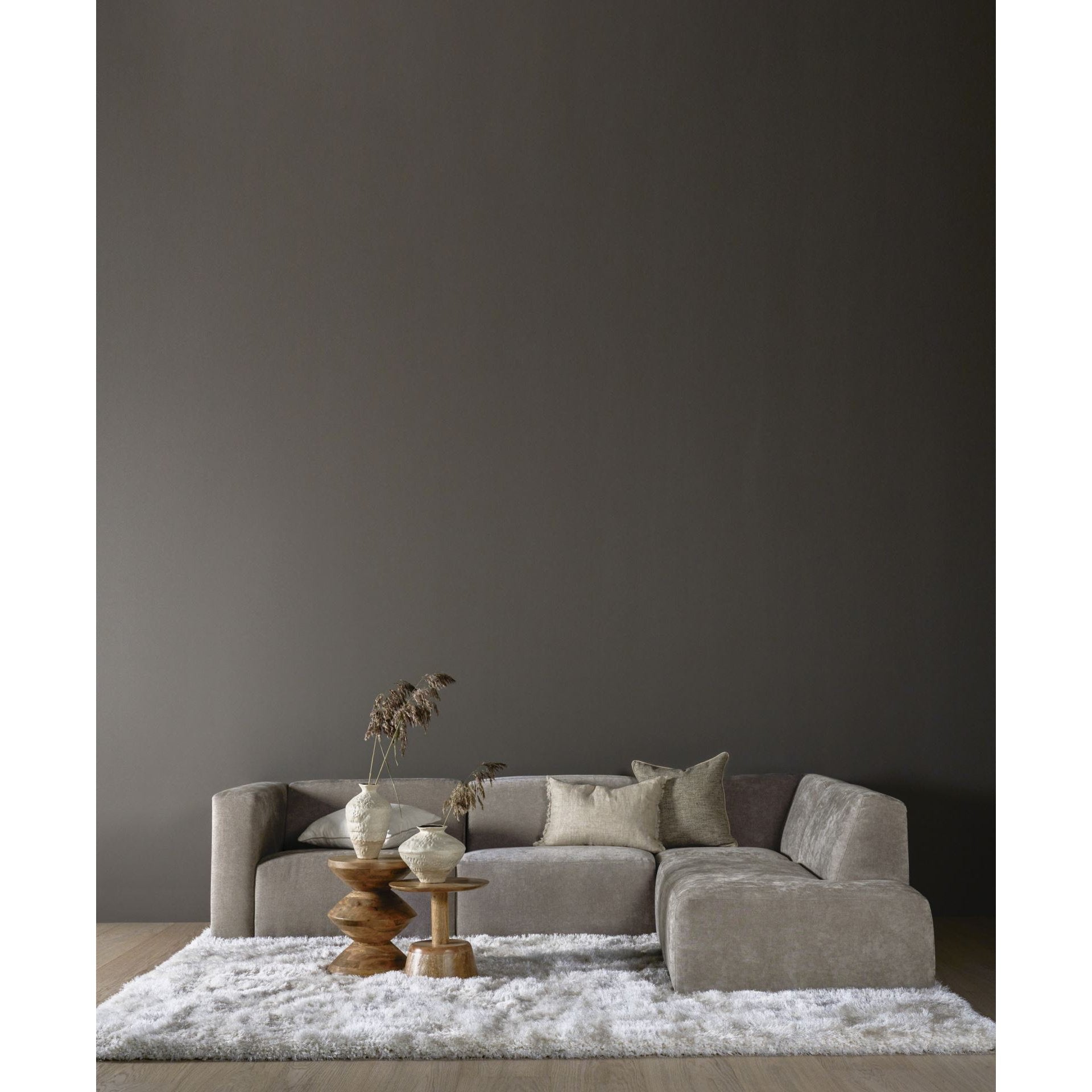 Modulsofaen Juno har en åpen høyre ende og er kledd i et stilrent grått tekstil som gir en moderne og innbydende følelse. Med sin robuste, men myke form, passer denne sofaen perfekt inn i både stue og kontor. Den solide konstruksjonen av heltre furu og kryssfiner sikrer holdbarhet og langvarig komfort. Sofaens design er minimalistisk, med skjulte ben som gir et rent uttrykk. Den er lett å vedlikeholde, og trekbindene gir enhver plass et stilfullt blikkfang.