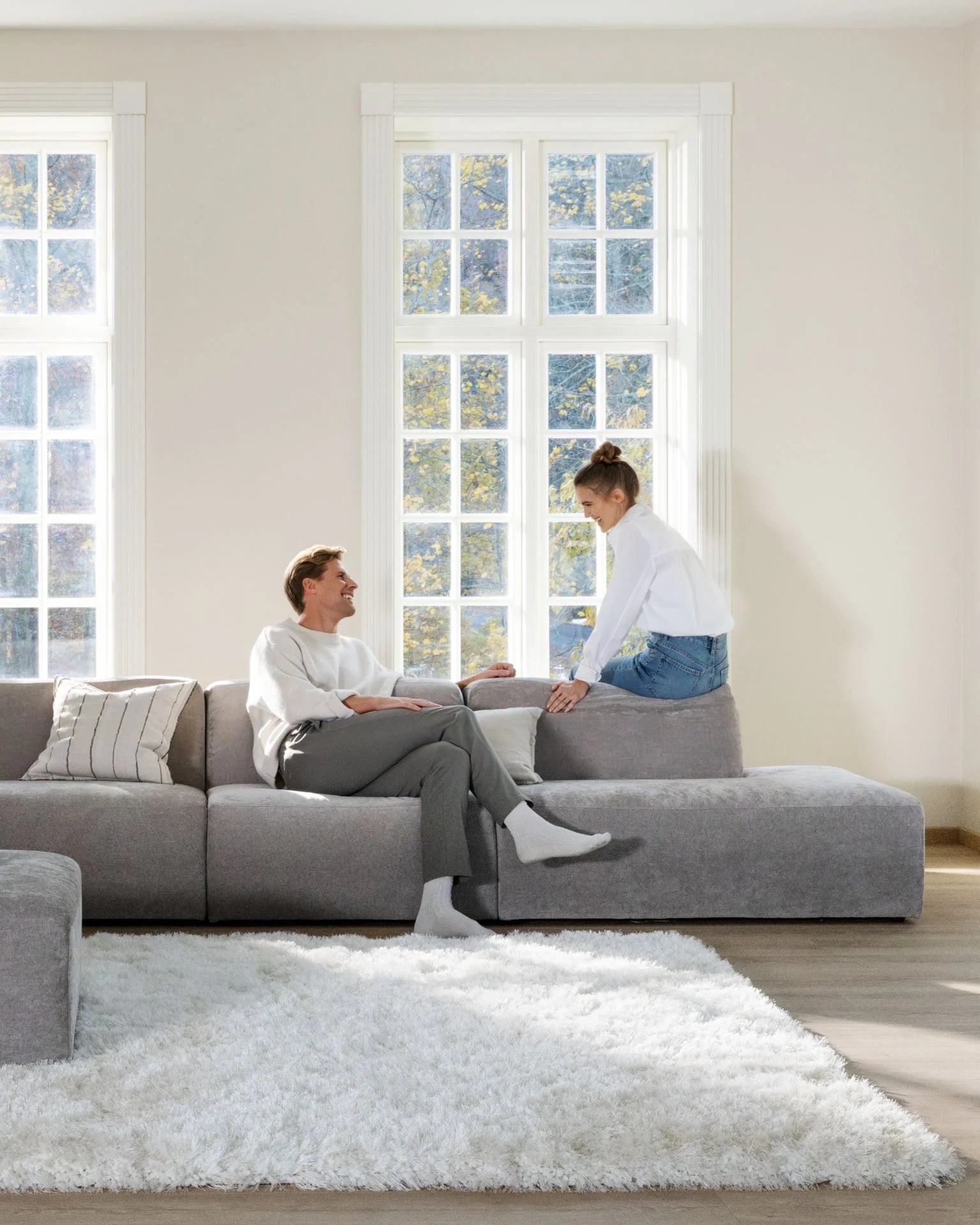 Trendy og svært komfortabel modulsofa i et slitesterkt tekstil. Plasseringen av ende og sjeselong på sofaen beskrives ut ifra hvordan du ser sofaen forfra. Venstre ende eller sjeselong er på venstre side når du står foran sofaen, og tilsvarende for høyre side.