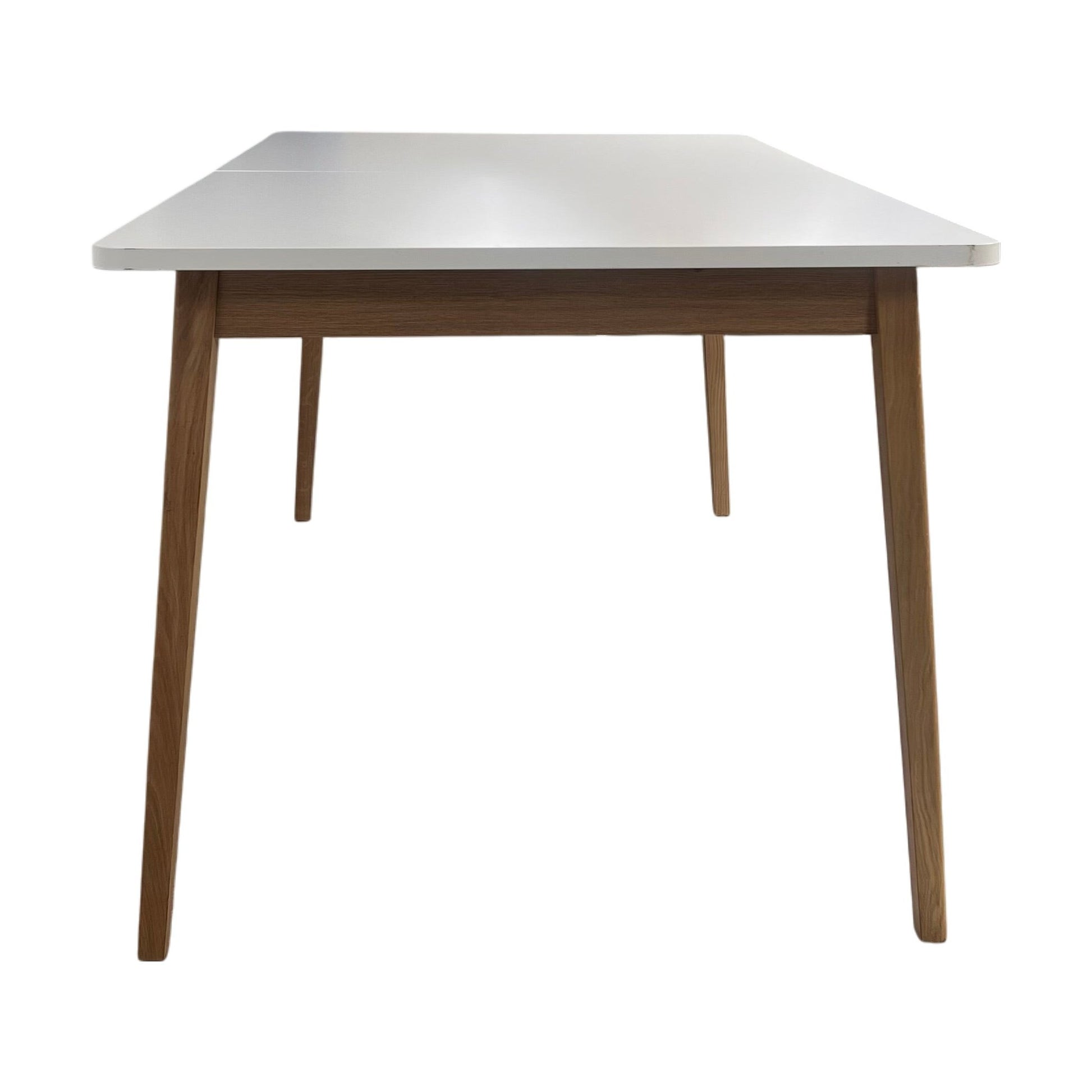 Justerbart spisebord som enkelt kan tilpasses fra 160 cm til 200 cm, perfekt for både små og større rom. Bordplaten i laminat med hvit finish gir et moderne preg, mens bena i eik tilfører varme og naturlighet til bordet. Ideelt som samlingspunkt for måltider eller sosiale sammenkomster.