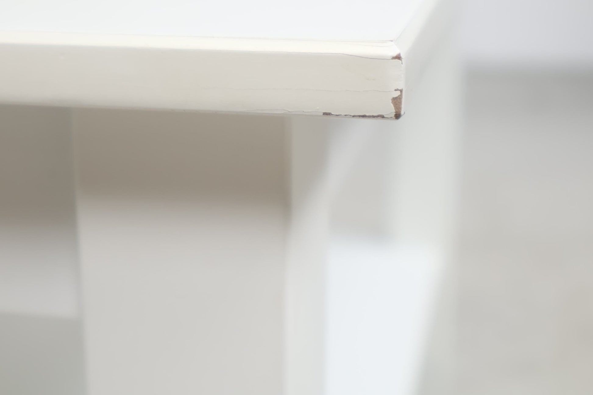 Det er enkelte mindre bruksmerker, inkludert et lite hakk i det ene bordbeinet. Fortsatt i god stand og klar til bruk. Praktisk og elegant løsning. Rask levering tilgjengelig.