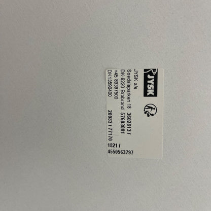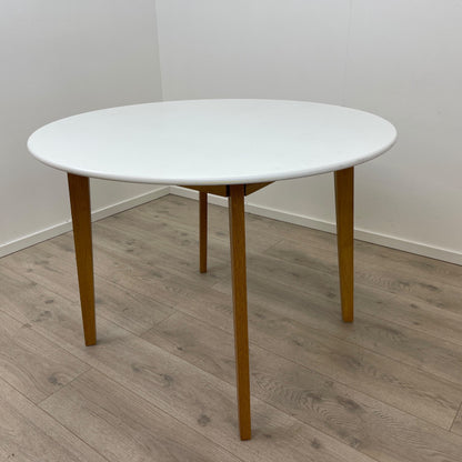JYSK Rundt spisebord i hvit farge Bordet har en rund fasong og enkel stil. Trebena som står i kontrast til den helhvite bordplaten gir bordet særlig et preg av natur til det moderne designet. Farge og materiale: Hvit bordplate av spon- og trefiberplate med laminat. Understell med 4 ben av massiv tre. De originale skruene til bena manglet, de er skiftet ut med andre skruer slik at bordet står stabtilt slik det skal. Normal bruksslitasje på bordplaten.