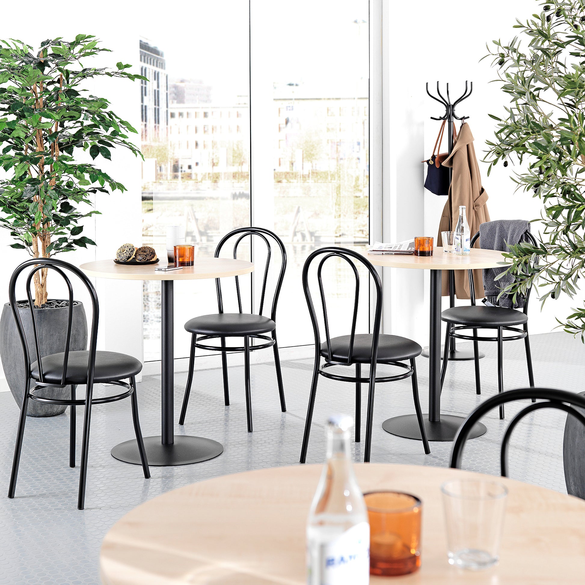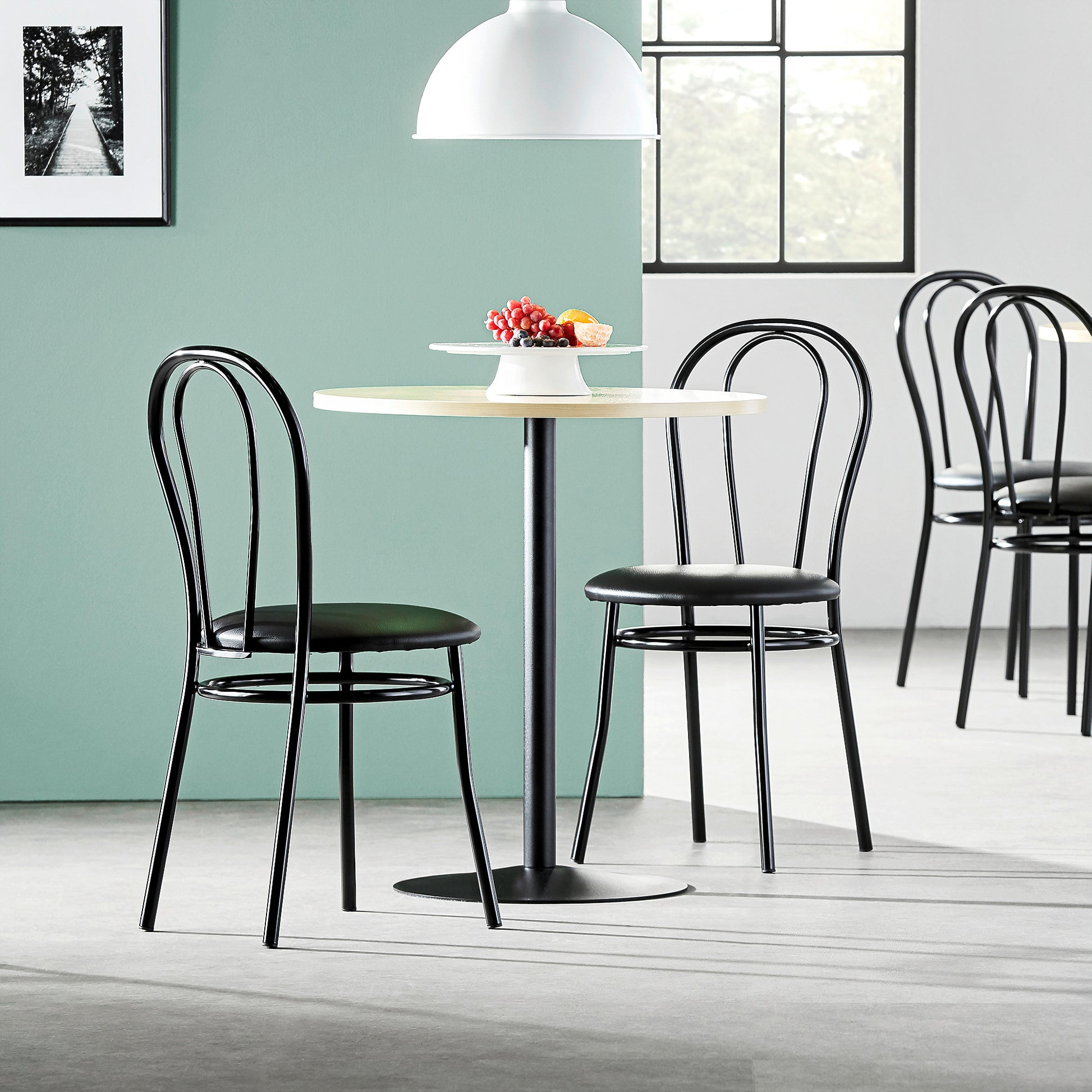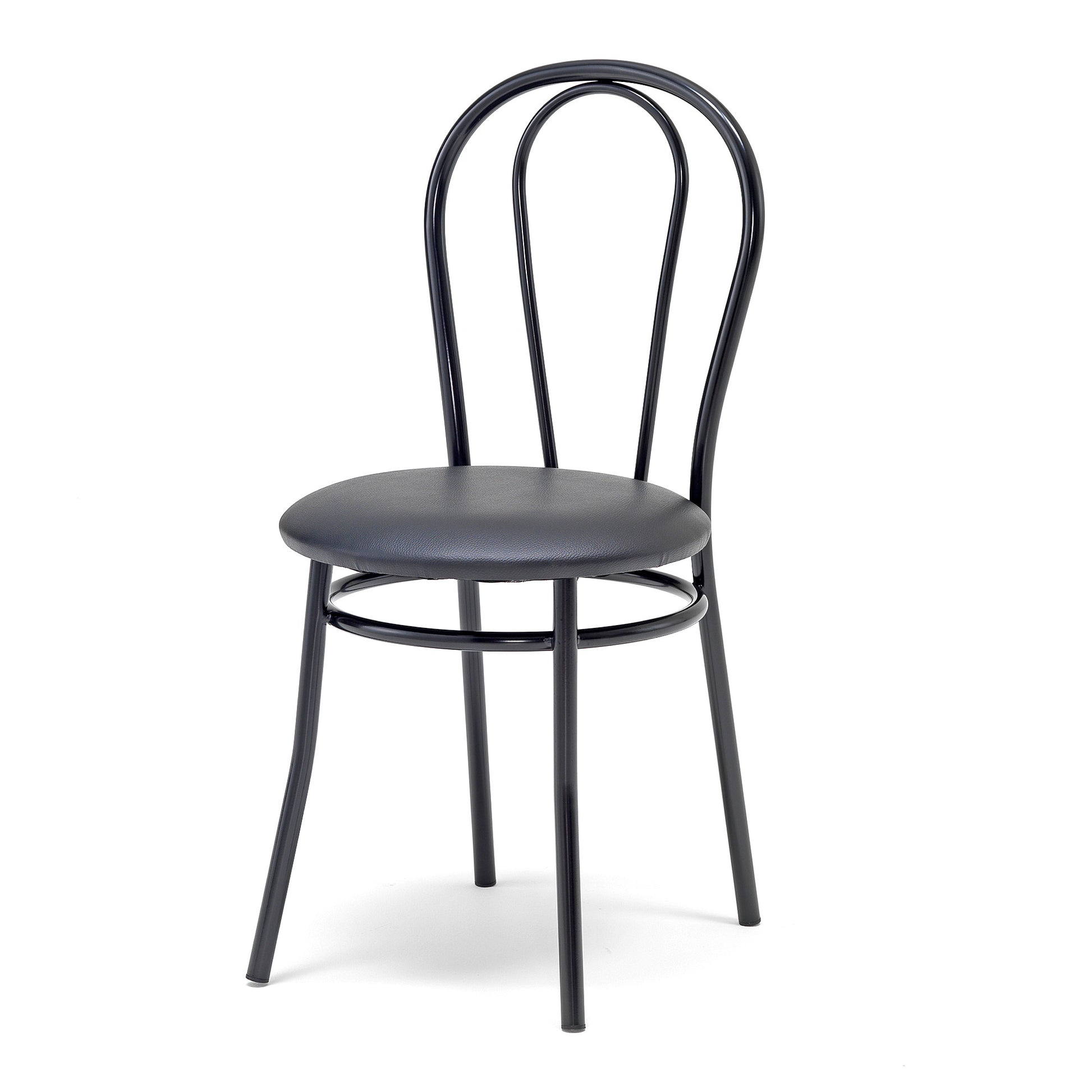 Kaféstol MIRABEL fra AJ Produkter kombinerer et stilrent design med funksjonalitet. Med stativ av pulverlakkerte stålrør og et polstret sete trukket i slitesterkt vinyltrekk, tilbyr stolen både komfort og et elegant uttrykk. Den svarte fargen gir et tidløst preg, noe som gjør denne stolen velegnet for både kafeer, møterom og kontor.