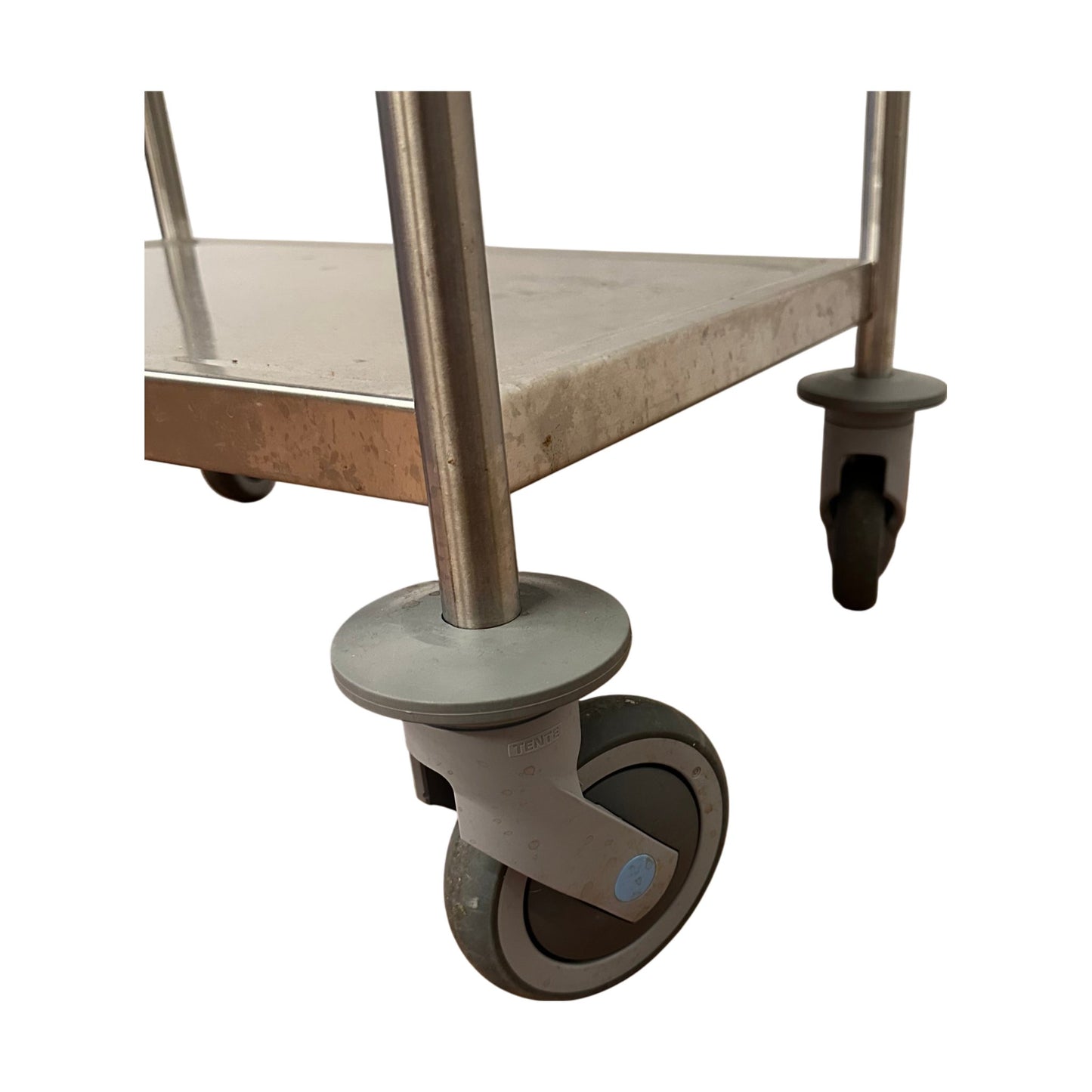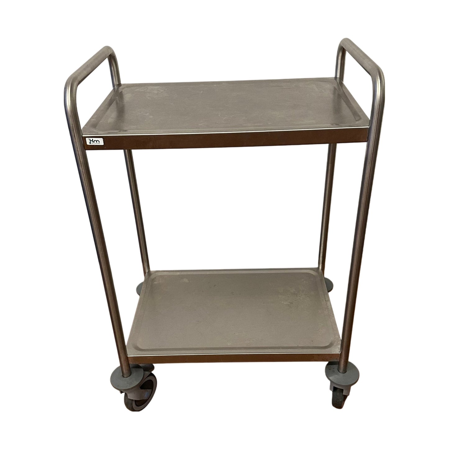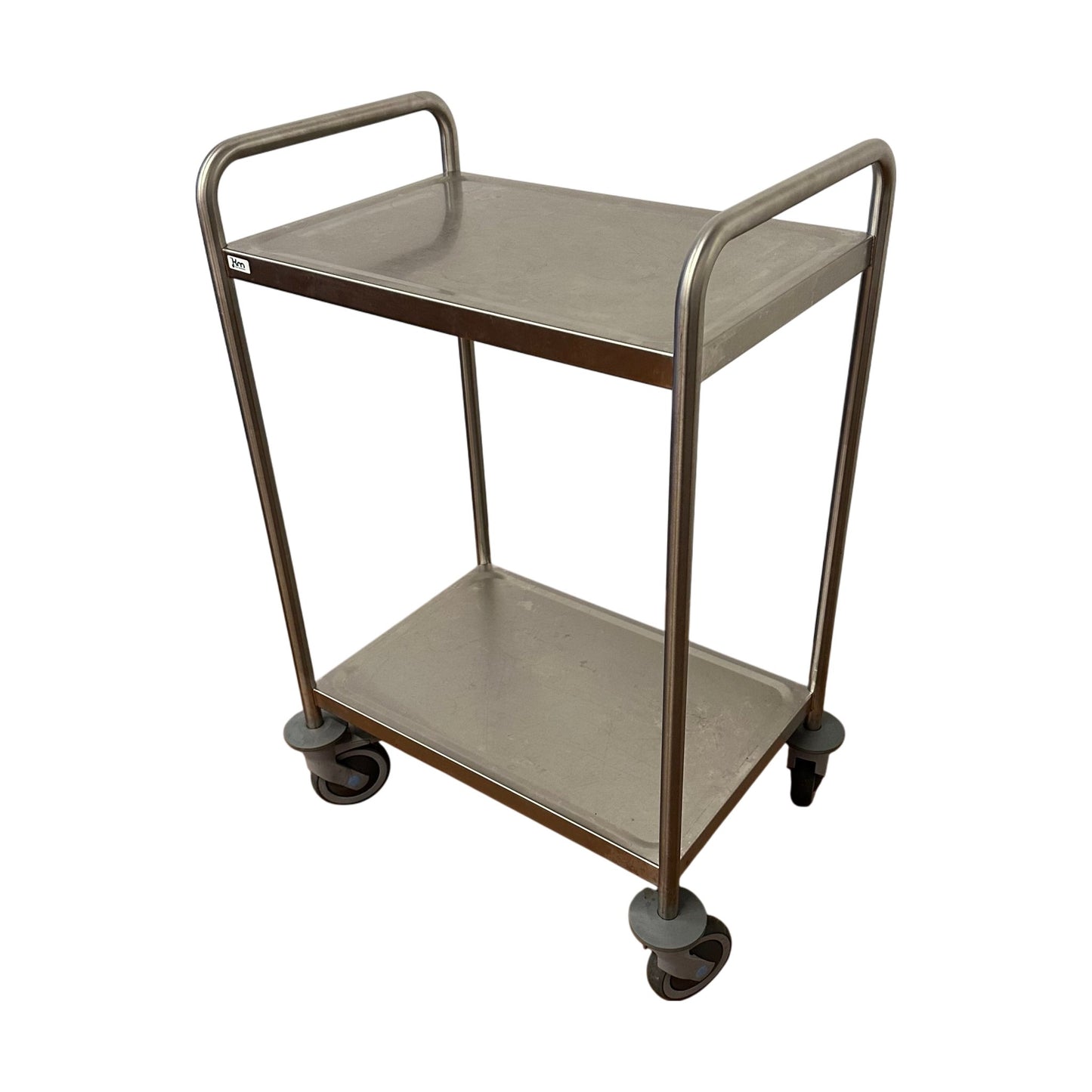 Praktisk vogn fra AJ Produkter i rustfritt stål med to helsveisede hyller og fire svingbare hjul, hvorav to har brems. Denne vognen er perfekt for miljøer med strenge hygienekrav, og den er enkel å rengjøre.