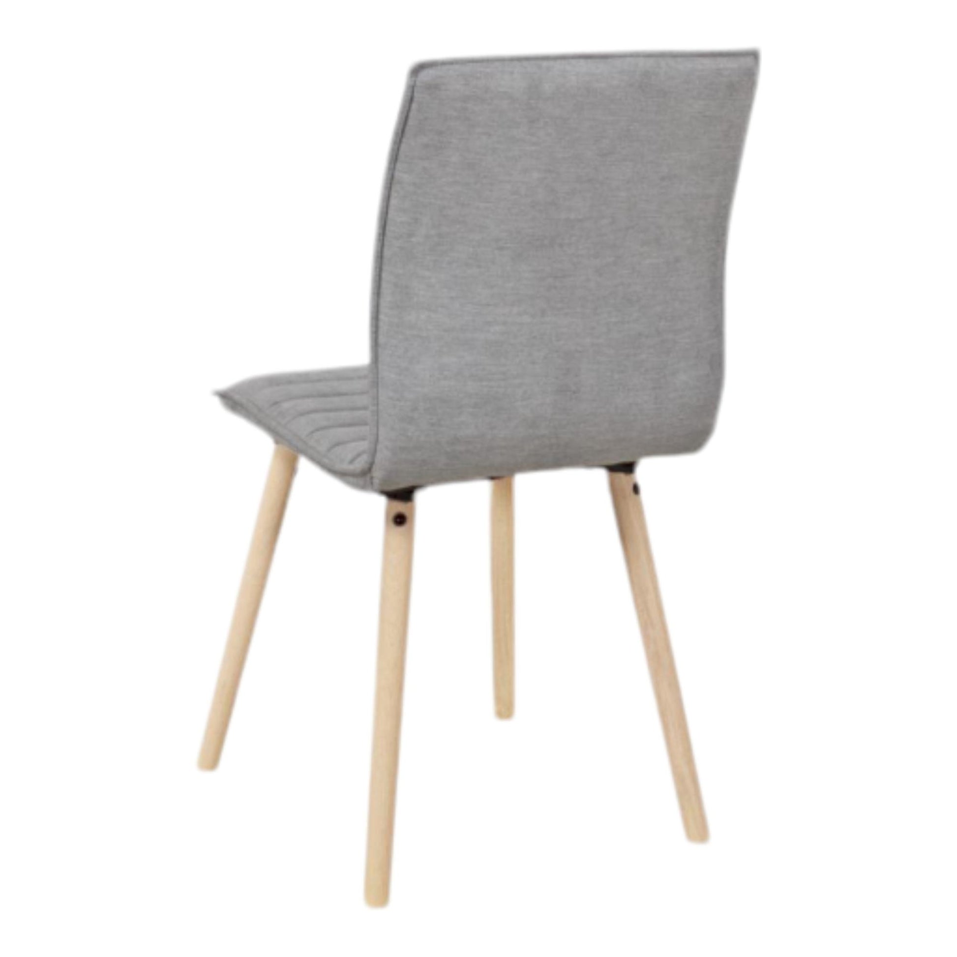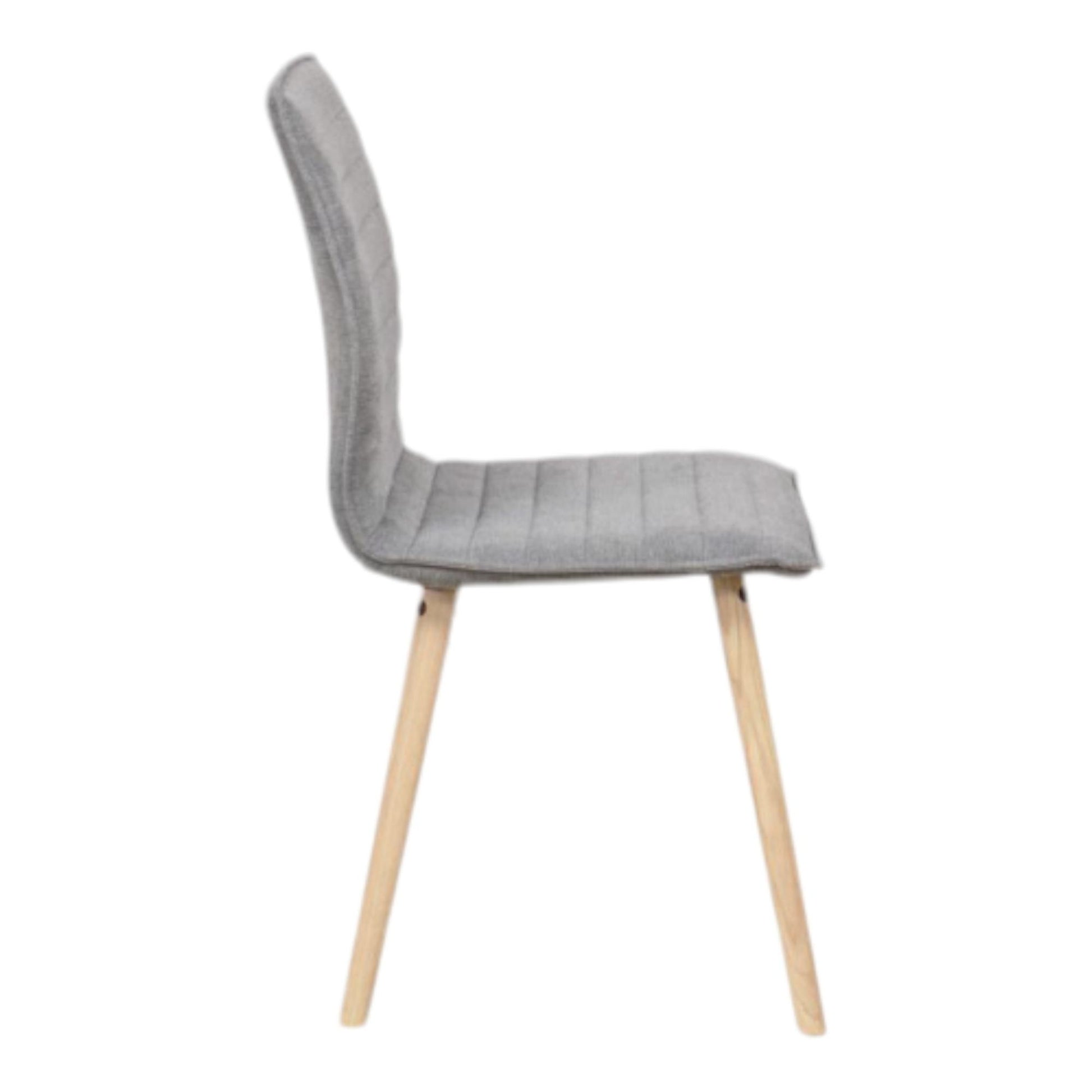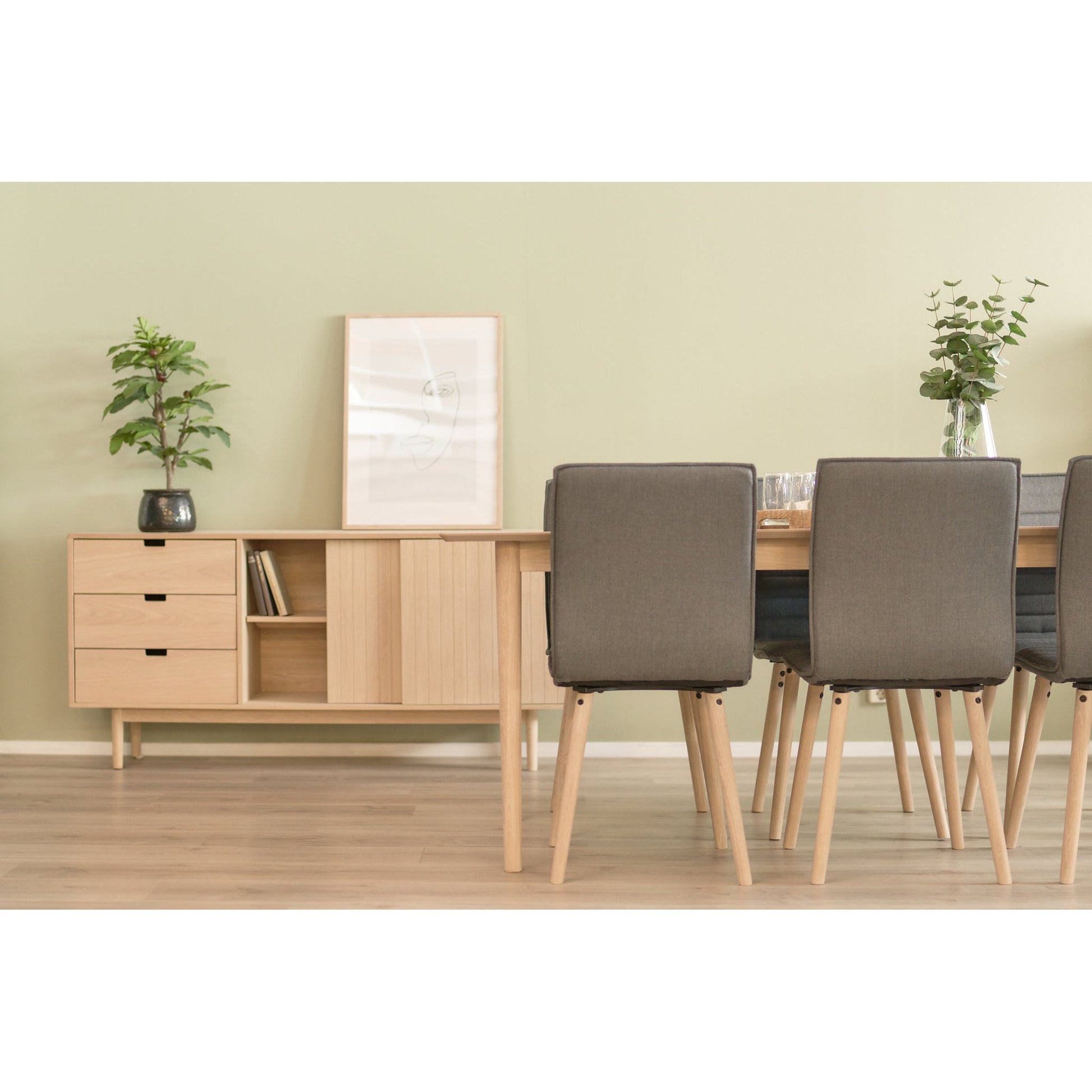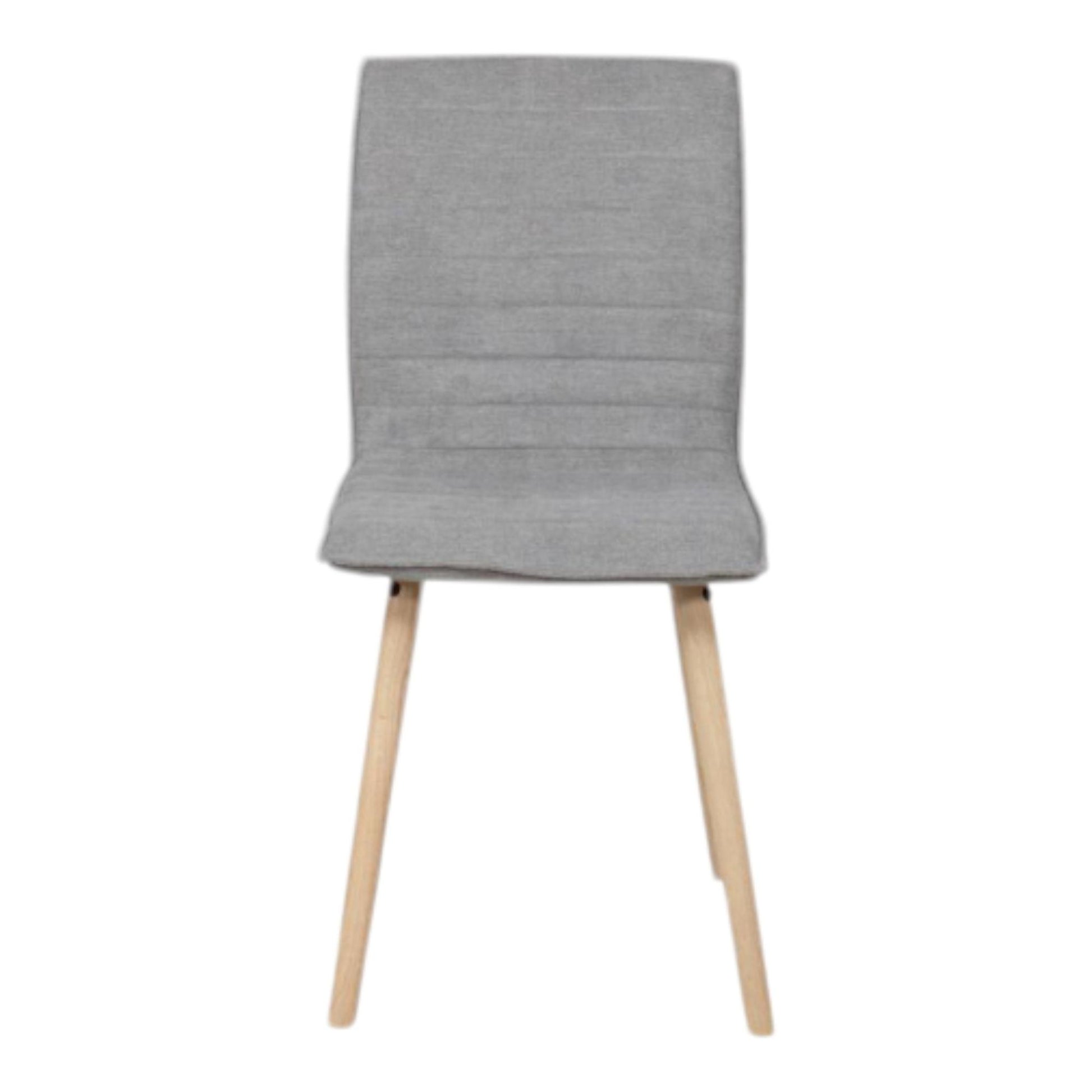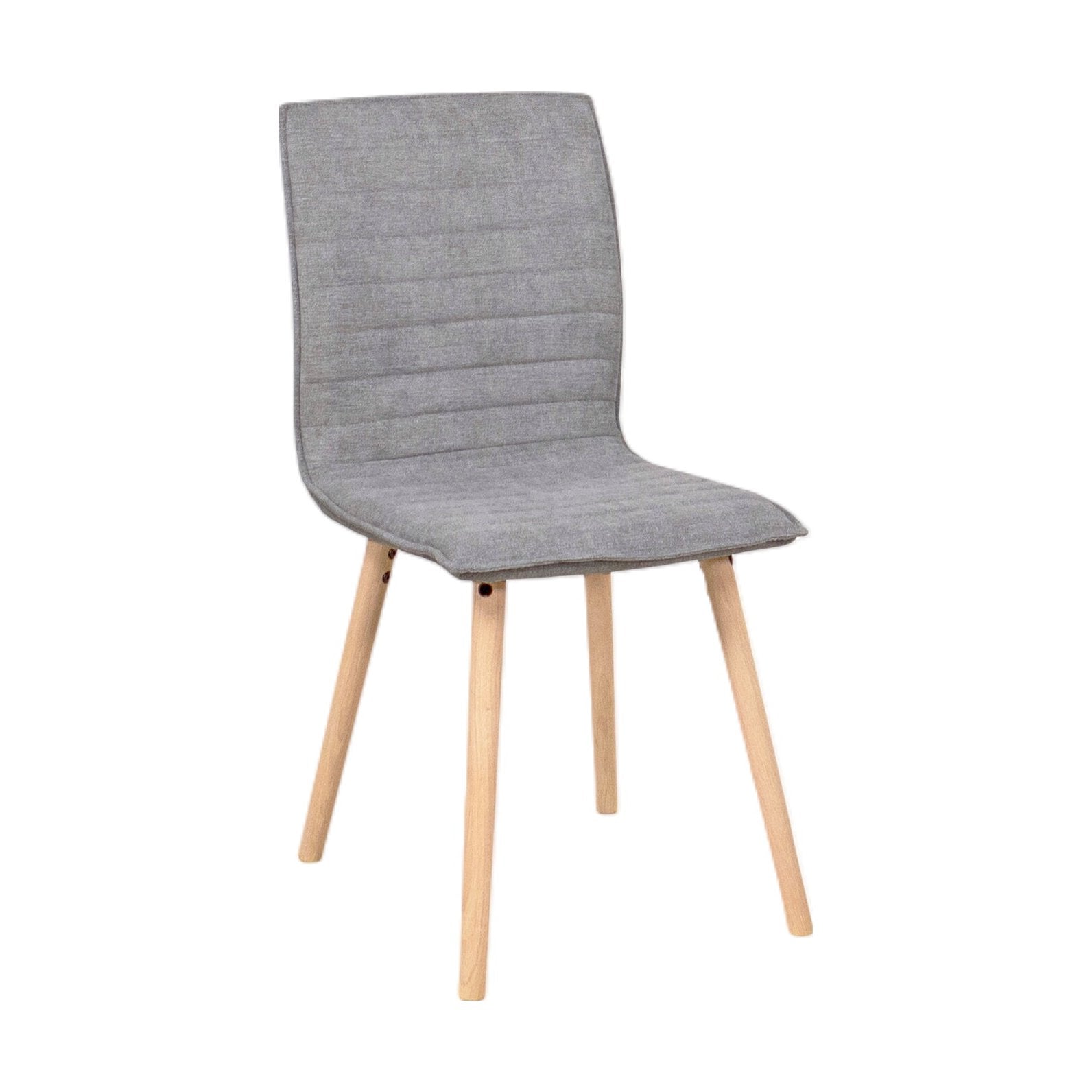 Spisestol med mørk grått trekk og ben i hvitoljet eik. Den stilrene utformingen gir stolen et moderne preg som passer inn i de fleste interiører. Den polstrede sitteflaten gir god støtte, mens ryggpartiet er utformet for å støtte deg på en behagelig måte.