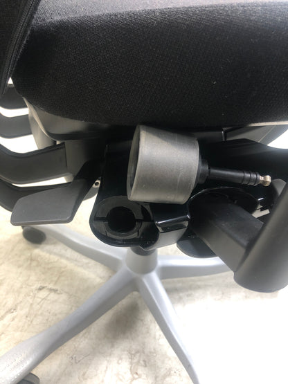 Den ene funksjonen som justerer ryggvinkelen er defekt, som vist på bildet, men ryggen kan fortsatt justeres i høyden og lenes bakover. Stolen har små riper på fotkryssene, men dette er kun kosmetisk og påvirker ikke bruken. Ellers fremstår den i utmerket stand og gir en pålitelig sitteopplevelse.