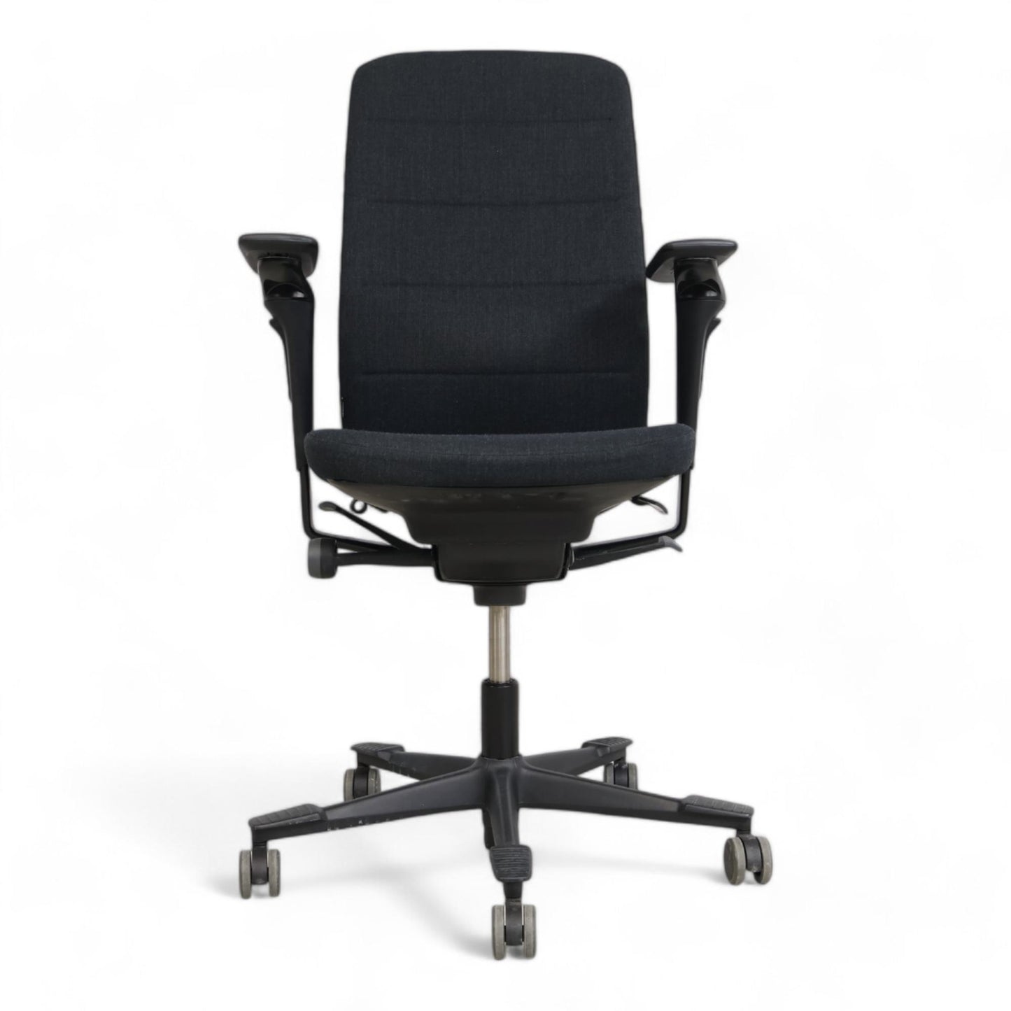 Kinnarps Capella kontorstol i mørk grå med justerbare armlener. Stolen gir god ergonomisk støtte, perfekt for lange arbeidsdager på kontoret.