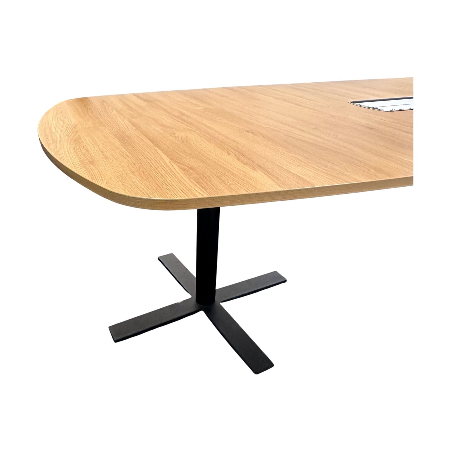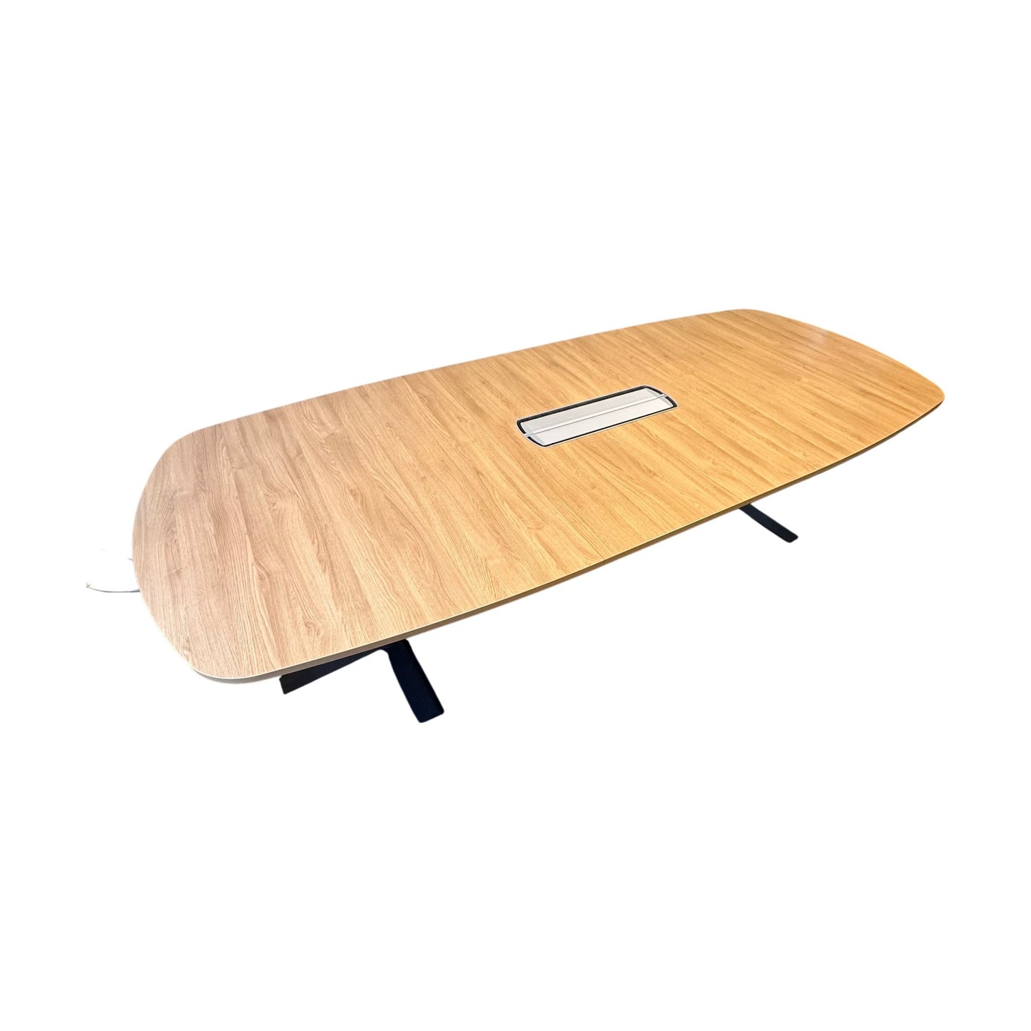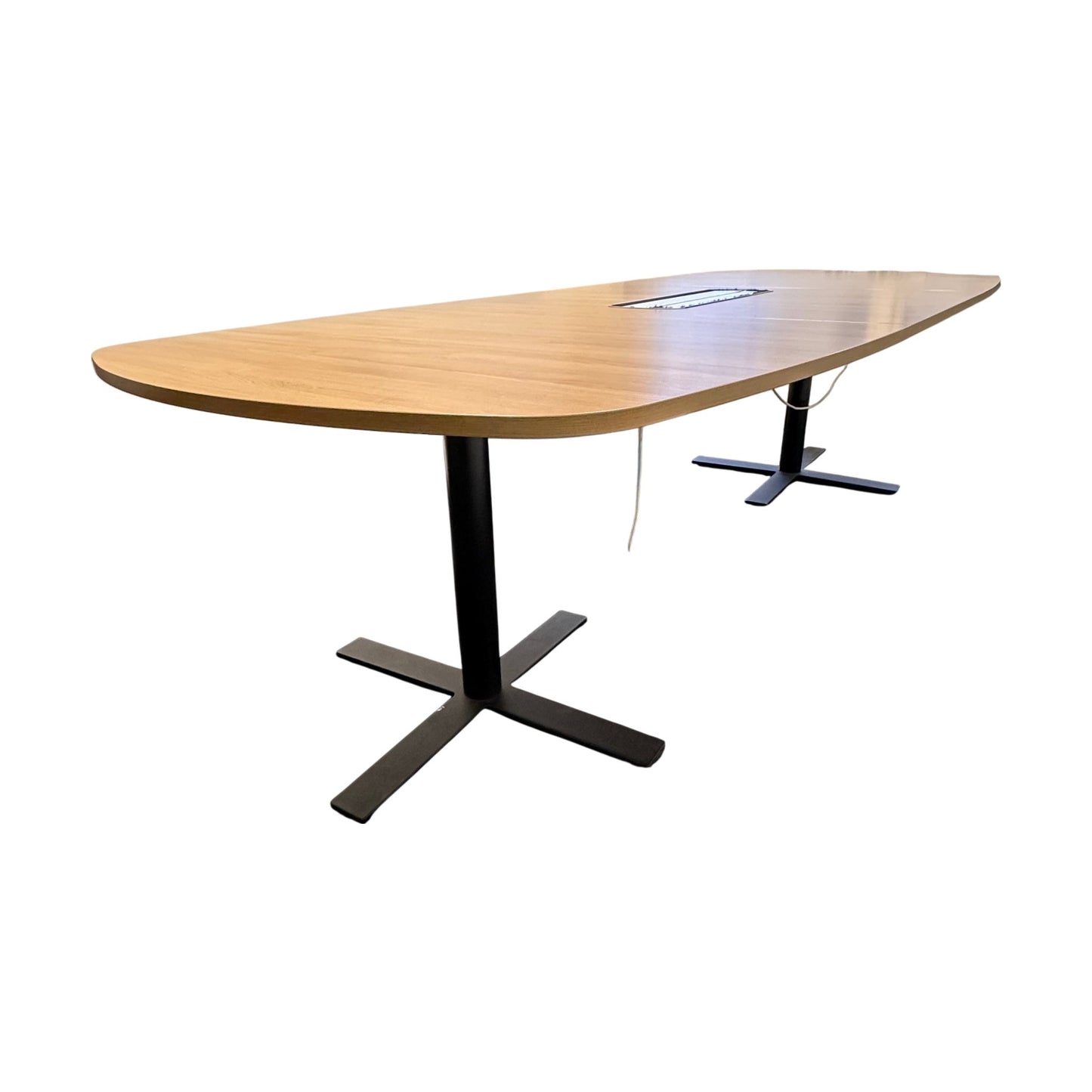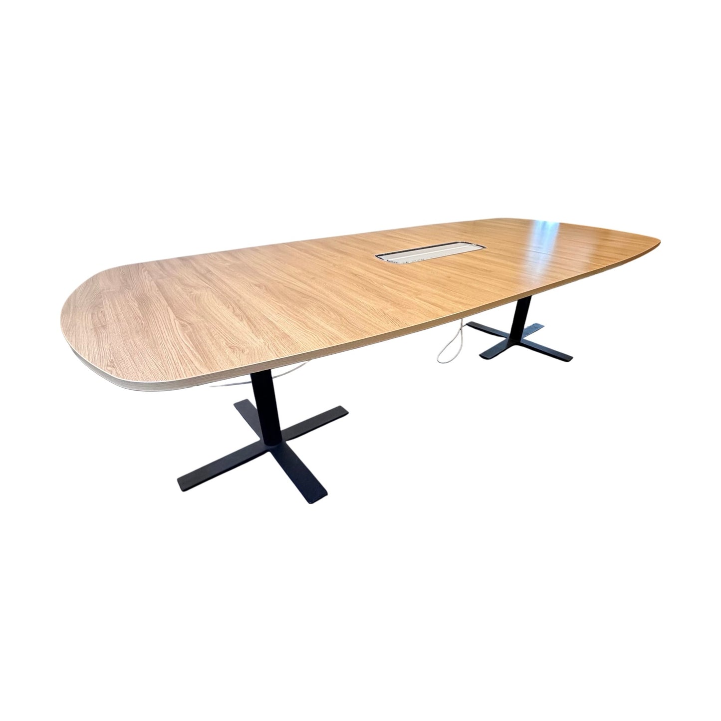 Elegant møtebord i trefarget design fra Kinnarps, dimensjonert 280x120 cm. Den naturlige trefinishen gir et varmt og innbydende preg, mens det moderne understellet i svart metall tilfører en stilren kontrast. Bordet er perfekt for møterom og kontorlandskap, og tilbyr rikelig med plass for mange deltakere.