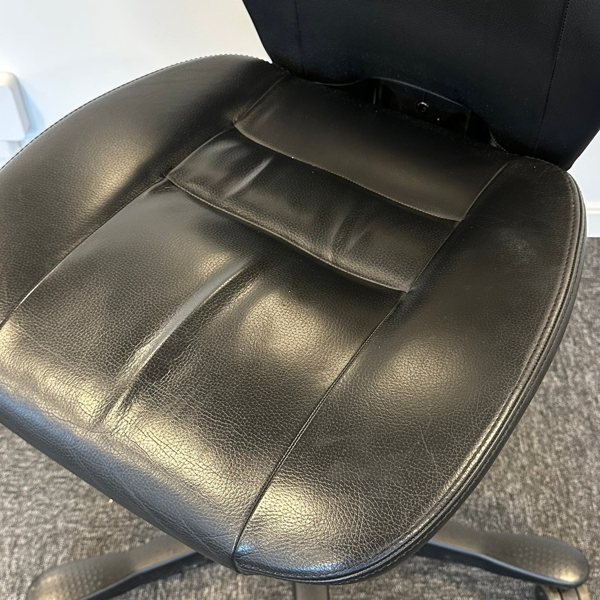 Kontorstol fra Kinnarps med en stilren og moderne design i sort skinn. Synchrone 8000 er utviklet for å gi utmerket komfort og støtte i en arbeidsdag, samtidig som den fungerer godt i både kontormiljøer og hjemme.