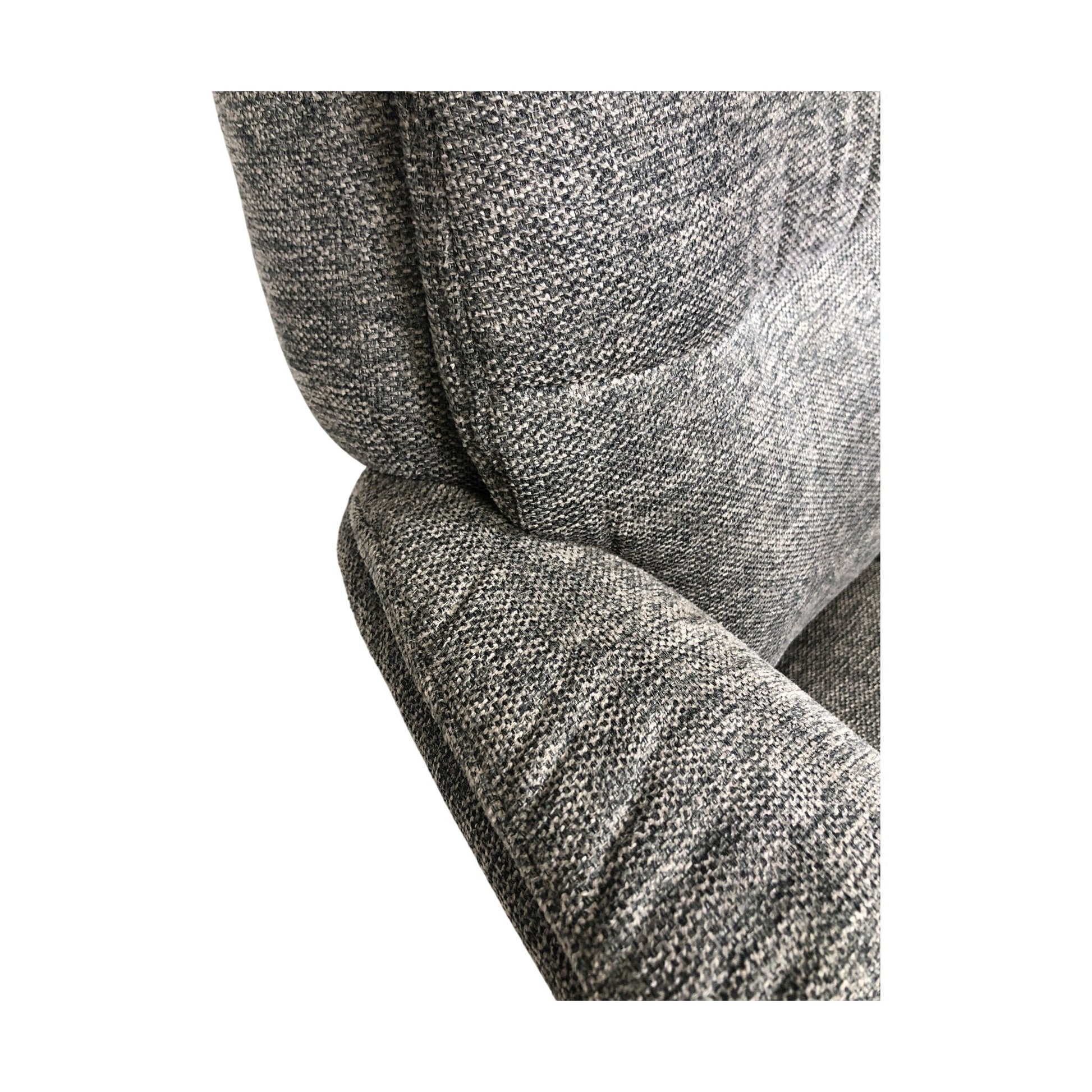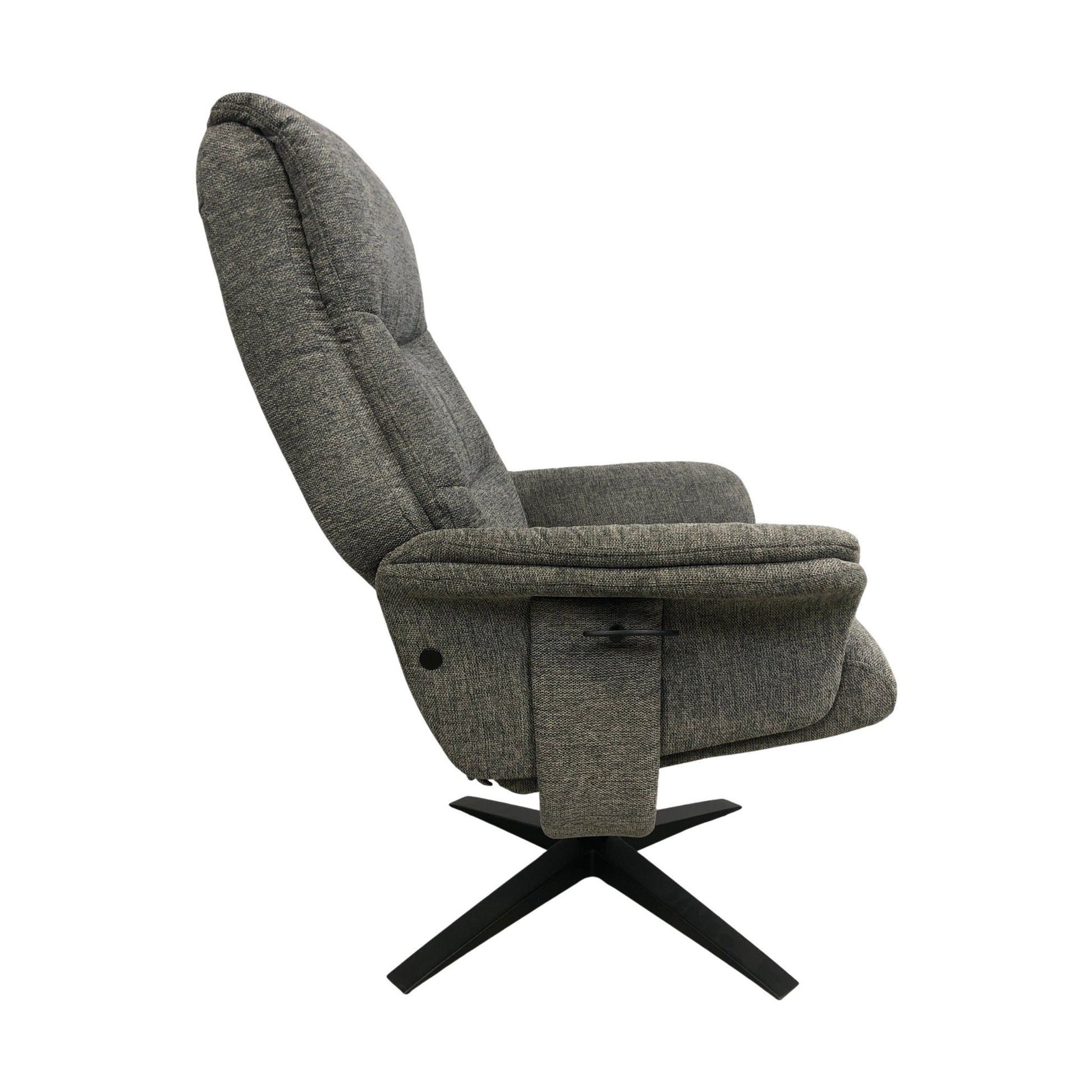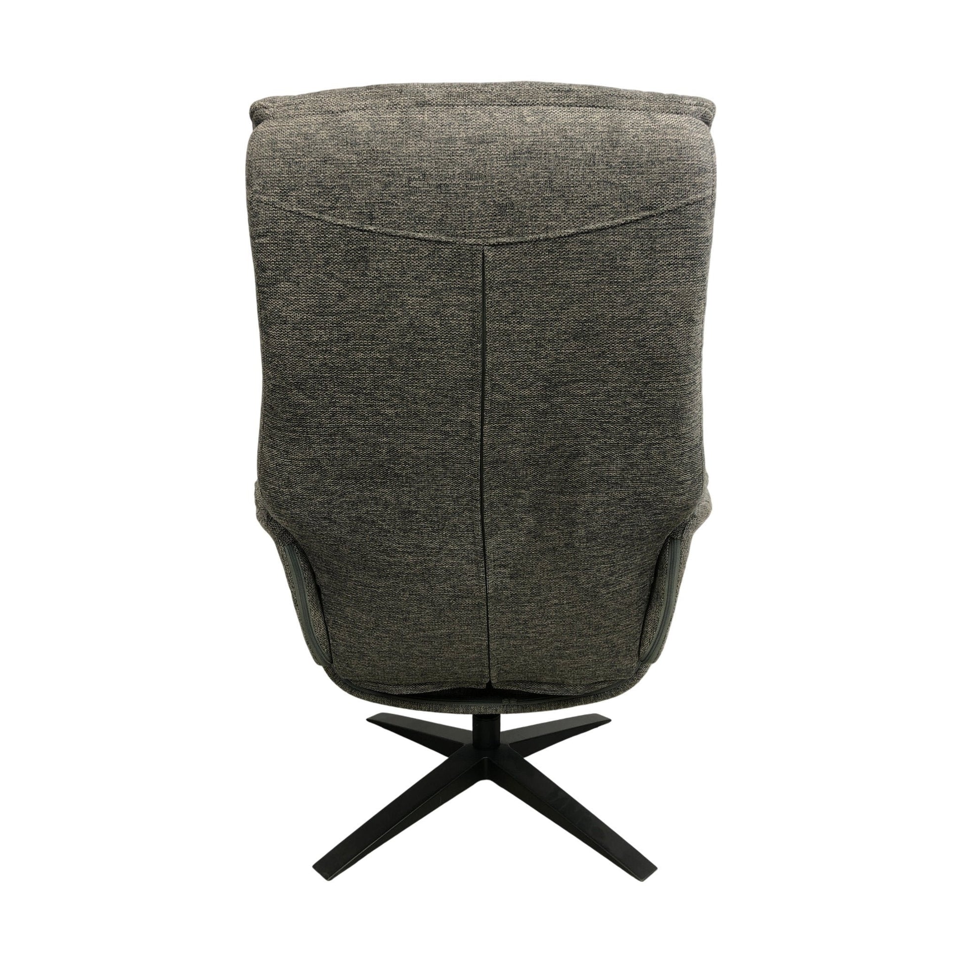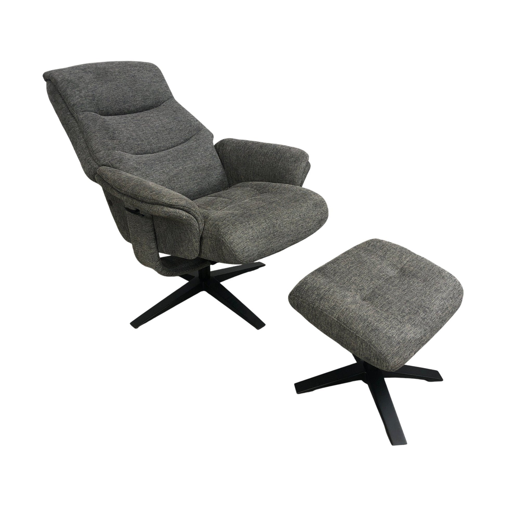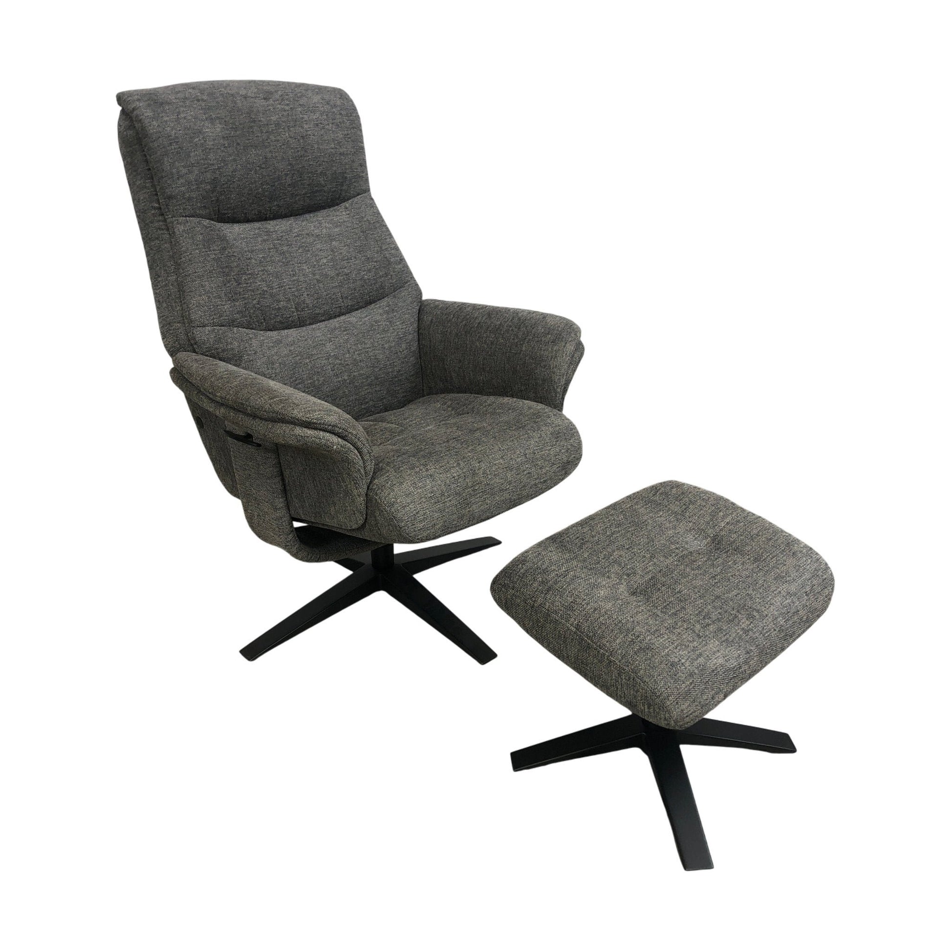 Klassisk Køln lenestol fra A-Møbler med tilhørende puff, designet for optimal komfort og stil. Den grå tekstilen gir et tidløst og stilrent preg, som integreres lett i ulike interiørstiler. Ryggen på stolen kan lenes bakover med en praktisk spak ved armlenet.