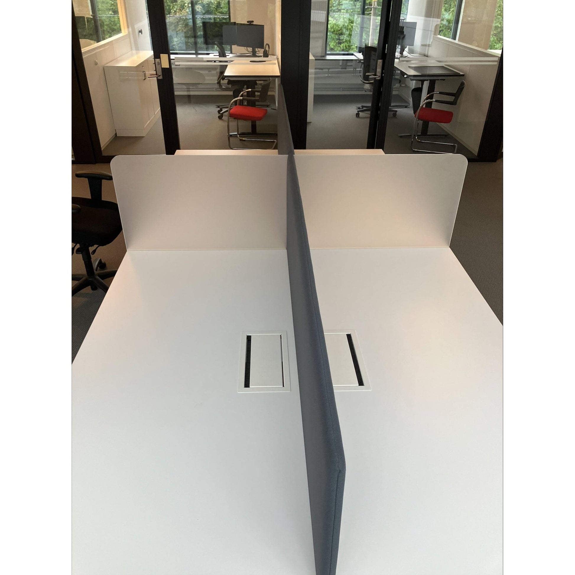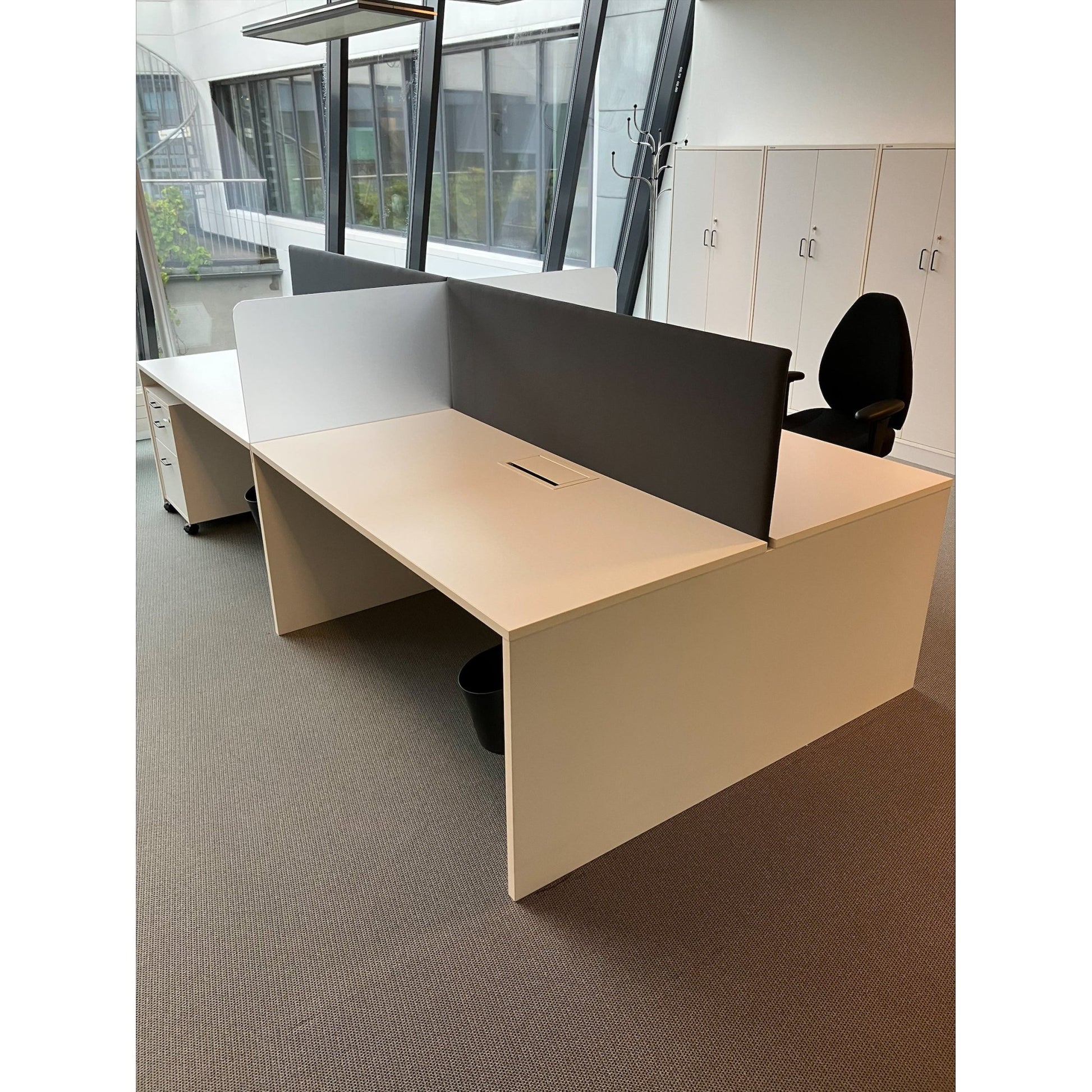 Komplett kontormodul som gir et funksjonelt og moderne arbeidsområde. Modulen inkluderer frostet plexiskillevegg for økt privatliv og en hvit HPL-bordplate med ABS-kant for holdbarhet. Den smarte designen med integrerte søppelkasser under benken bidrar til et ryddig arbeidsmiljø.