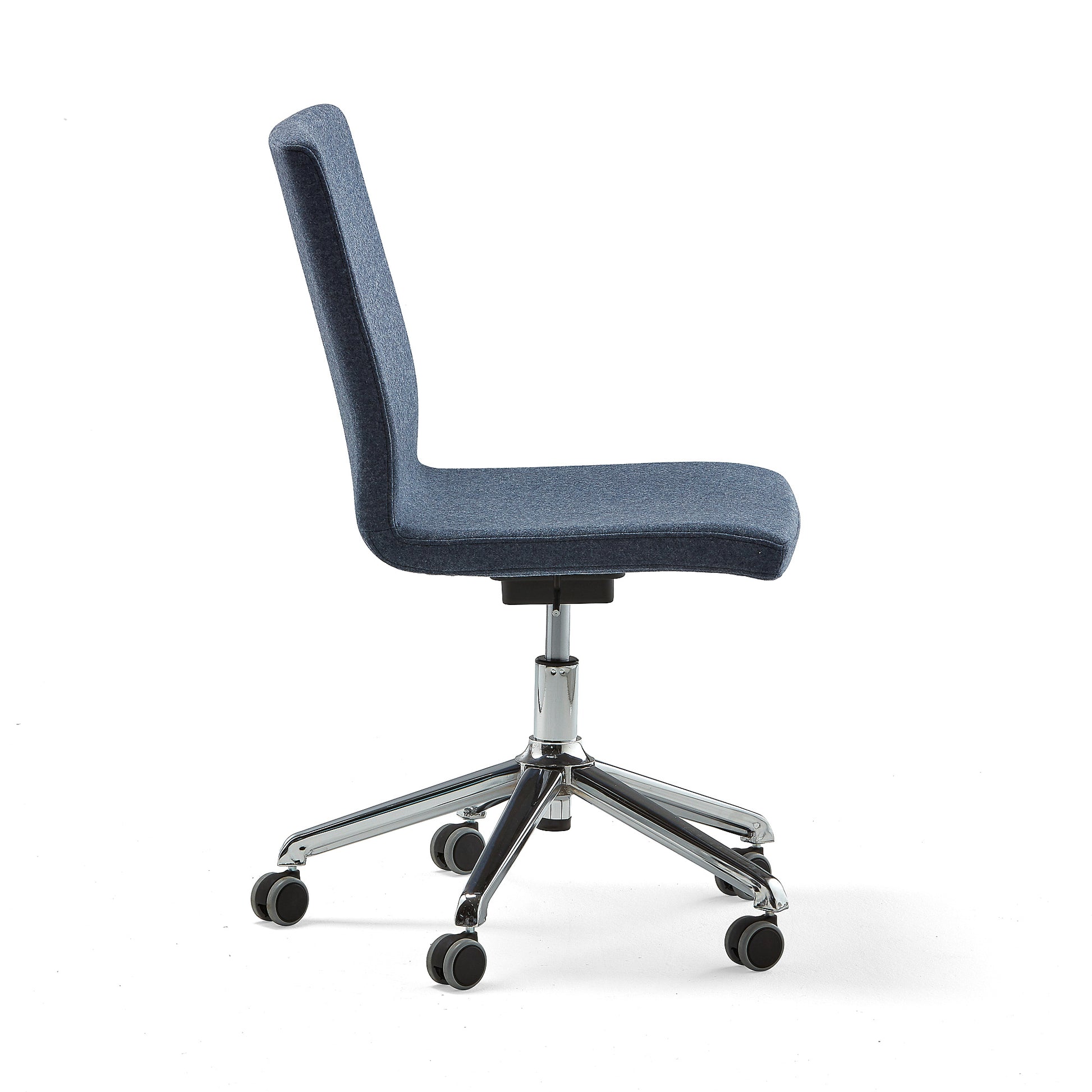 Stilren konferansestol fra AJ Produkter med et behagelig og slitesterkt ullstoff i en blågrå nyanse som gir et moderne preg. Stolens innovative bevegelige seteteknologi aktiverer ryggmusklene og gir optimal støtte, noe som gjør den perfekt for møter eller arbeidsplasser der komfort er essensielt.