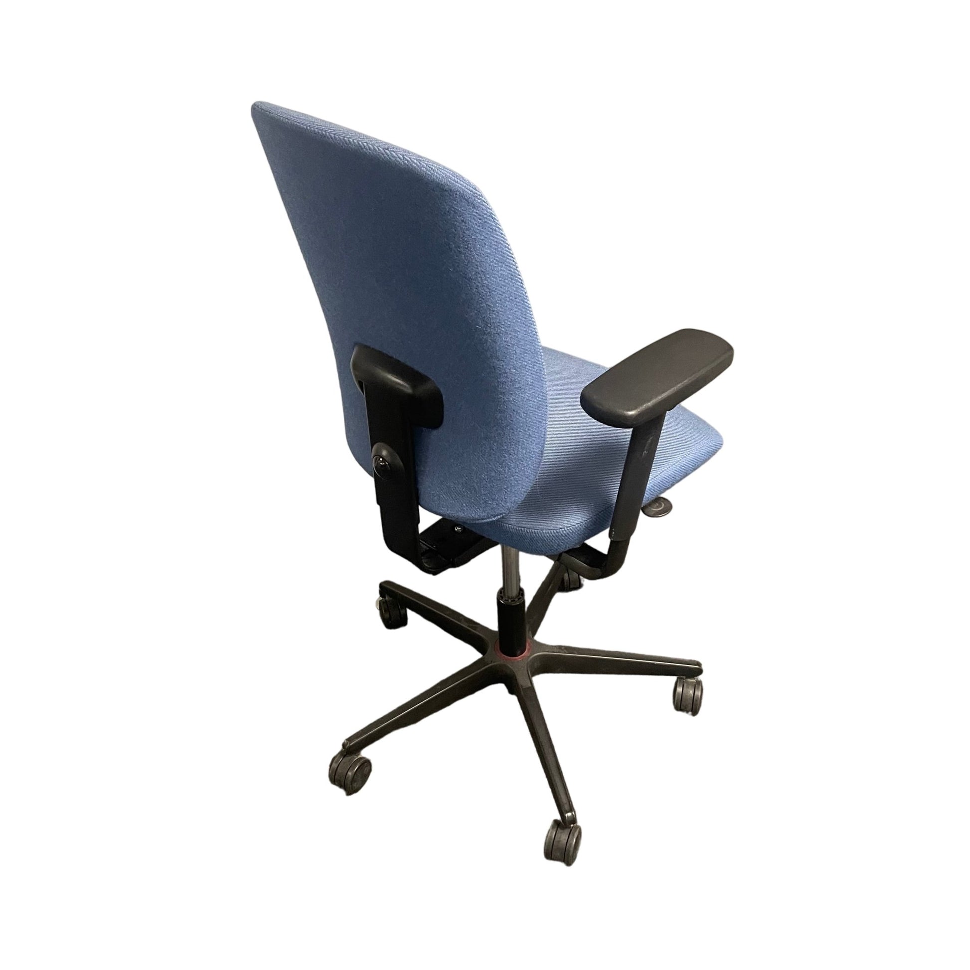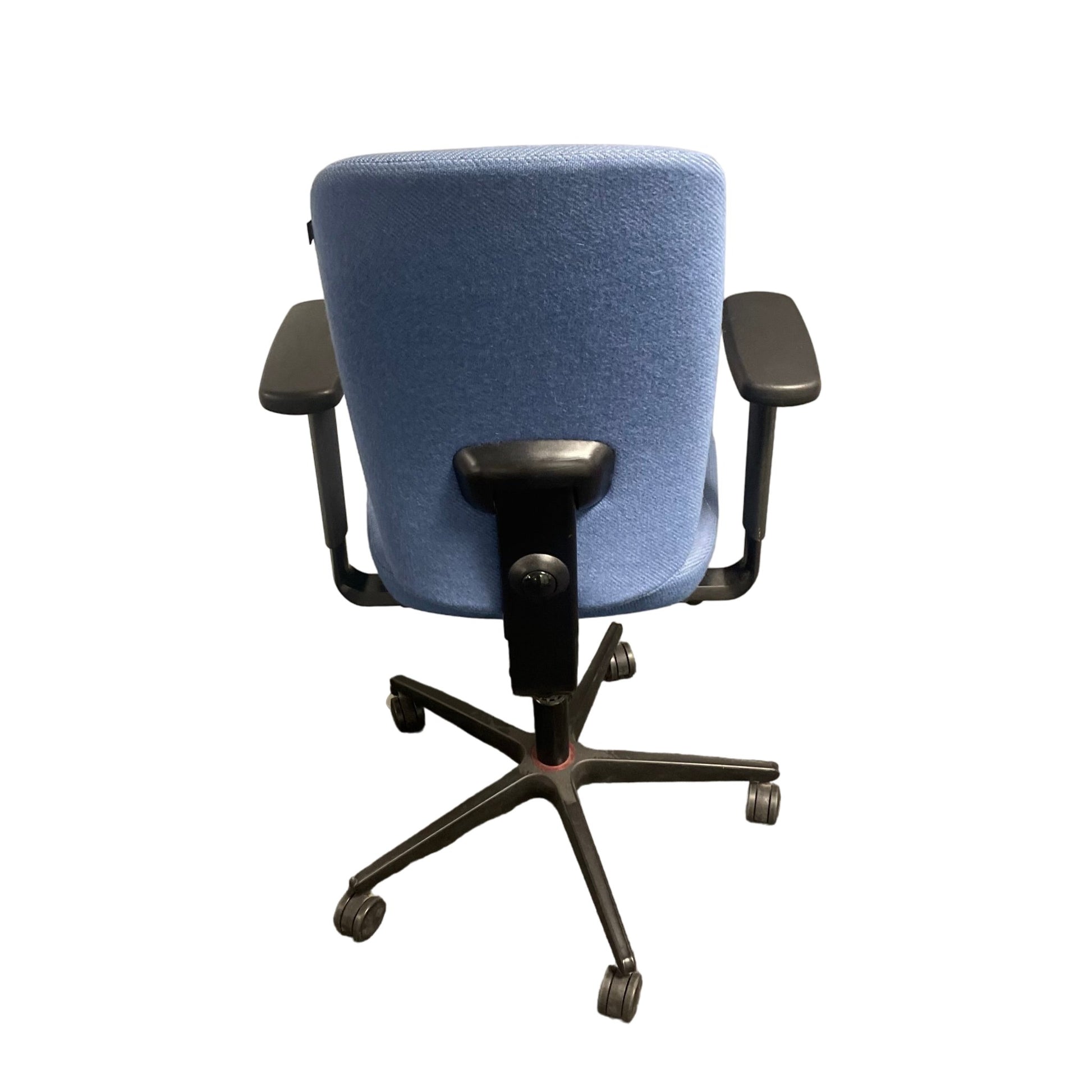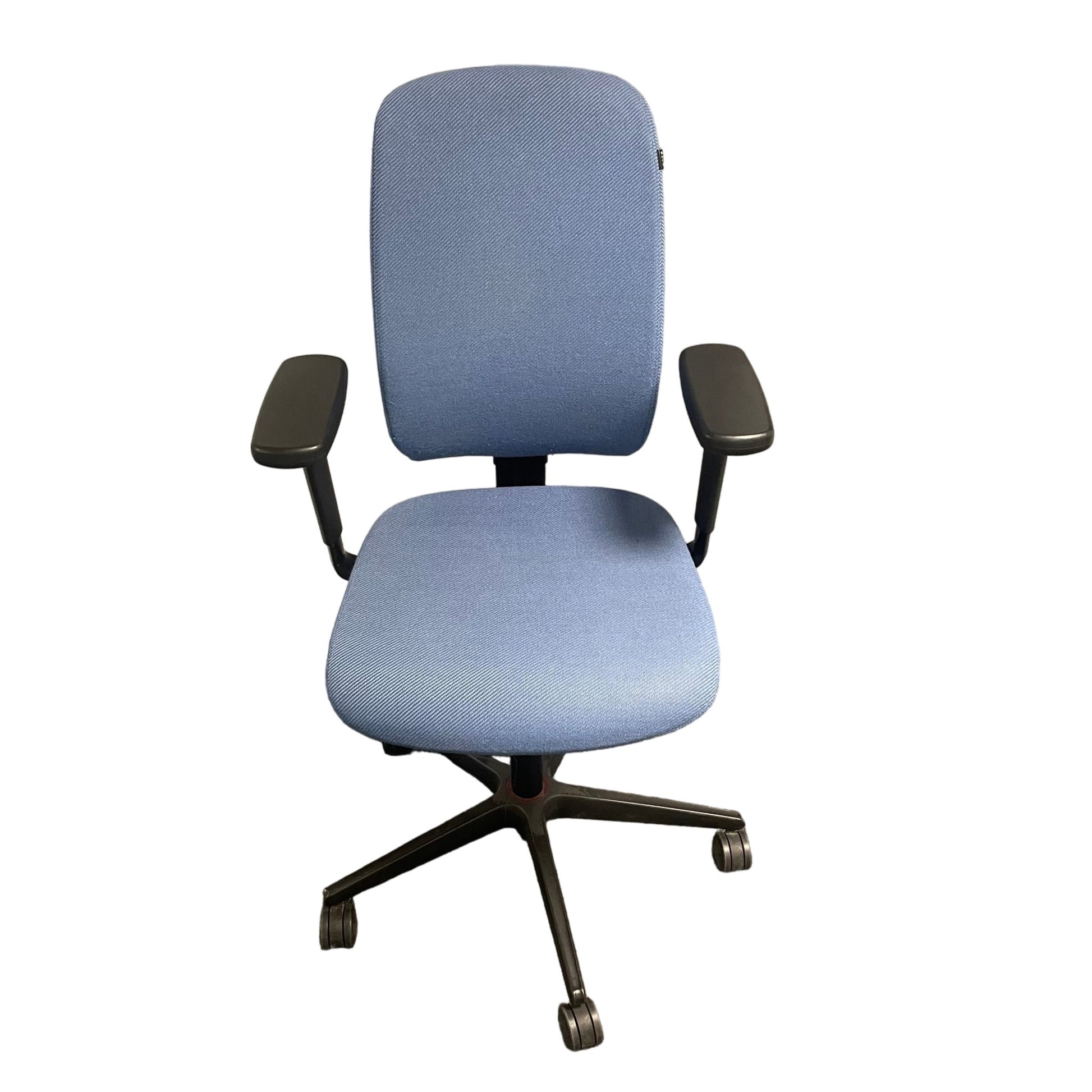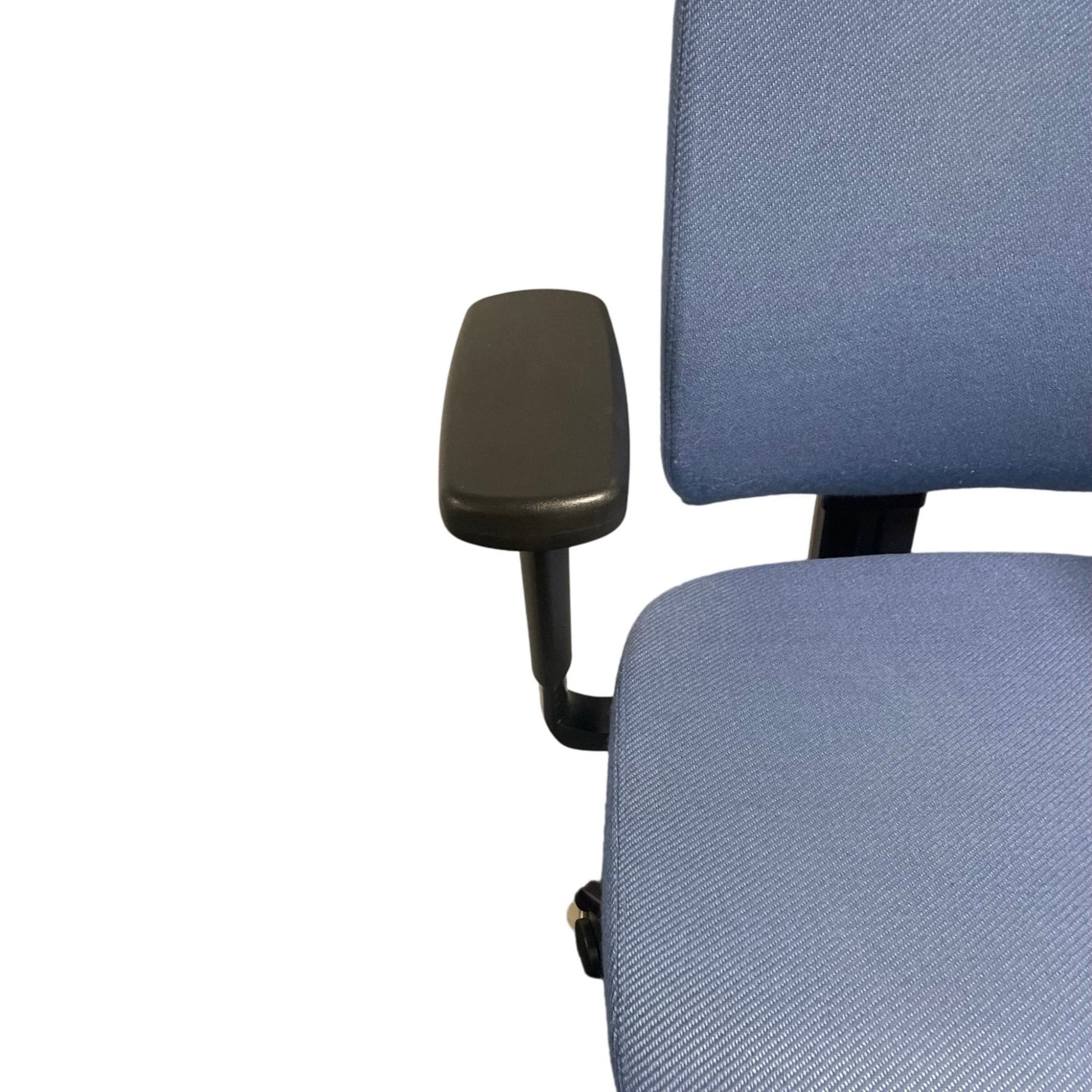 Komfortabel Eos kontorstol fra SAVO med blått trekk og justerbare armlener. Den gir god støtte for lange arbeidsdager med høy rygg og justerbar sittehøyde.