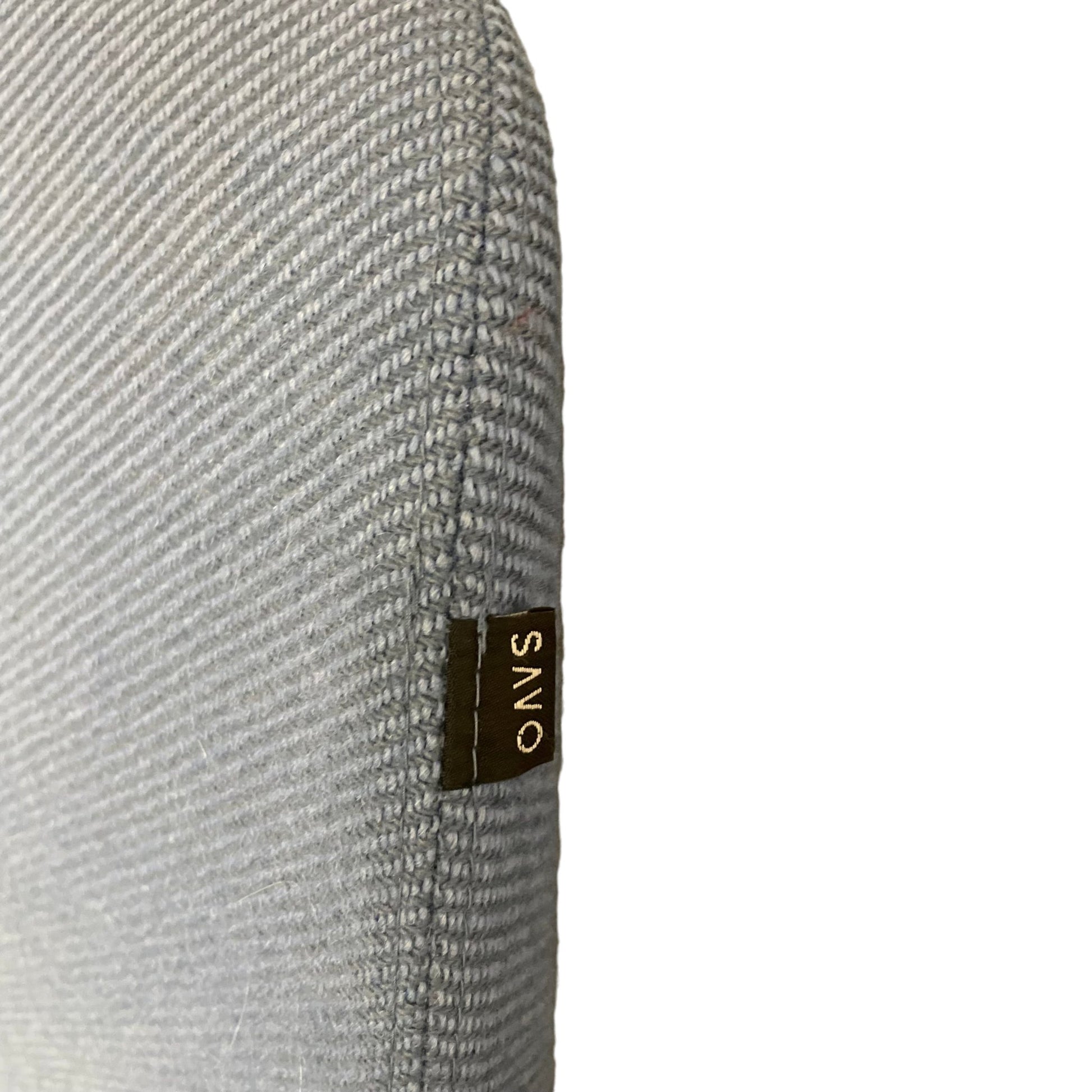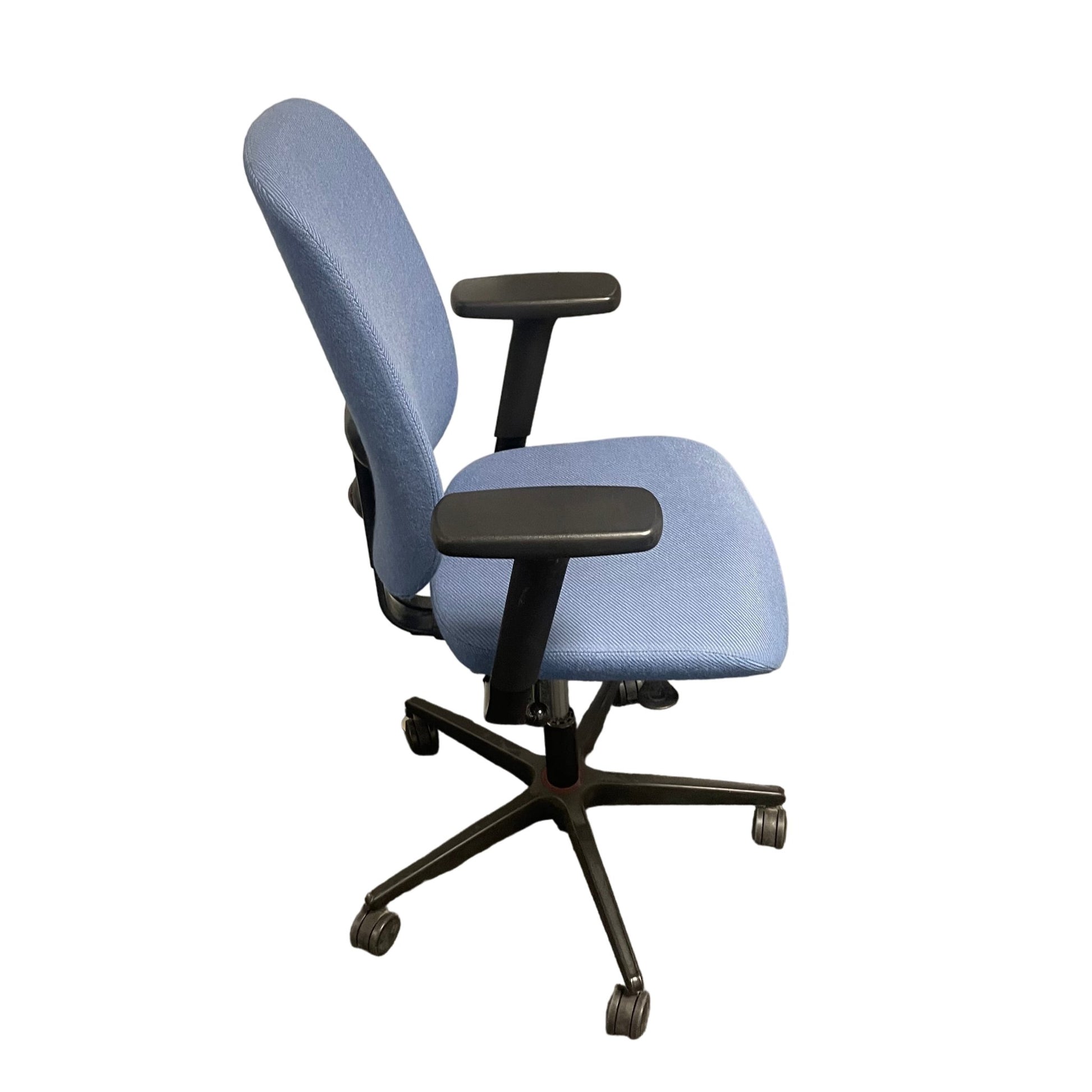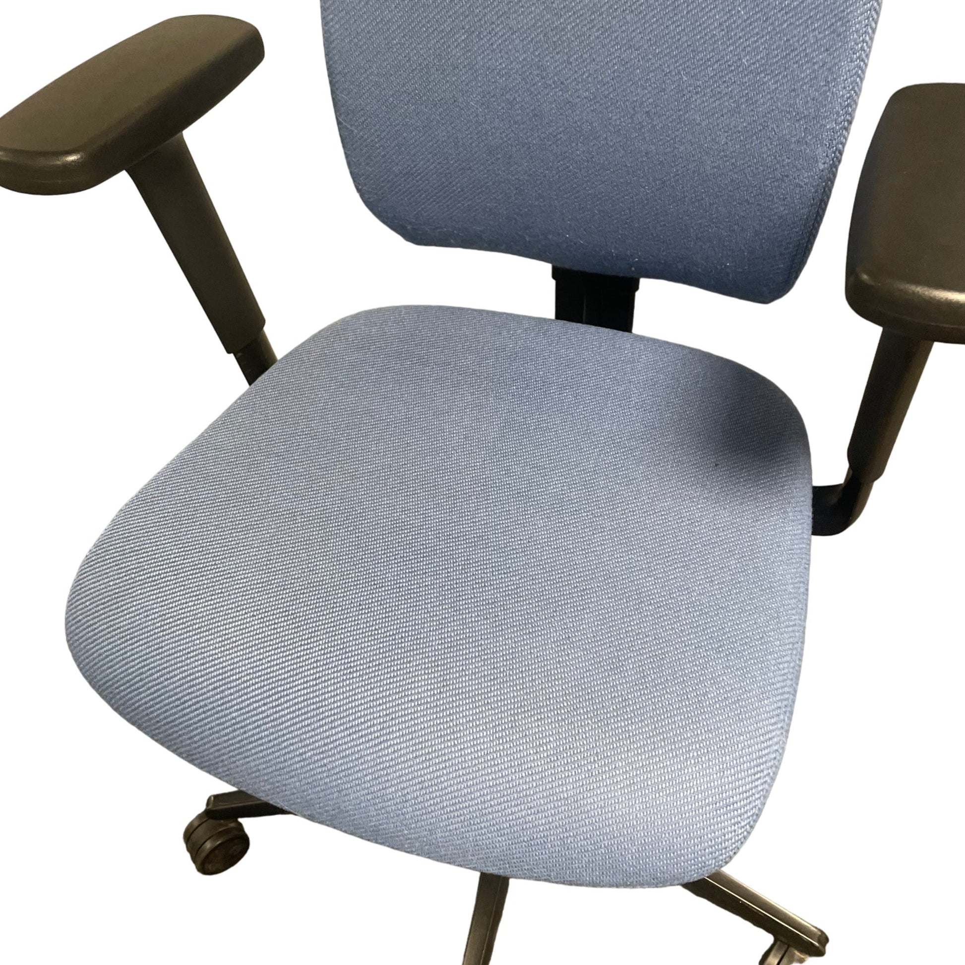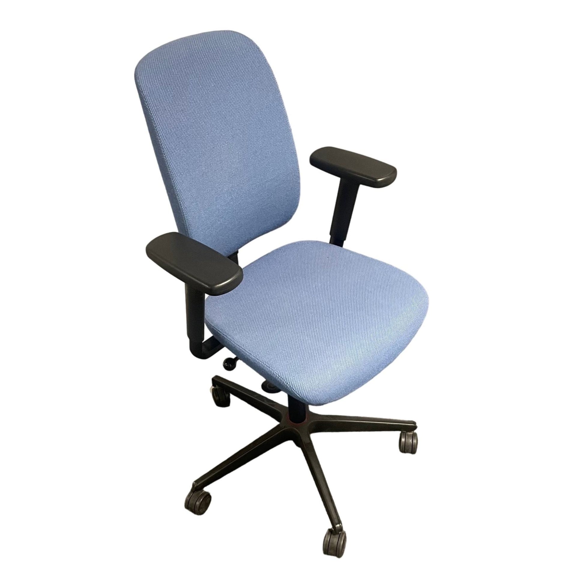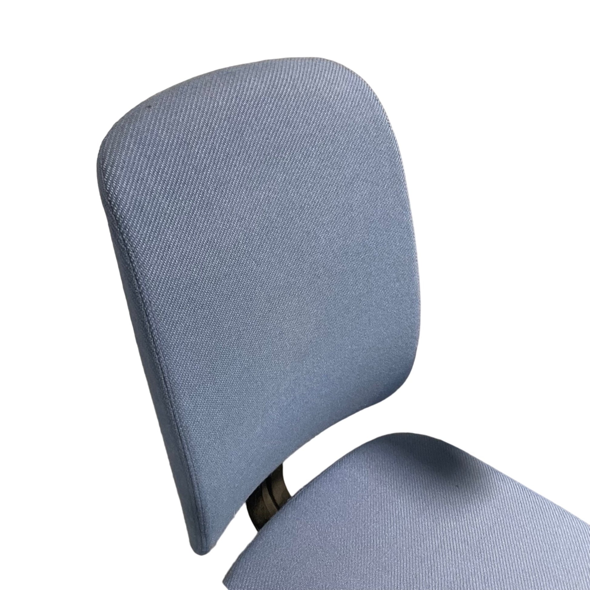 Komfortabel Eos kontorstol fra SAVO med blått trekk og justerbare armlener. Den gir god støtte for lange arbeidsdager med høy rygg og justerbar sittehøyde.