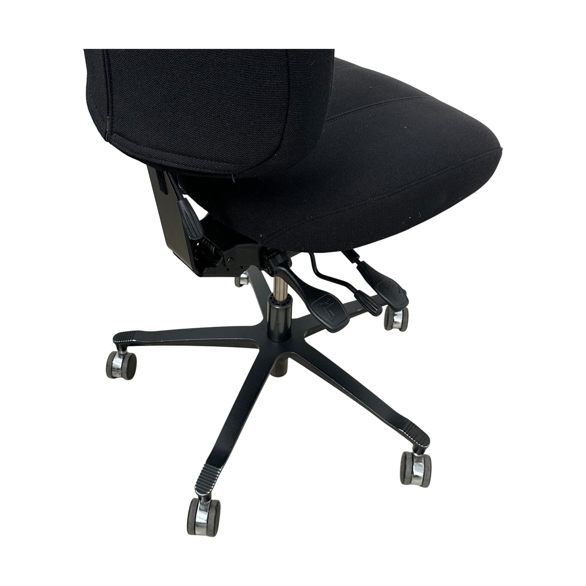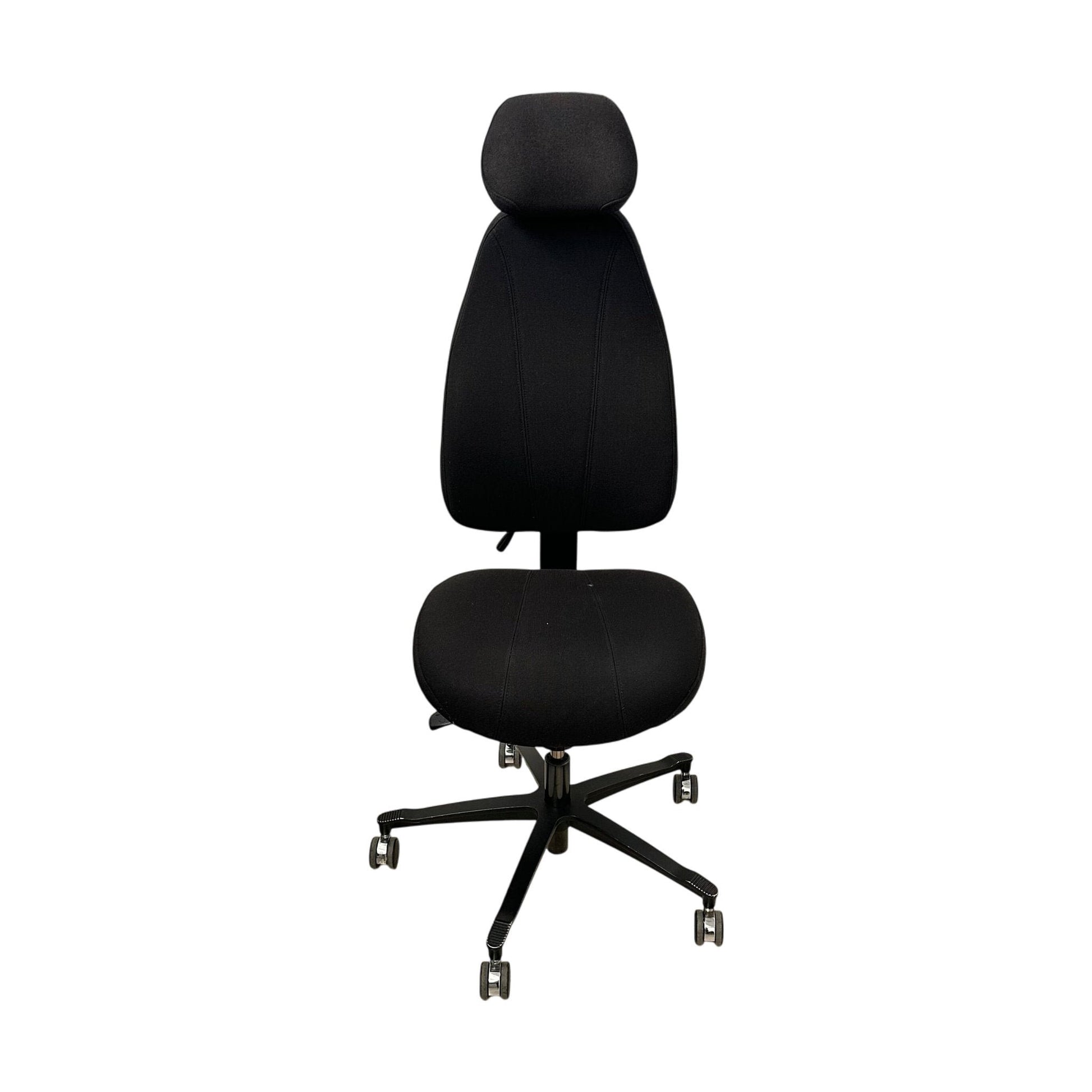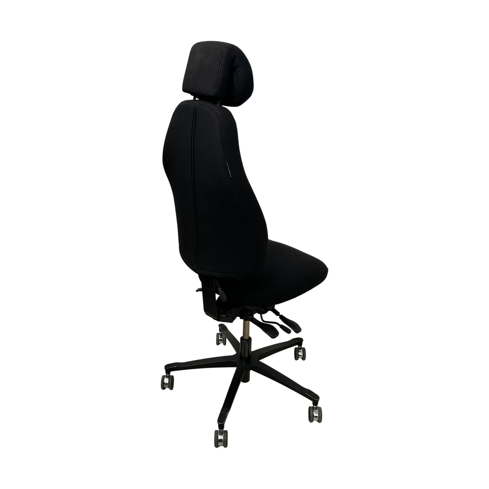 Kontorstolen er i god tilstand med minimale bruksmerker. Det svarte stoffet er i meget god stand uten synlige flekker eller slitasje, og alle funksjoner fungerer som de skal. Den utstråler et moderne og profesjonelt preg, ideell for kontormiljøer.