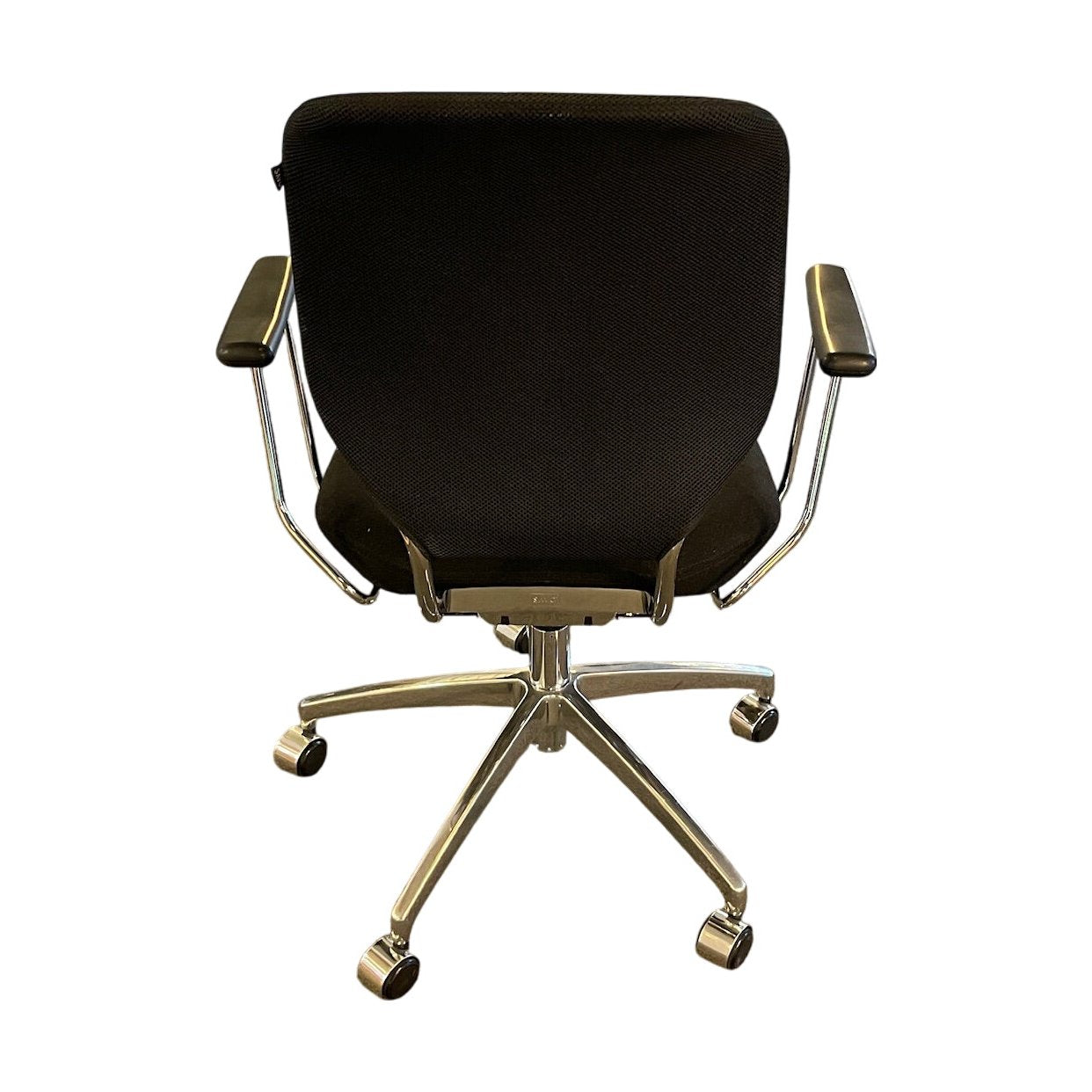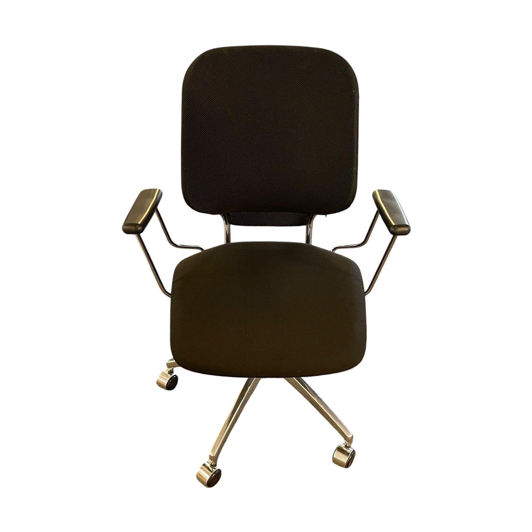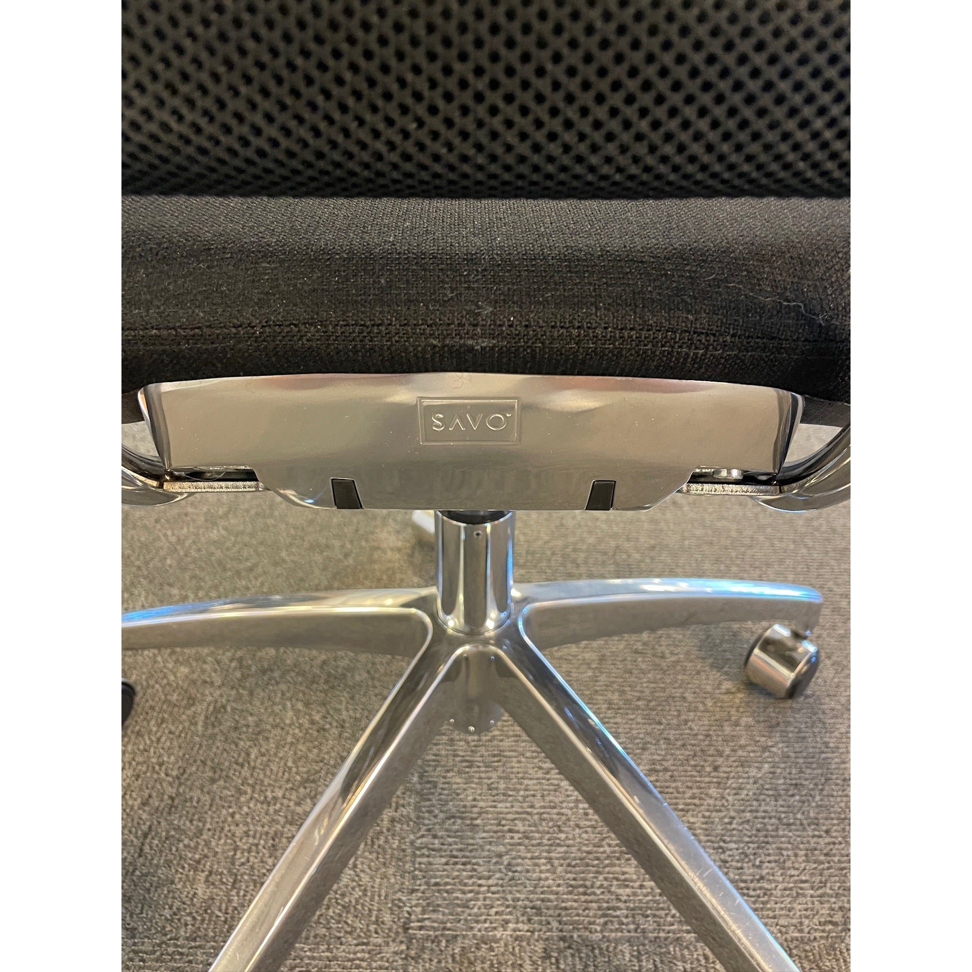 Moderne kontorstol/møtestol fra SAVO med et stilrent og minimalistisk design. Stolen har et behagelig sort stofftrukket sete og rygg, som gir godt støtte under arbeid. Med sin elegante form og solide konstruksjon, gjør denne modellen seg godt i alle kontormiljøer.