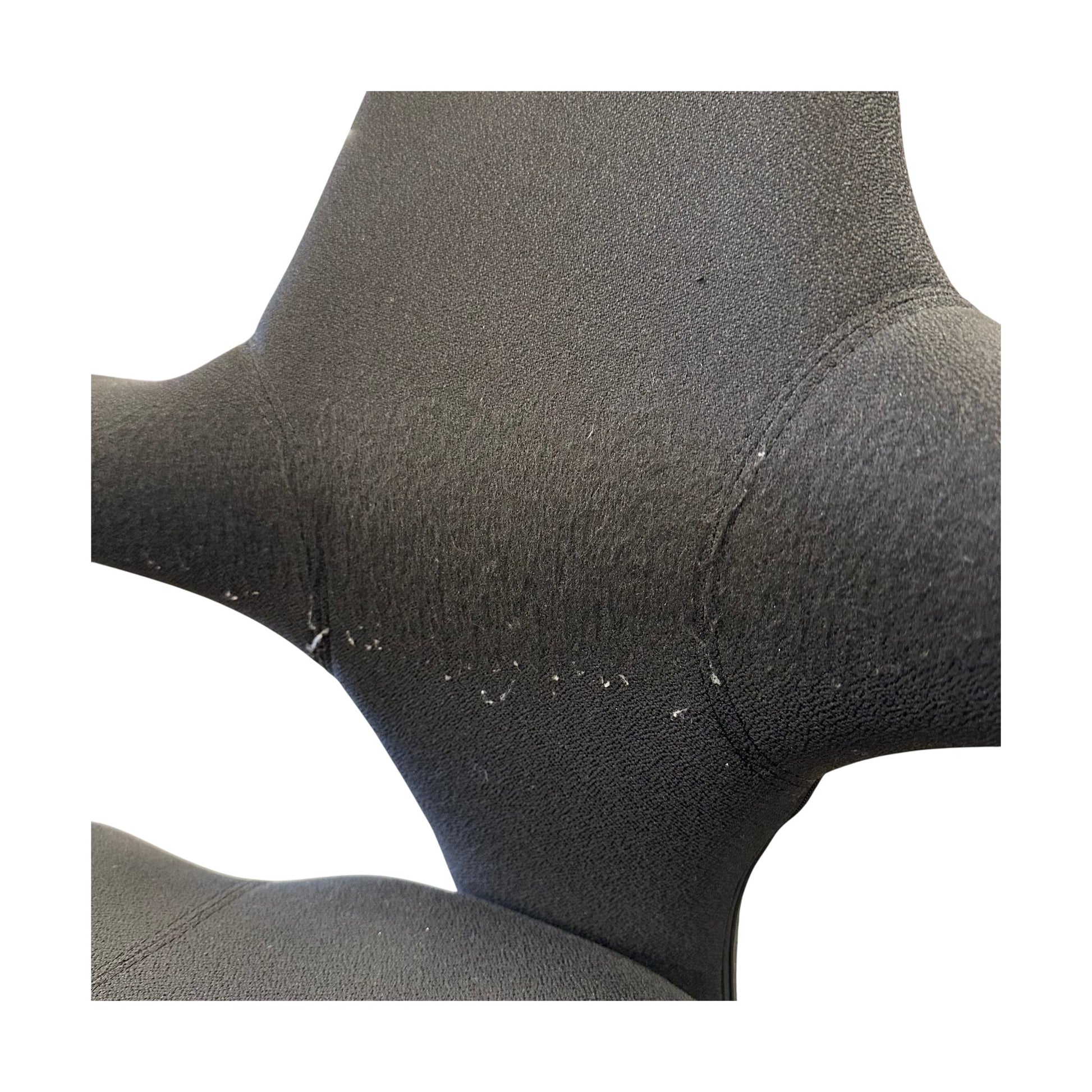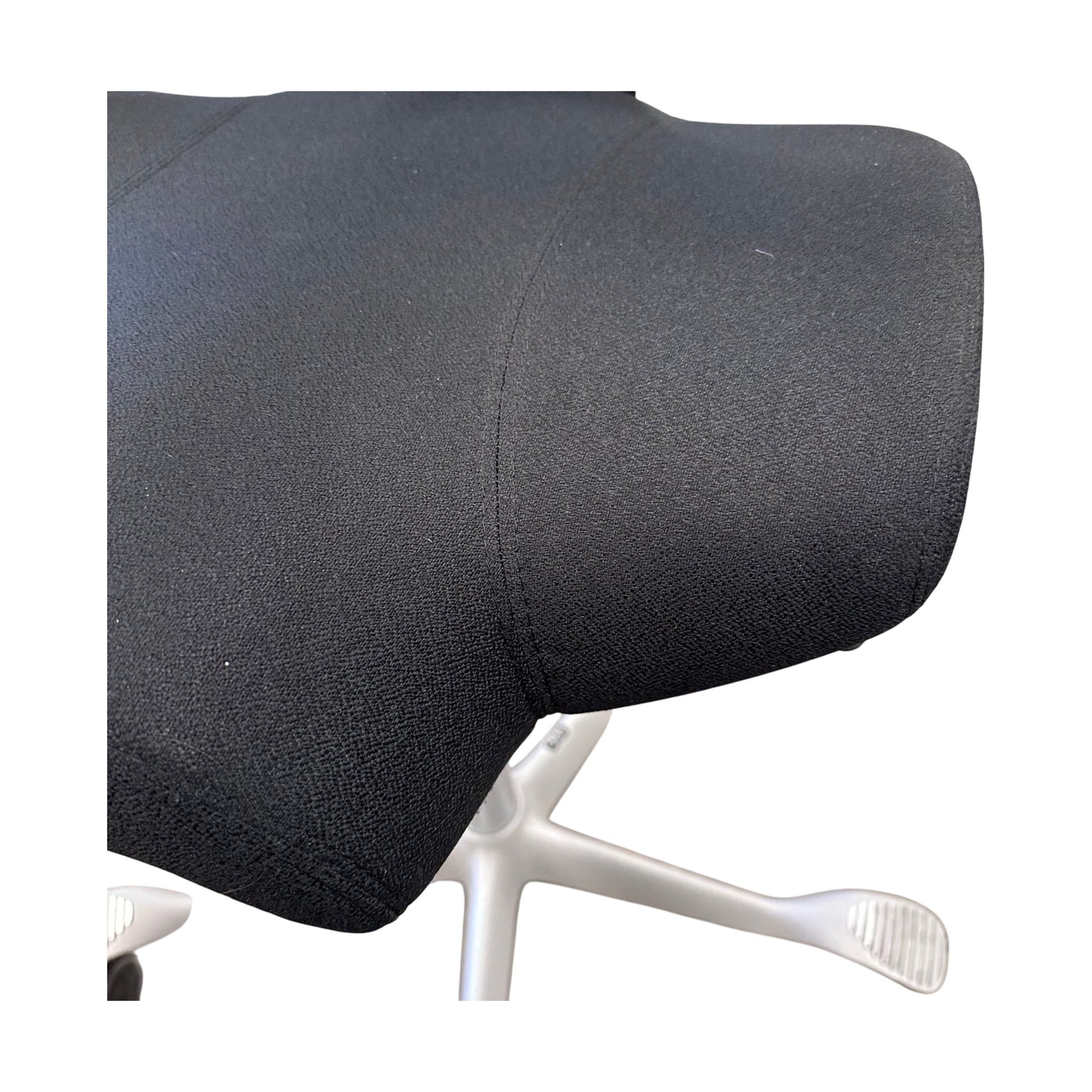 Stolen er i god stand med slitasje på fremsiden av ryggen. Stoffet til ryggen har mindre bruksmerker, men det påvirker ikke stolens funksjonalitet. Alle justeringsmekanismer virker som de skal.