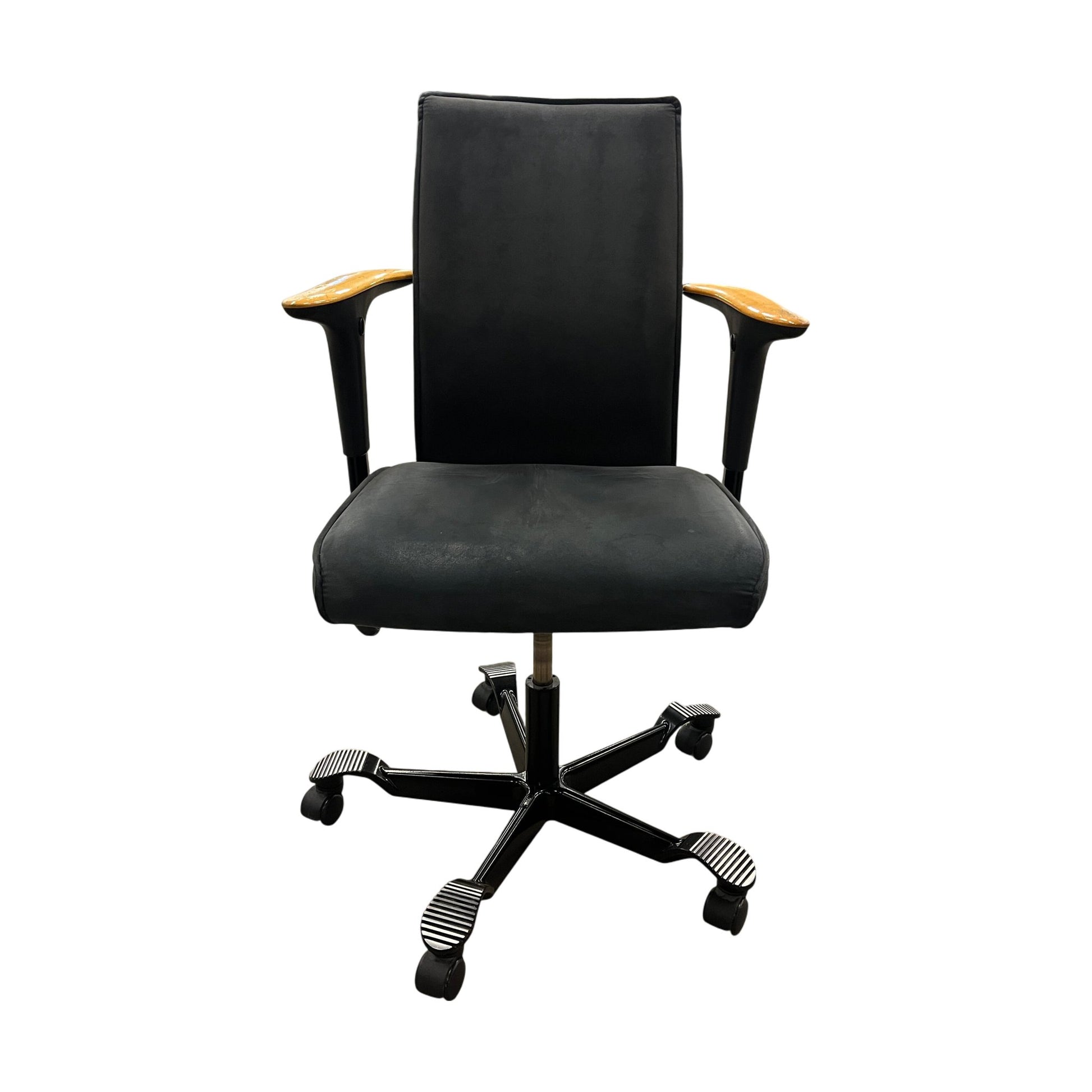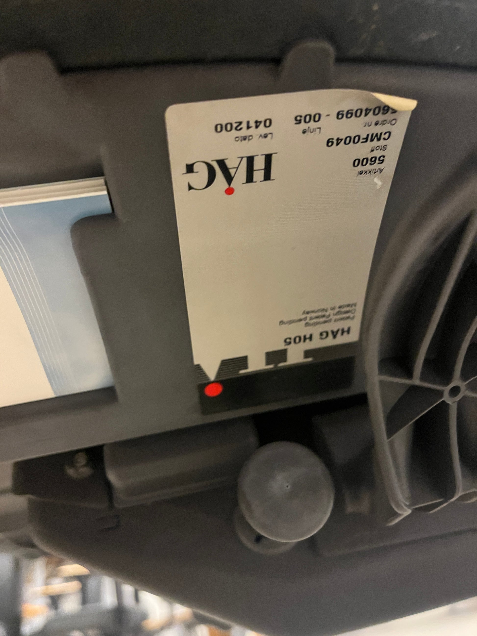 Praktisk HÅG H05 5600 kontorstol med et tidløst og funksjonelt design. Den grå polstringen har en slitt overflate, men stolen tilbyr fortsatt en solid sittestilling til arbeid og andre aktiviteter.