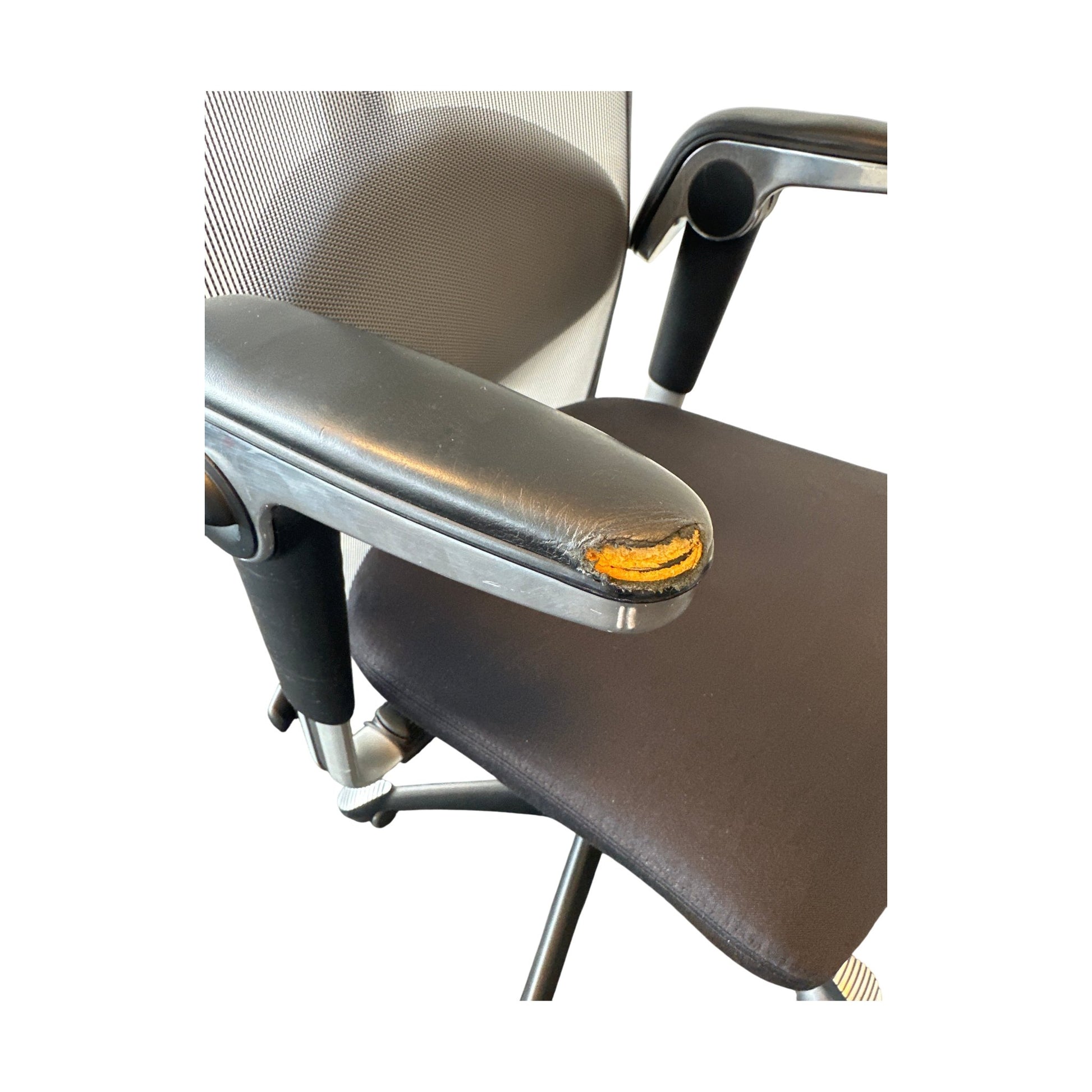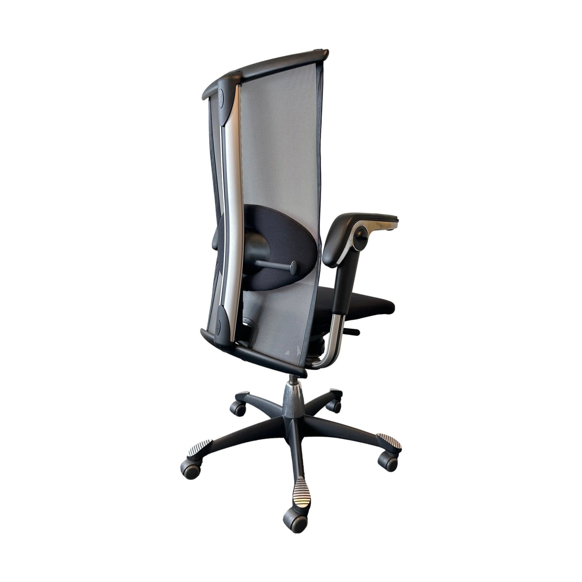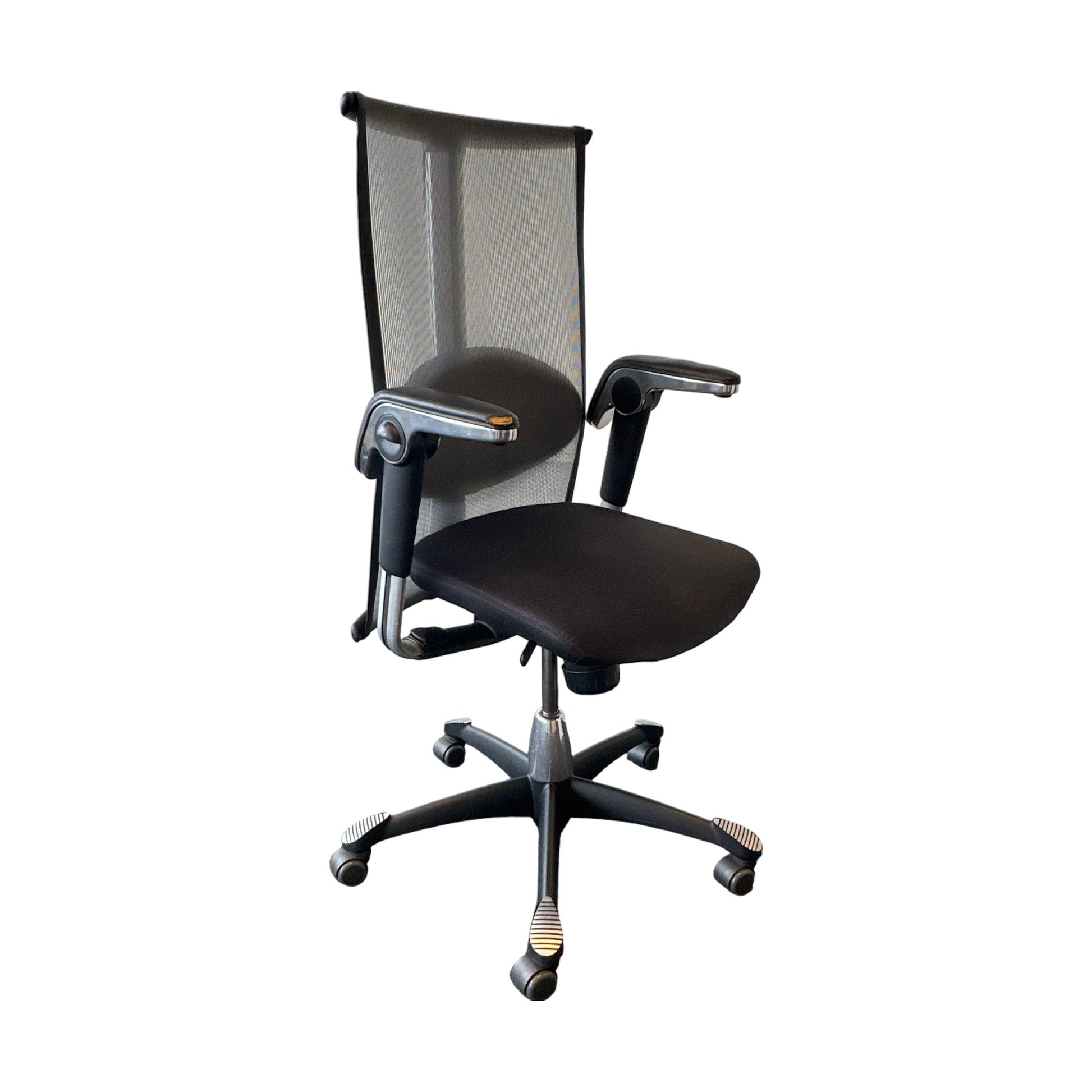 Klassisk kontorstol fra HÅG H09 med et stilrent design og komfortabelt sete. Modellen Inspiration har en svart polstret sete med en stram, sort mesh rygg som gir god ventilasjon. Stolen er i god stand, med et markant hakk på den ene armlenen som er synlig.