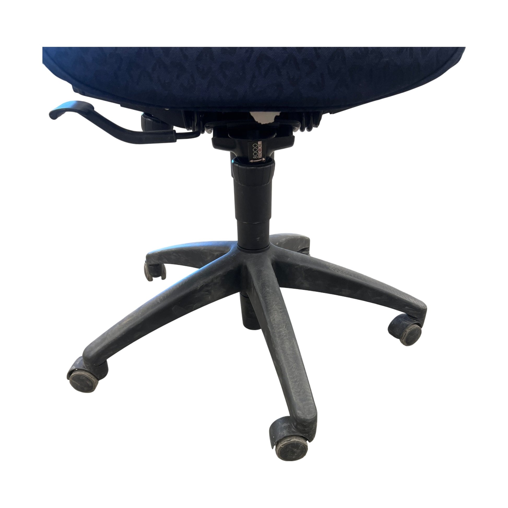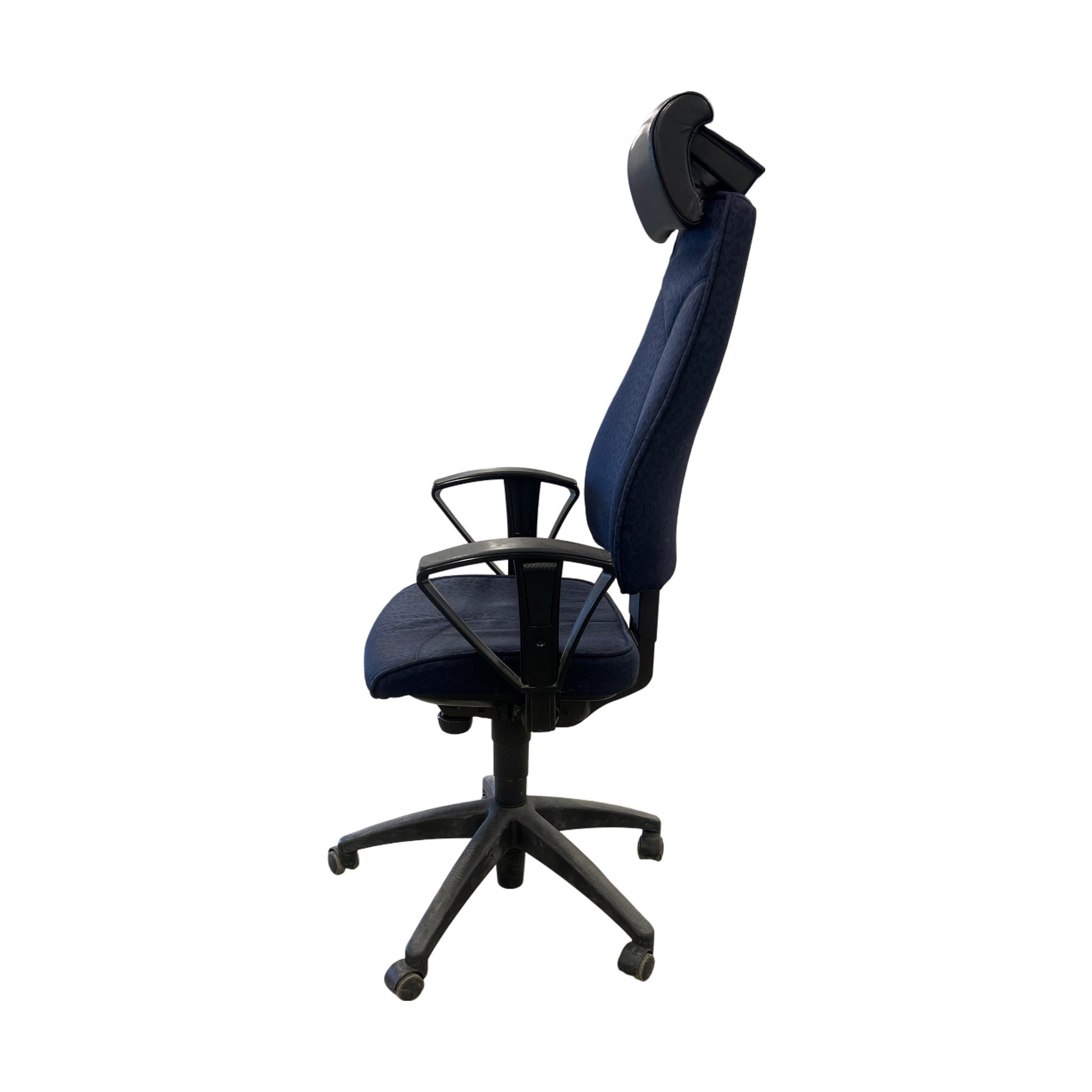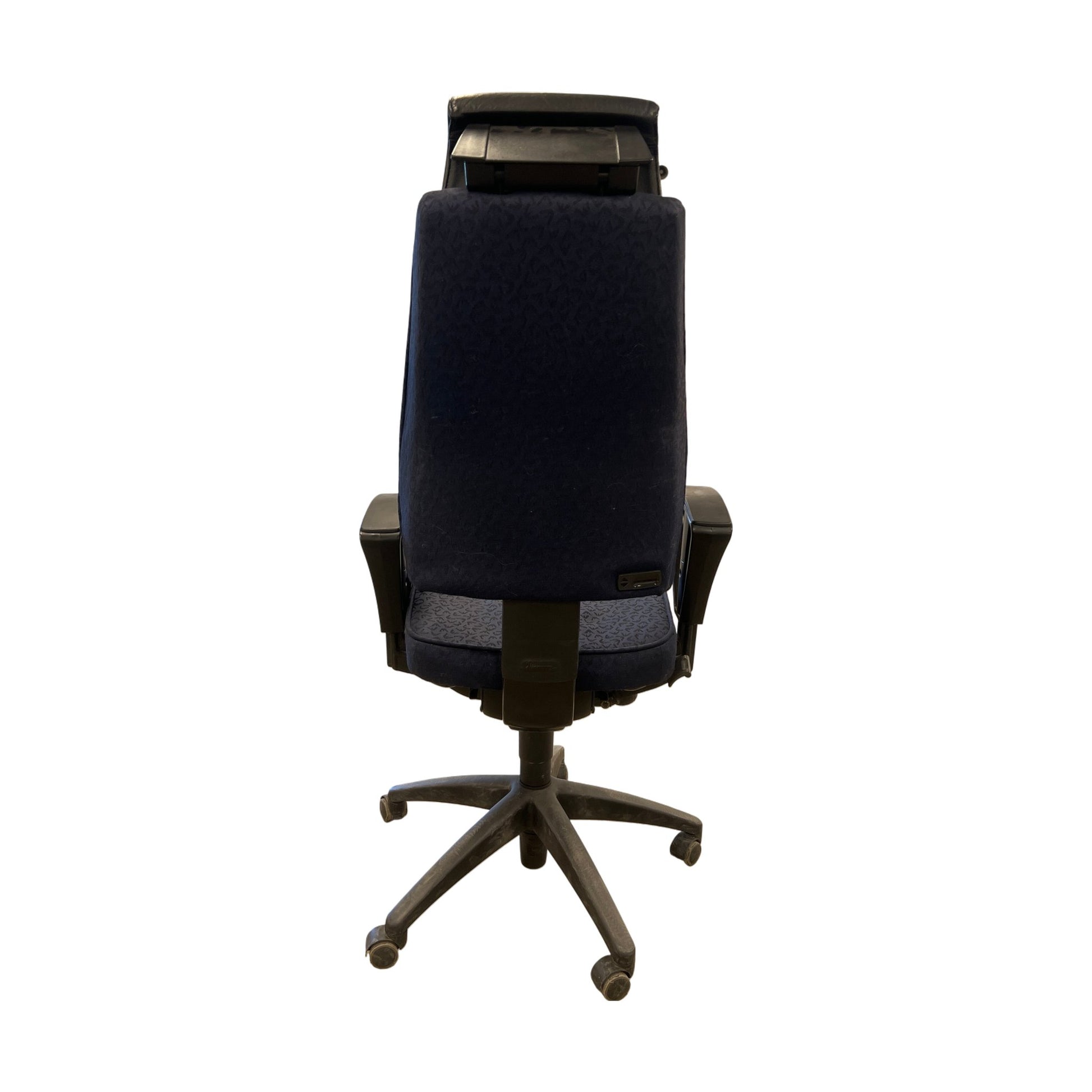 Stolen er i godt brukt tilstand med normale bruksmerker. Detaljer som stoff og armlener er intakte, og alle justeringsfunksjoner virker som de skal.