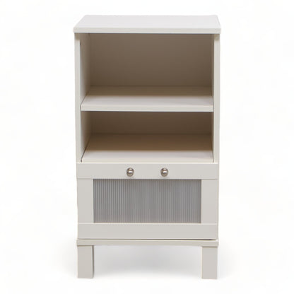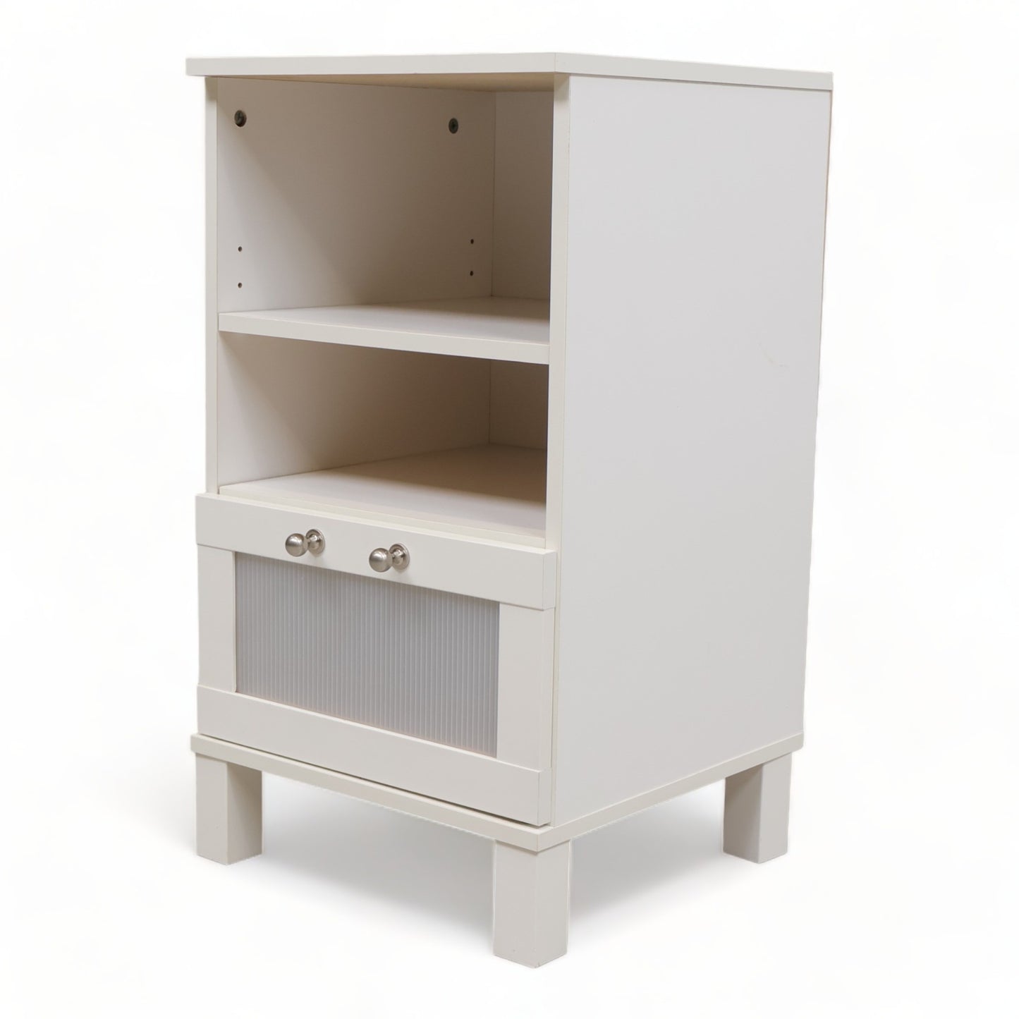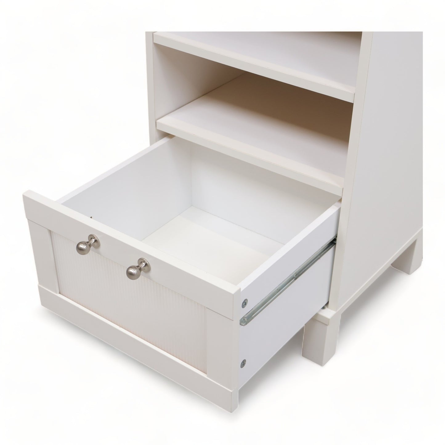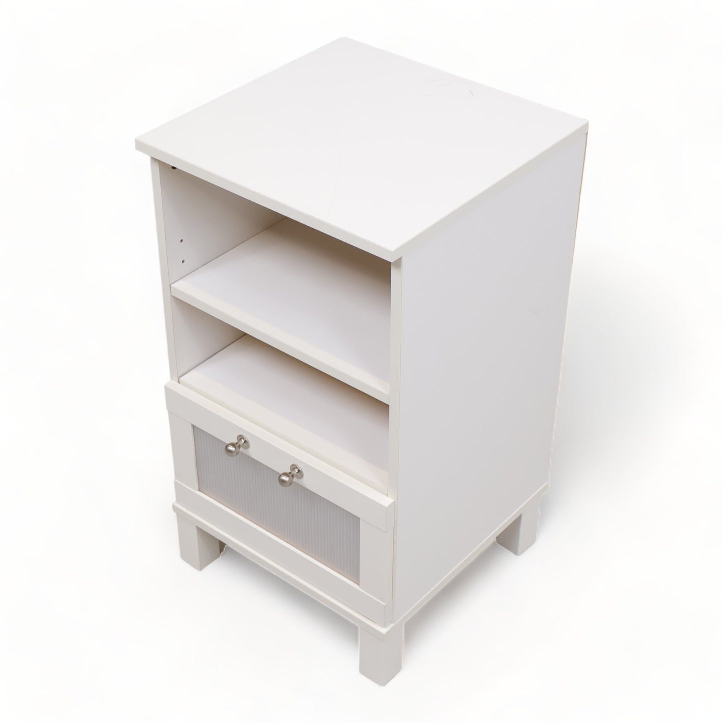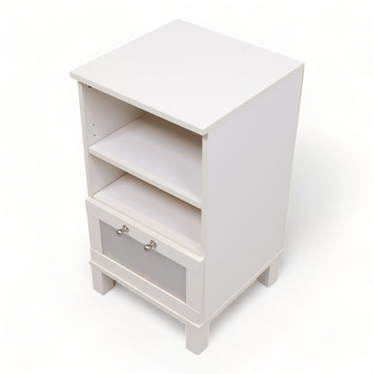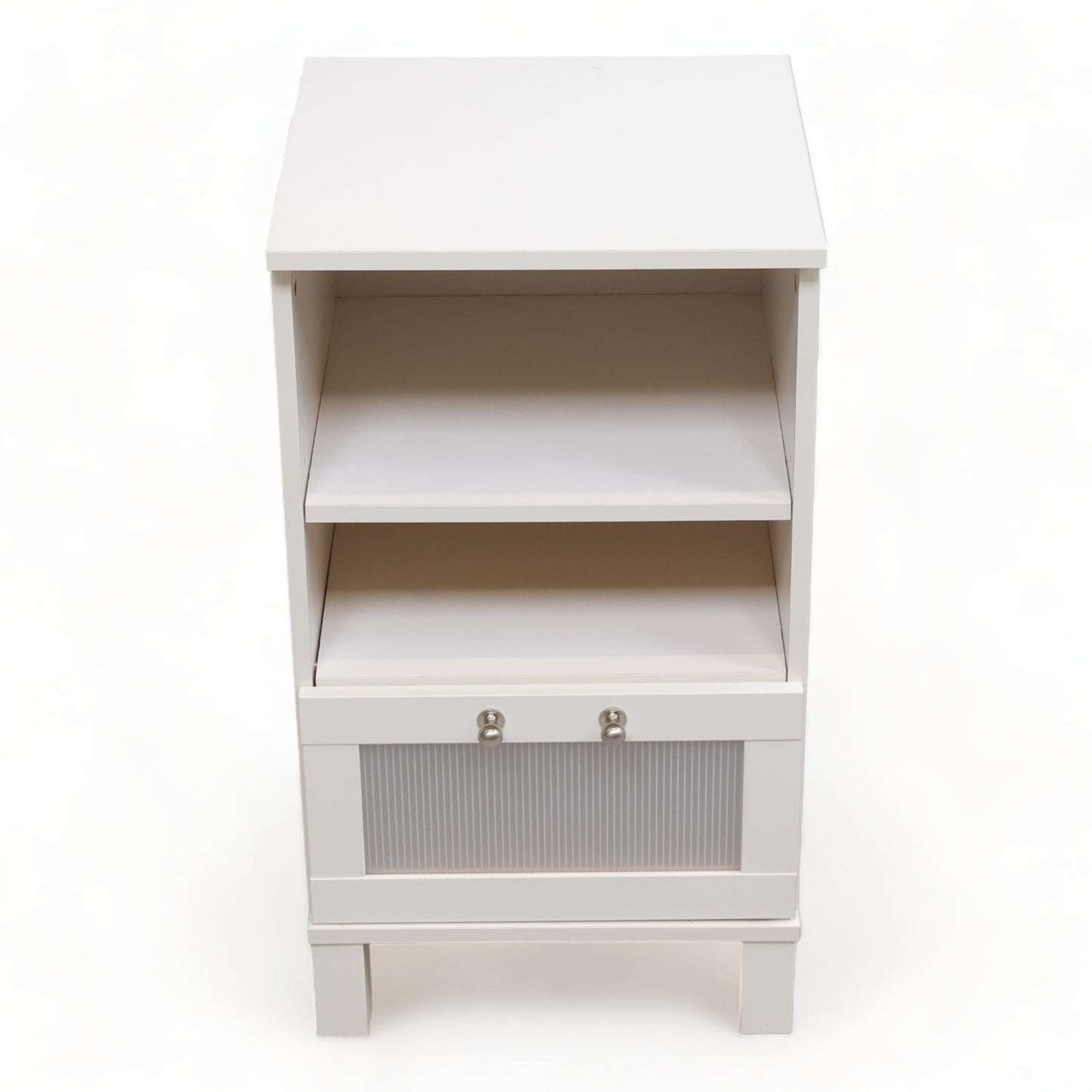 Kvalitetssikret IKEA Aneboda nattbord/kommode i fargen hvit. Skapet har to stk åpne hyller og en skuff i bånn. Den ene skuffen går noe skjevt inn, dette har ingenting å si for bruken av skuffen. Det er også noen mindre riper og merker som er avbildet. Funksjonelt og ellers i god stand.