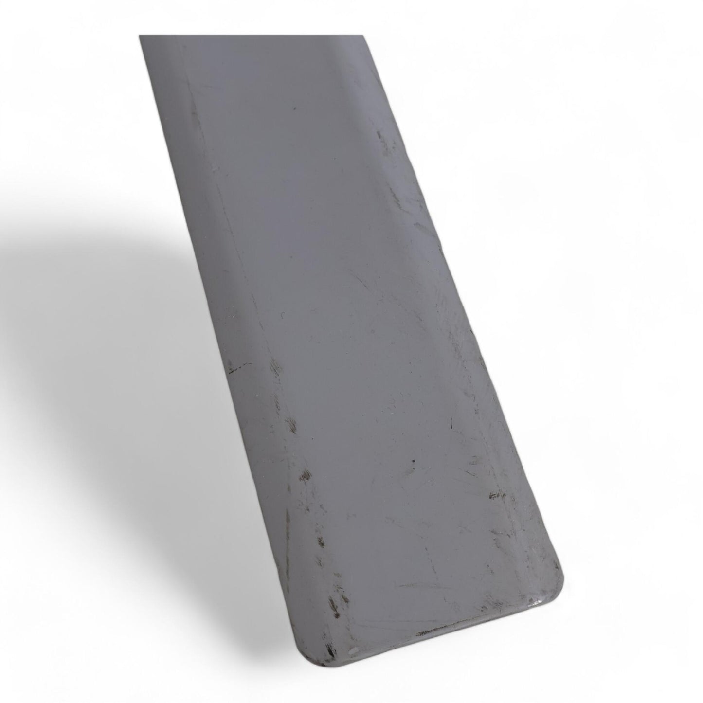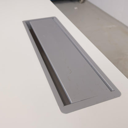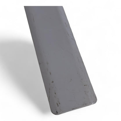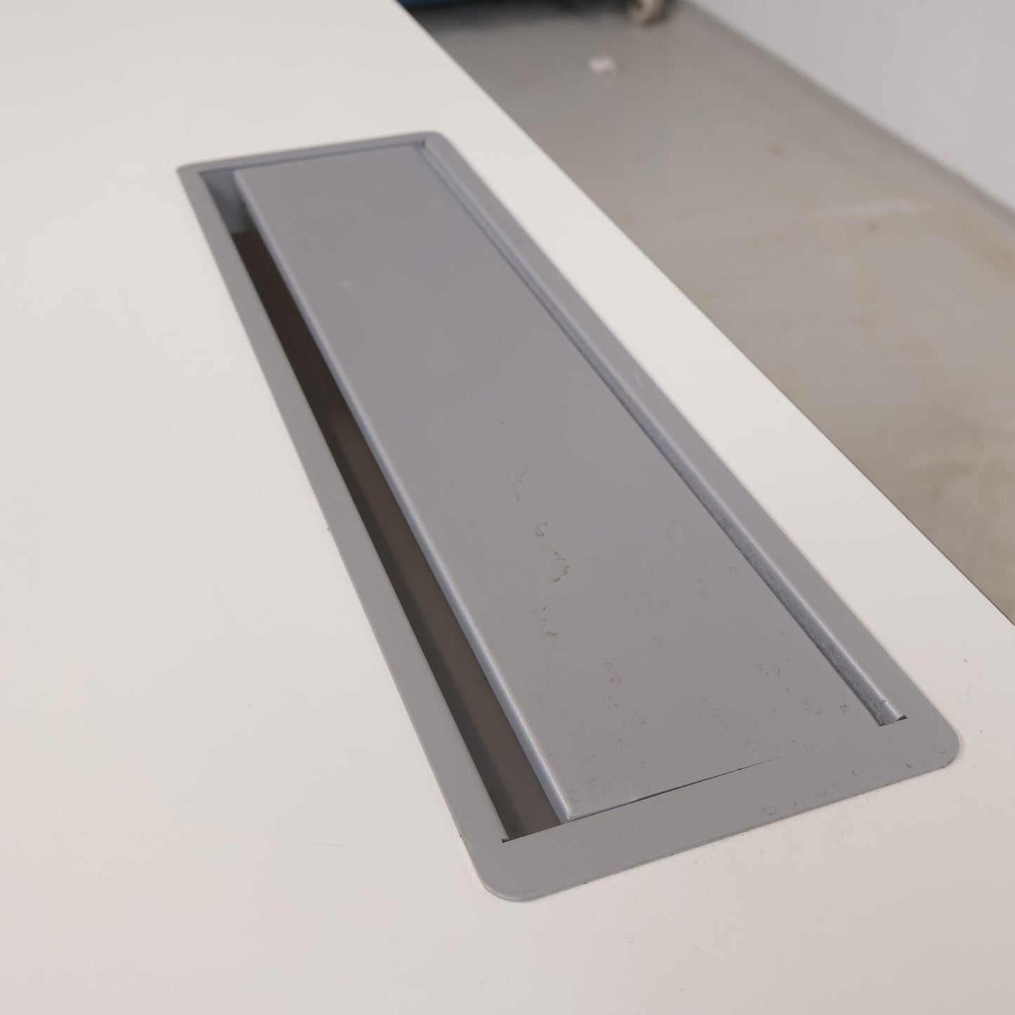 Bordet har noen skader langs kanten av bordplaten, som er noe synlige, men disse påvirker ikke funksjonaliteten. Med grå ben og praktisk magebue, er dette bordet en ideell arbeidsflate for både hjem og kontor.