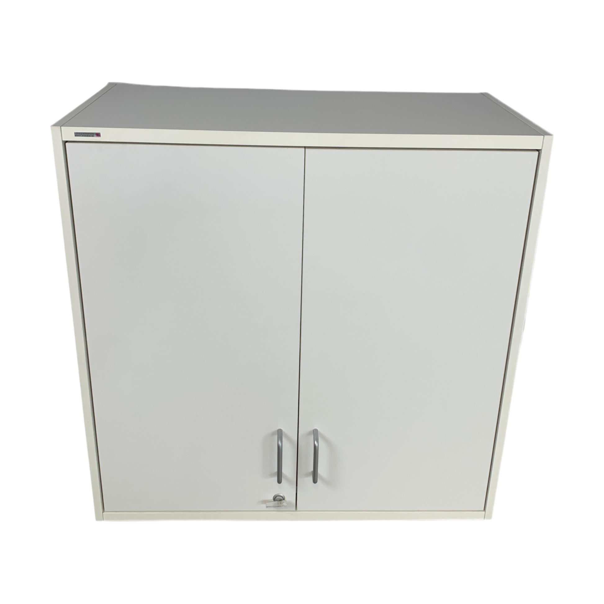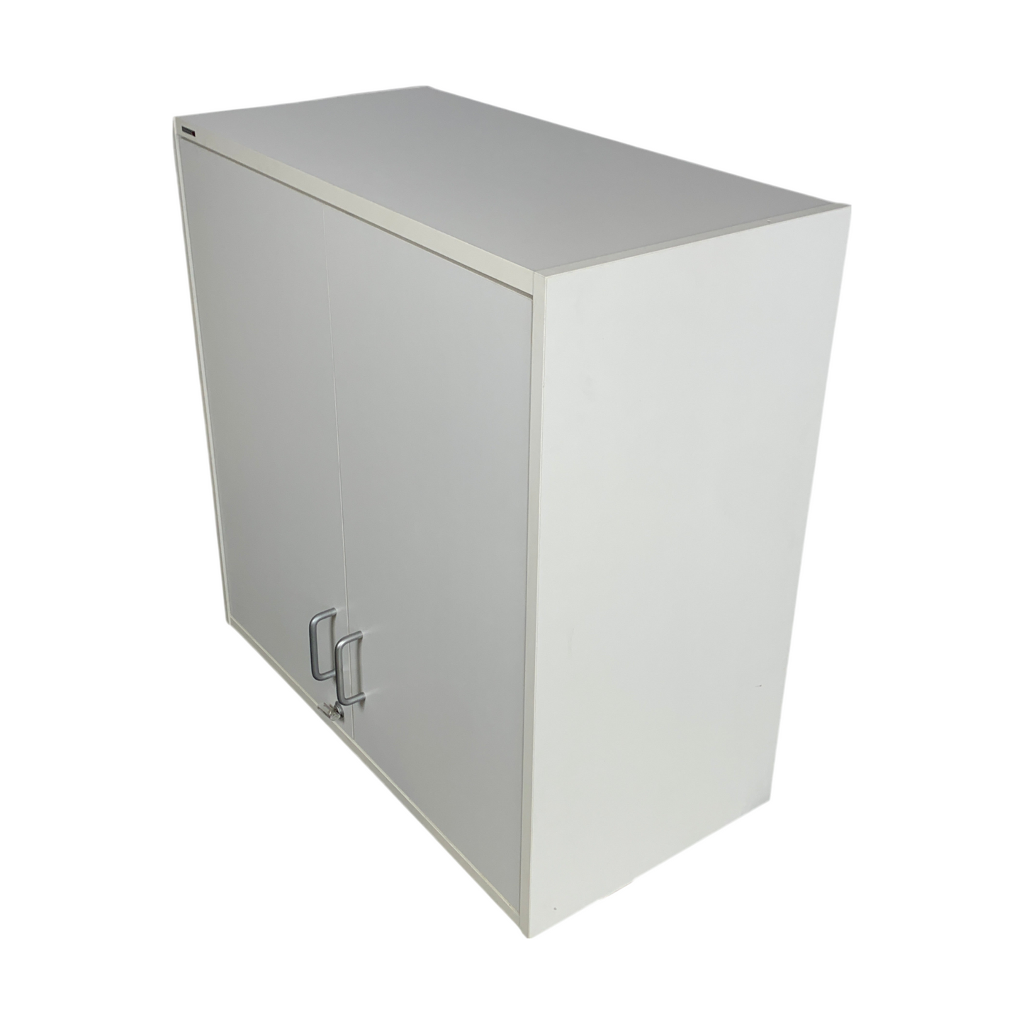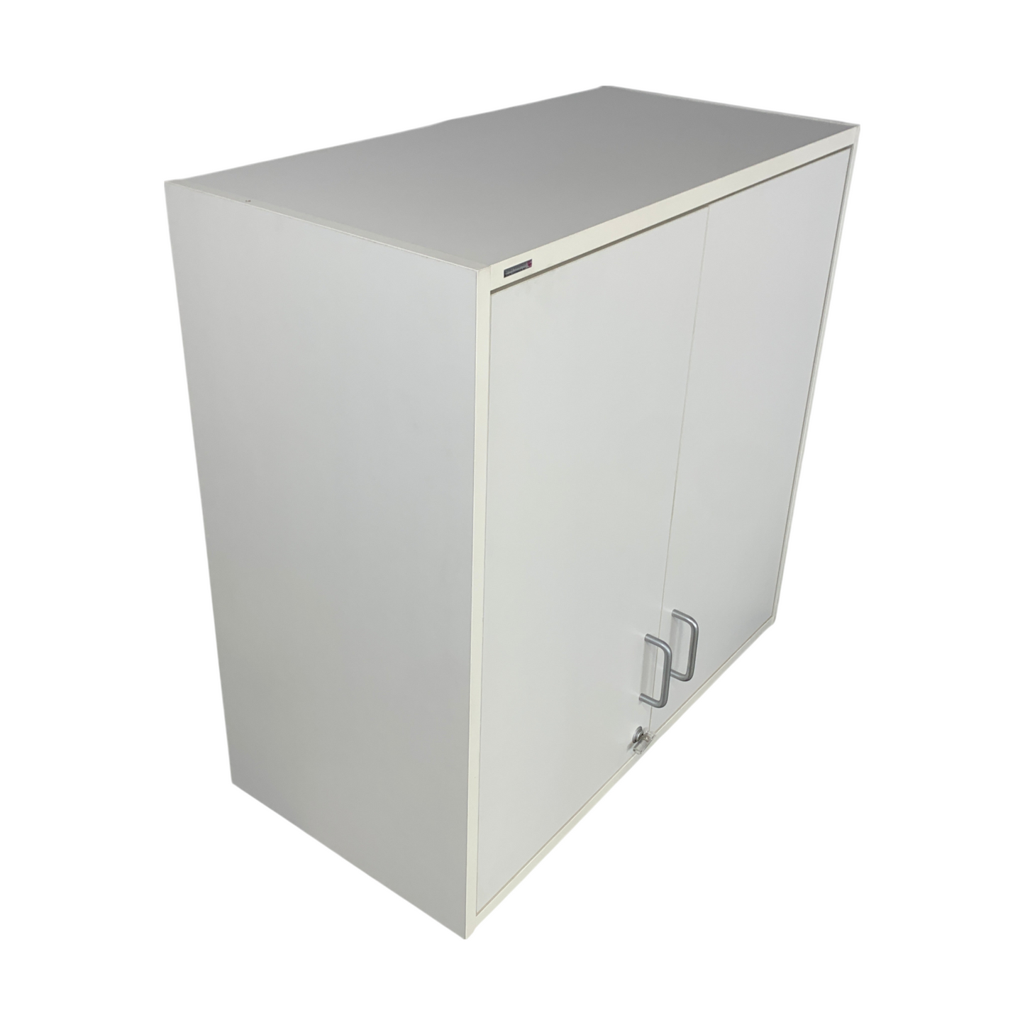 Låsbart overskap i hvit farge med moderne design, perfekt for kontoret eller arbeidsplassen. Med avtagbare pins kan skapet enkelt plasseres oppå annet møblement, og det har en hylle for effektiv oppbevaring.