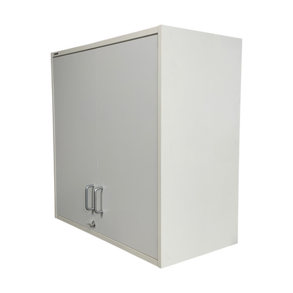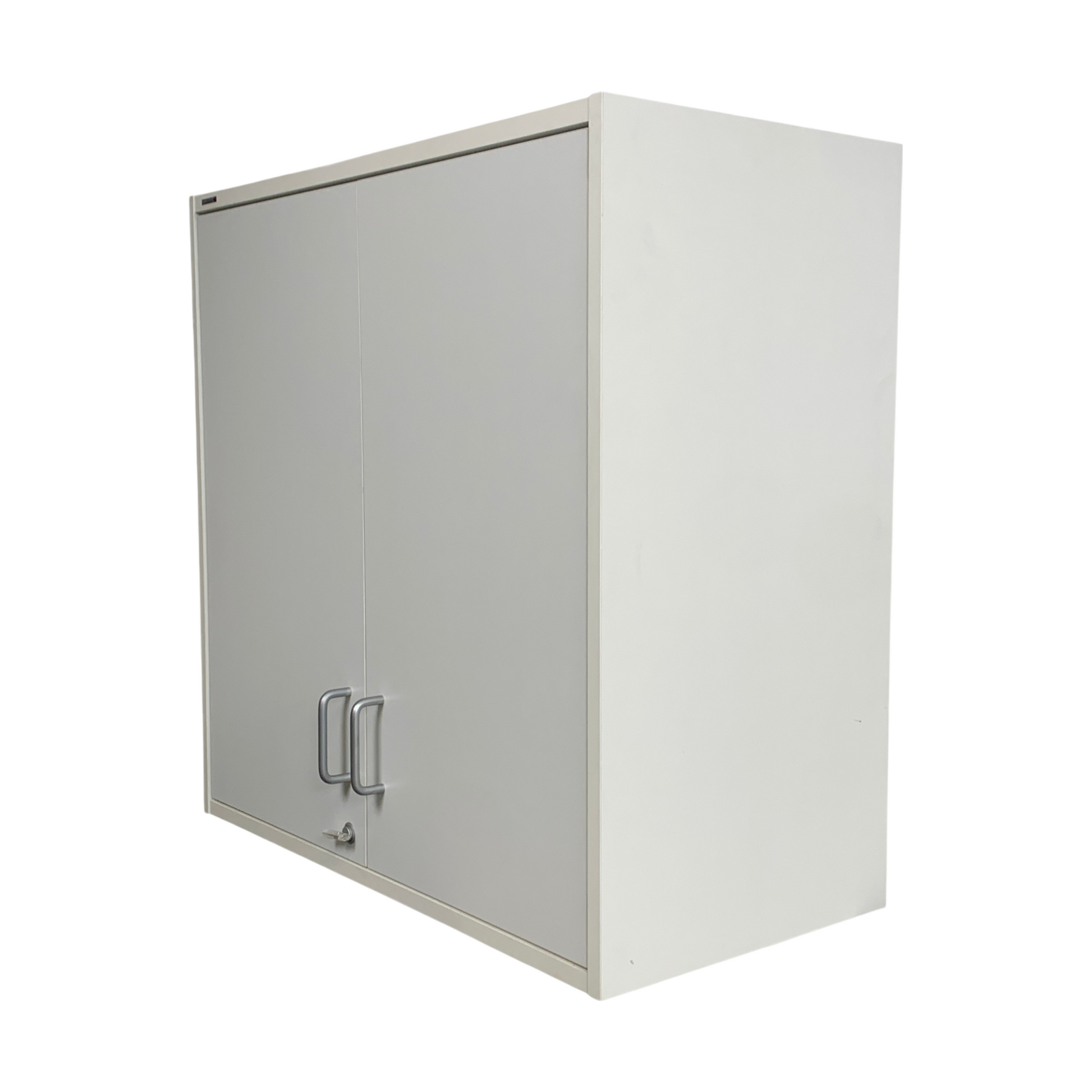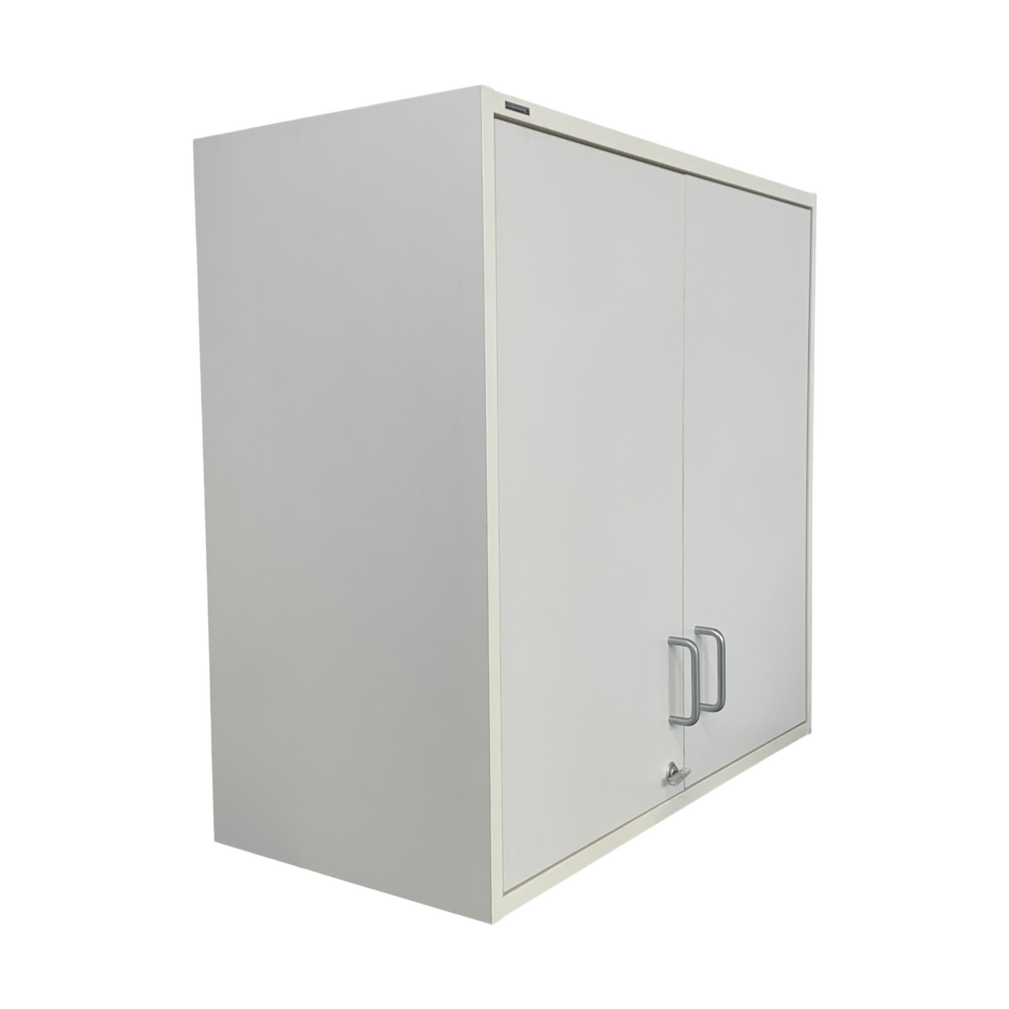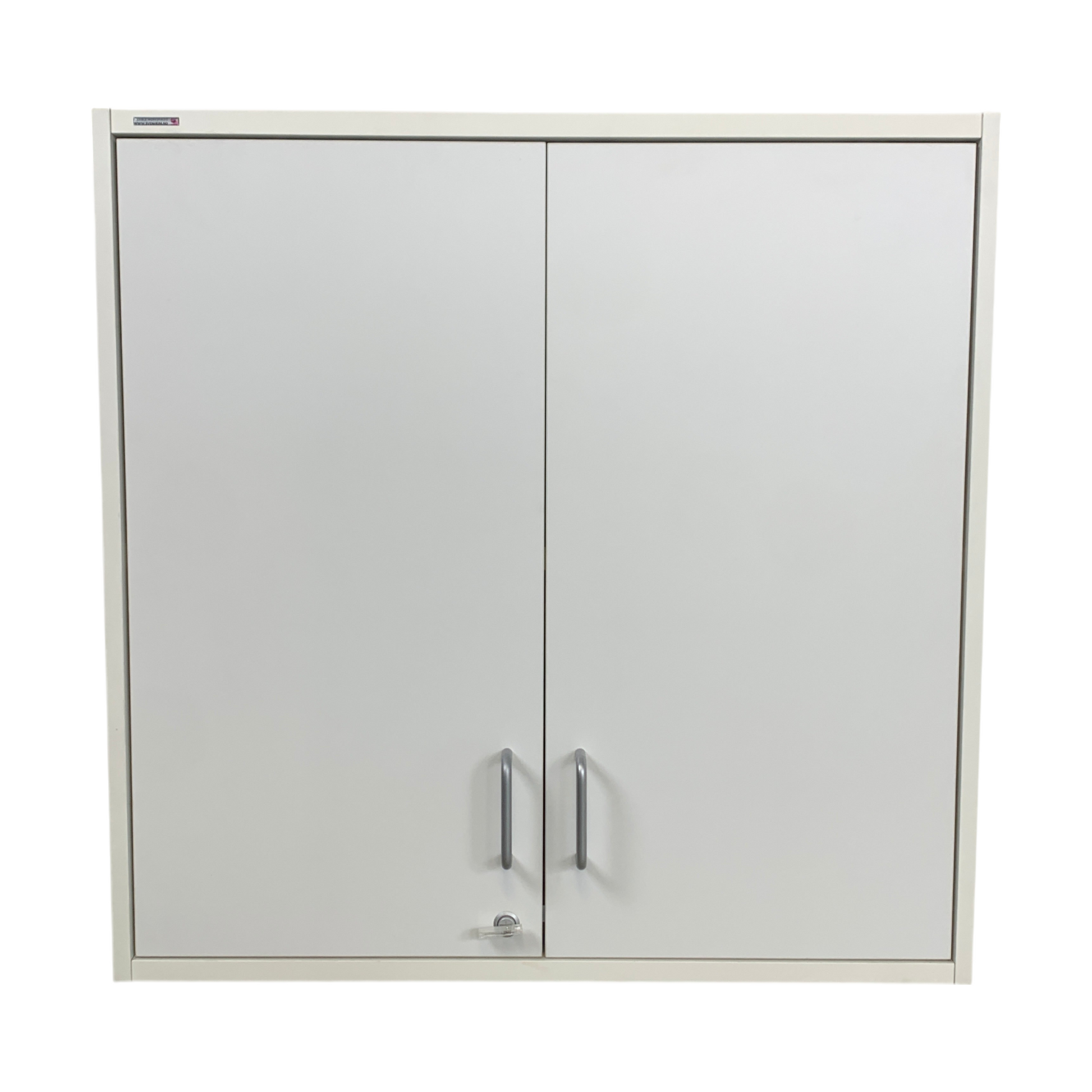 Låsbart overskap i hvit farge med moderne design, perfekt for kontoret eller arbeidsplassen. Med avtagbare pins kan skapet enkelt plasseres oppå annet møblement, og det har en hylle for effektiv oppbevaring.