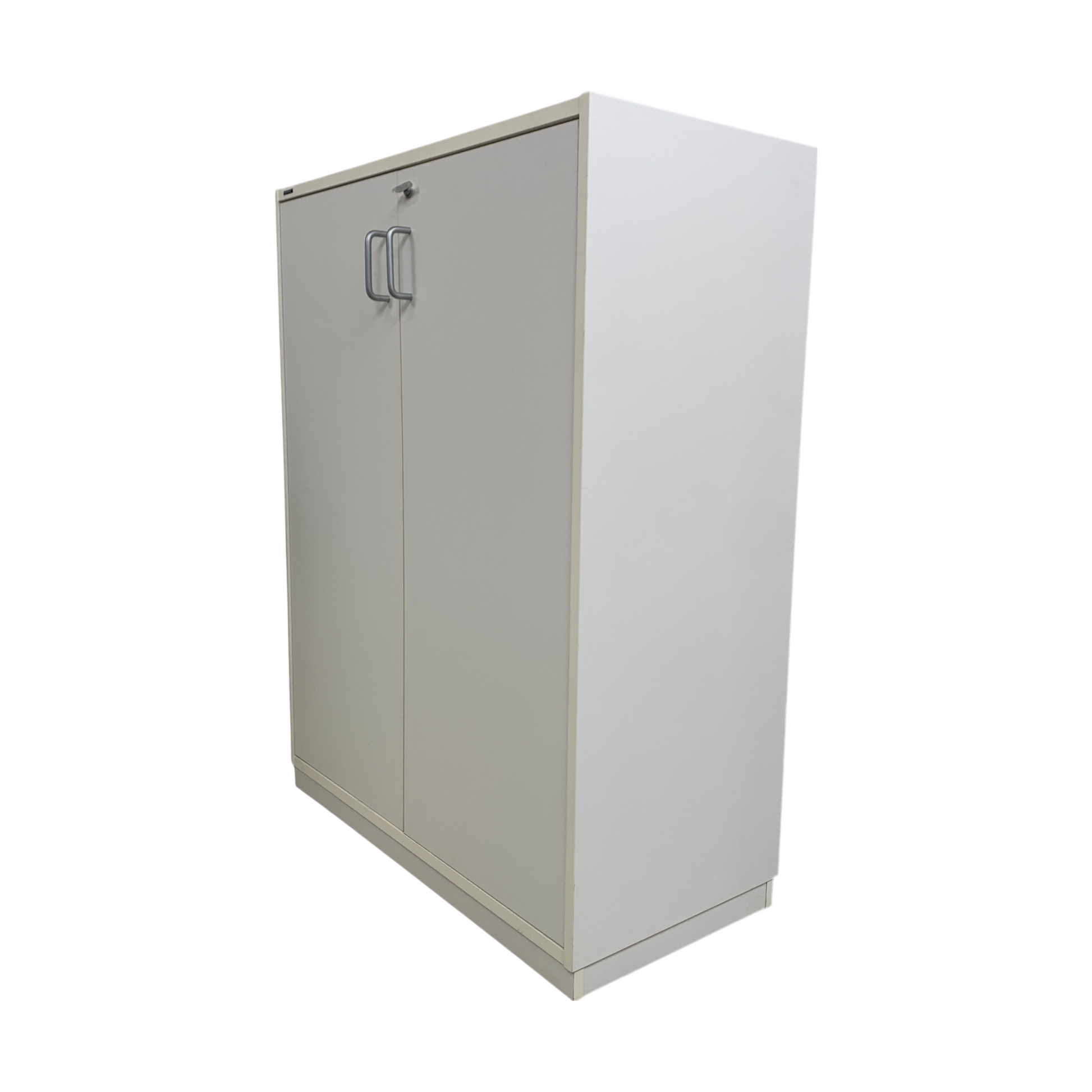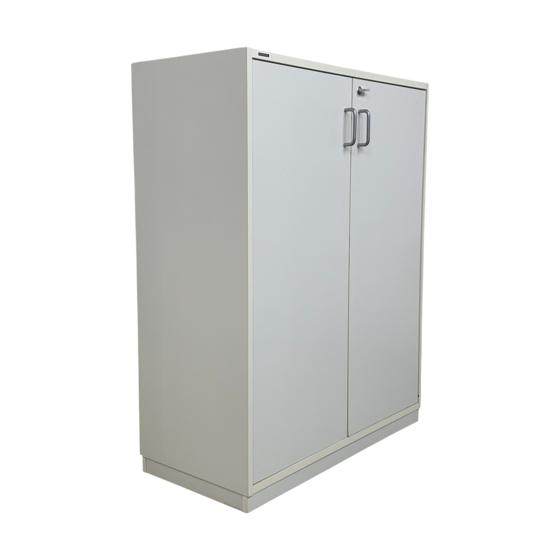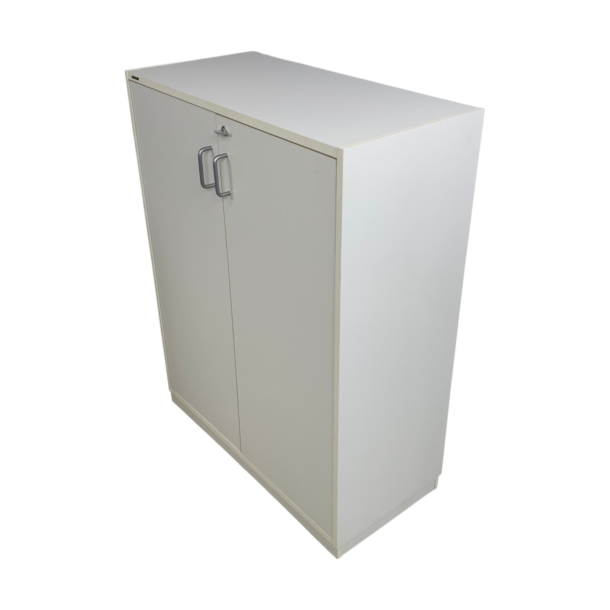 Høyt låsbart kontorskap i moderne design, perfekt for å oppbevare dokumenter og utstyr sikkert. Skapet er kommer i en hvit farge med glatte overflater, og har to hyller som gir god lagringsplass.
