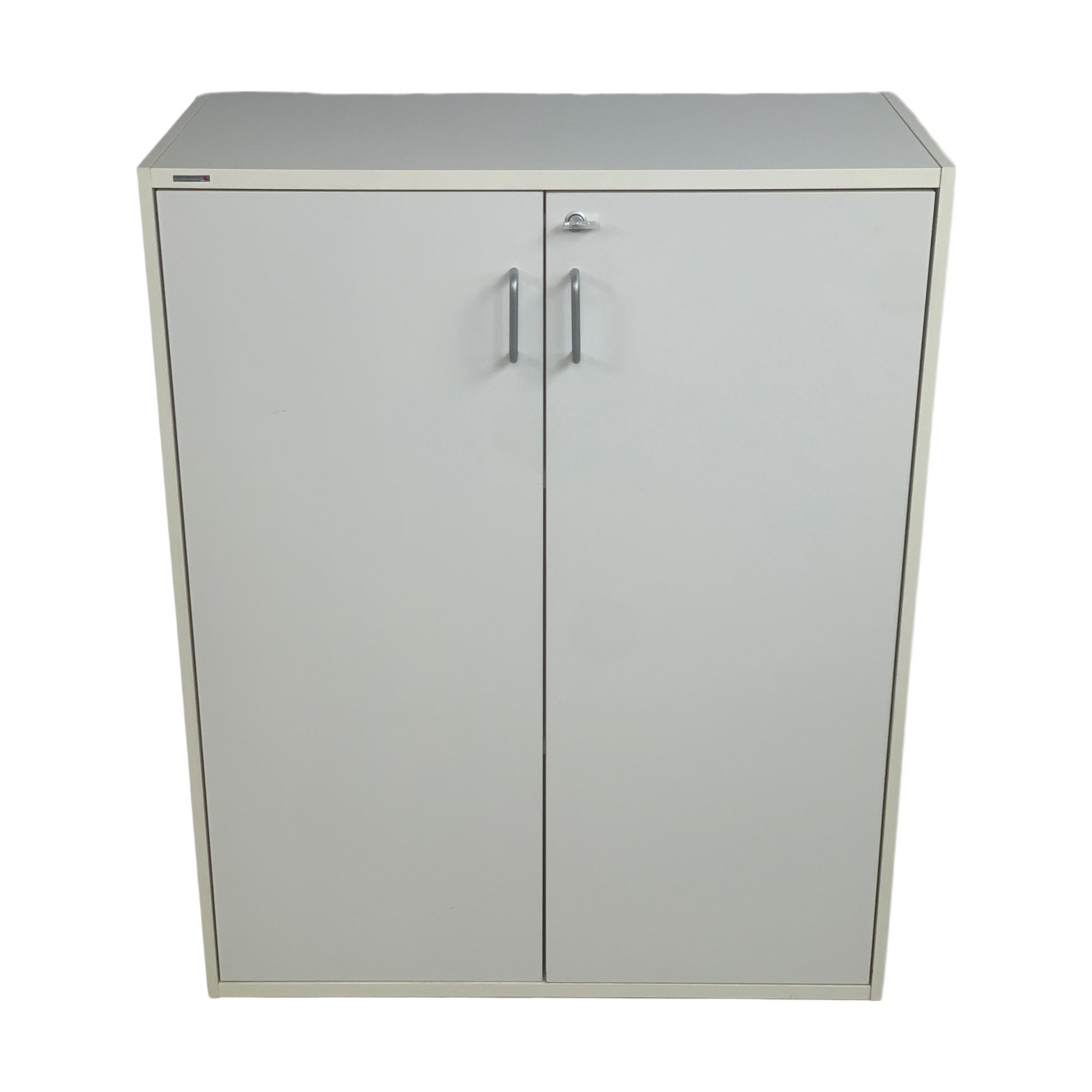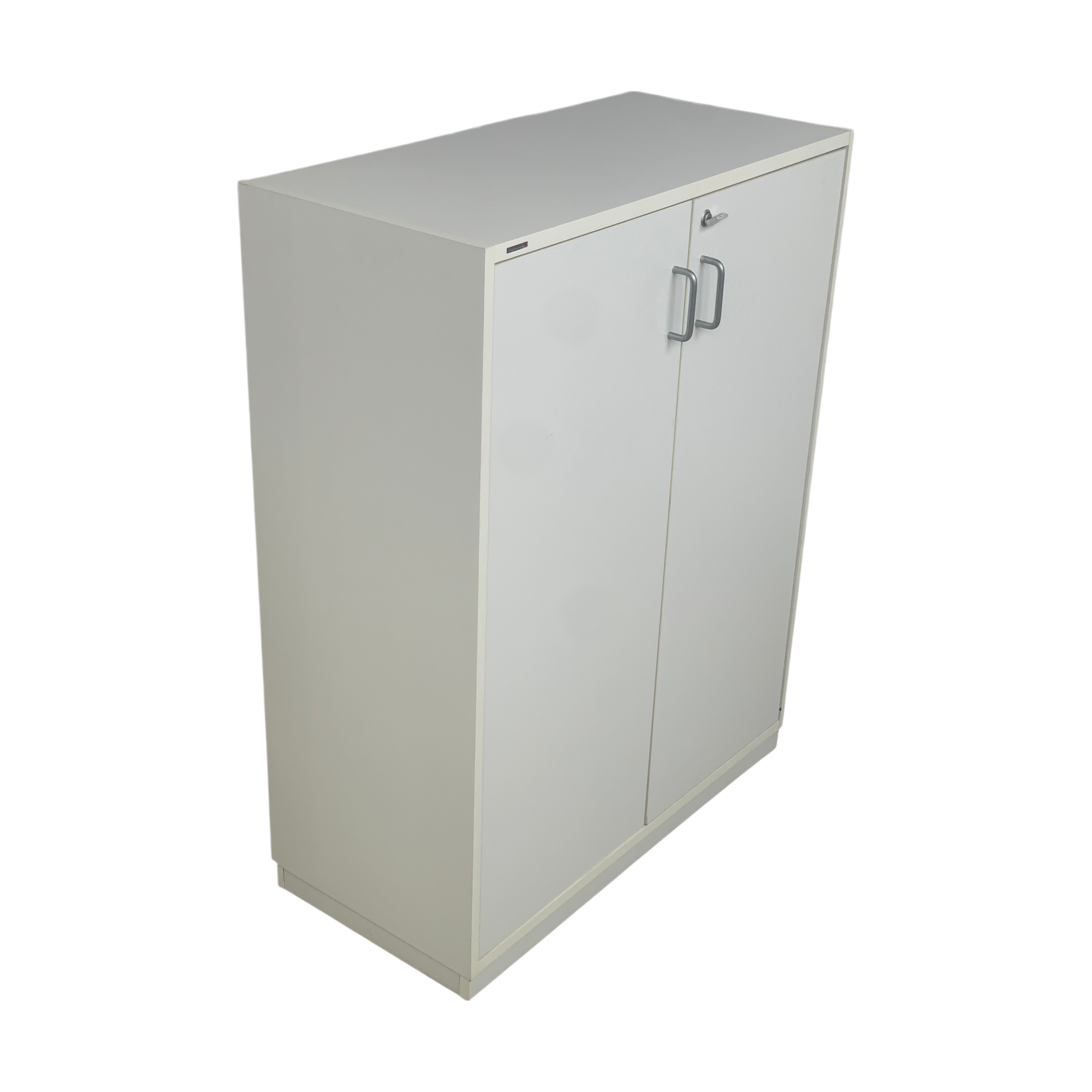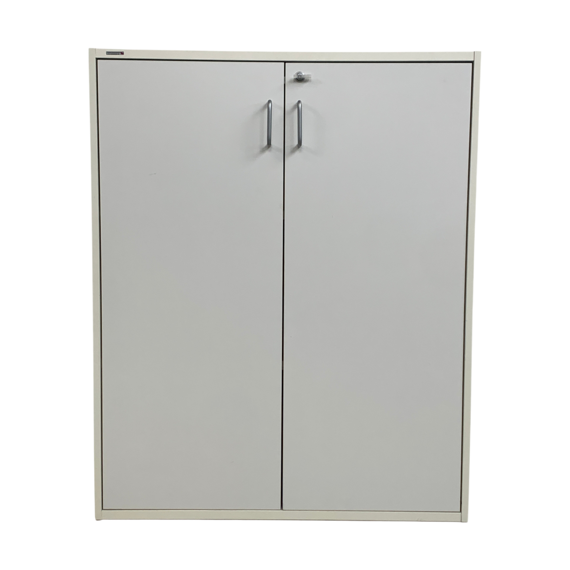 Høyt låsbart kontorskap i moderne design, perfekt for å oppbevare dokumenter og utstyr sikkert. Skapet er kommer i en hvit farge med glatte overflater, og har to hyller som gir god lagringsplass.