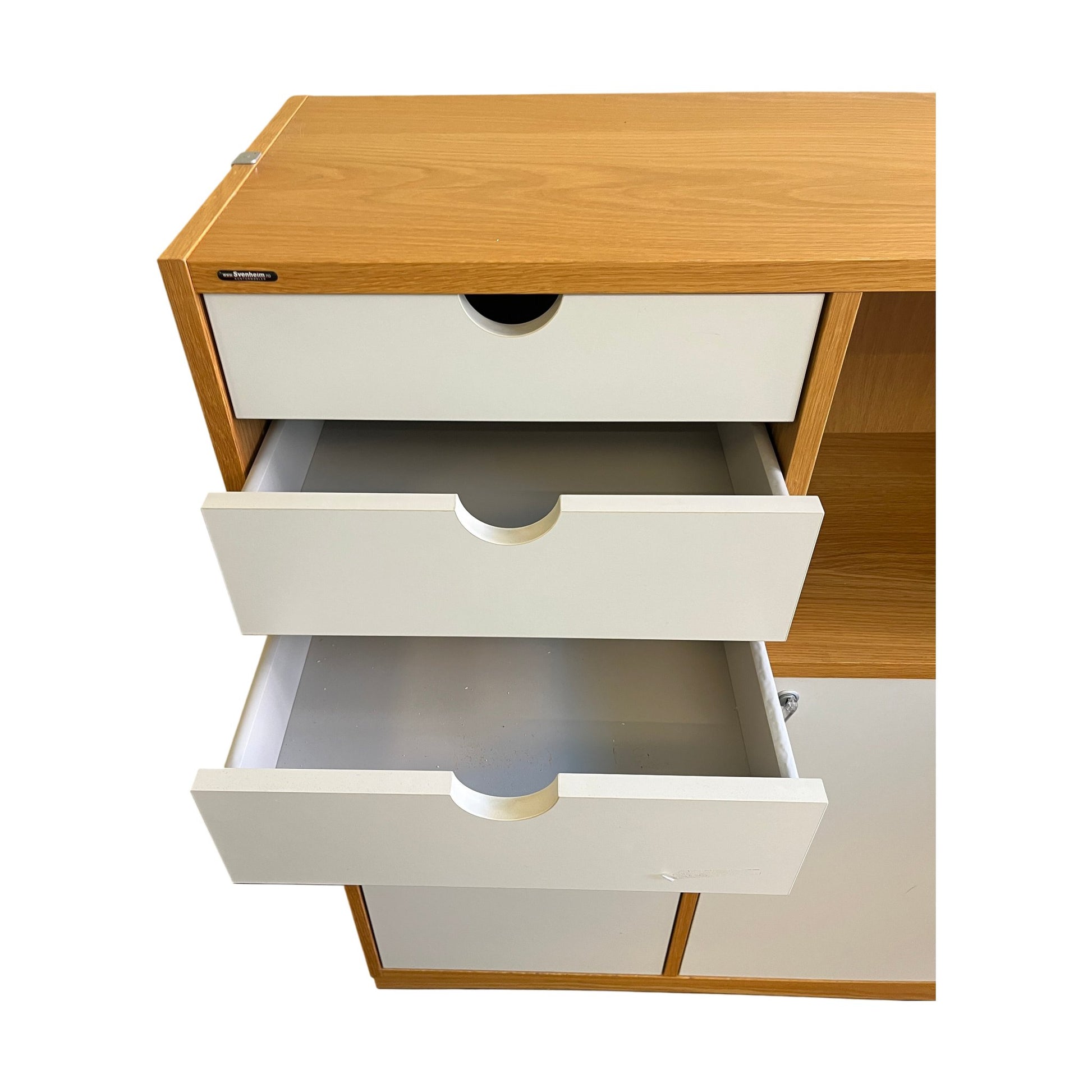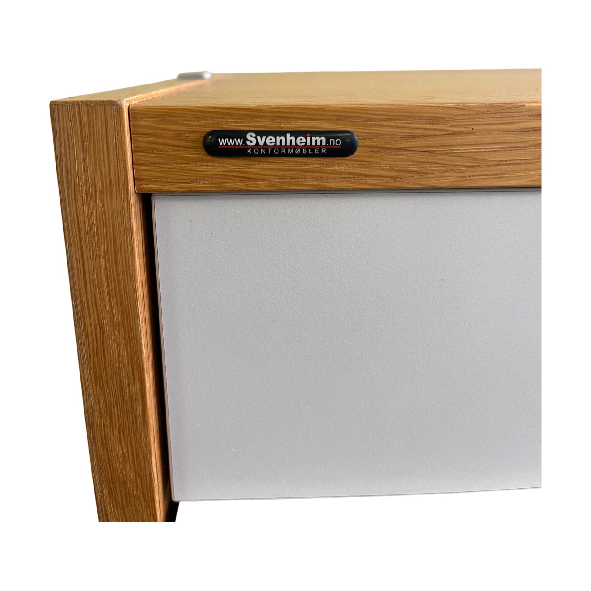 Praktisk og plassbesparende låsbart skap fra Svenheim. Med en trefarget finish og ajourføring, kombinerer dette skapet stil med funksjonalitet. Det har tre skuffer og en åpen hyller, ideelt for oppbevaring av kontorutstyr og dokumenter.