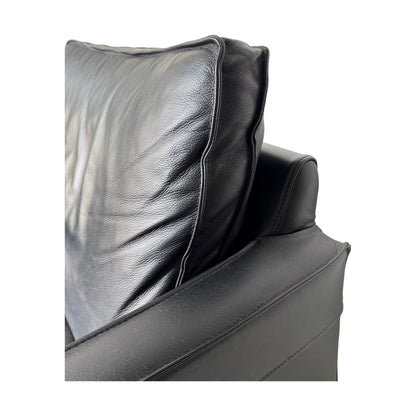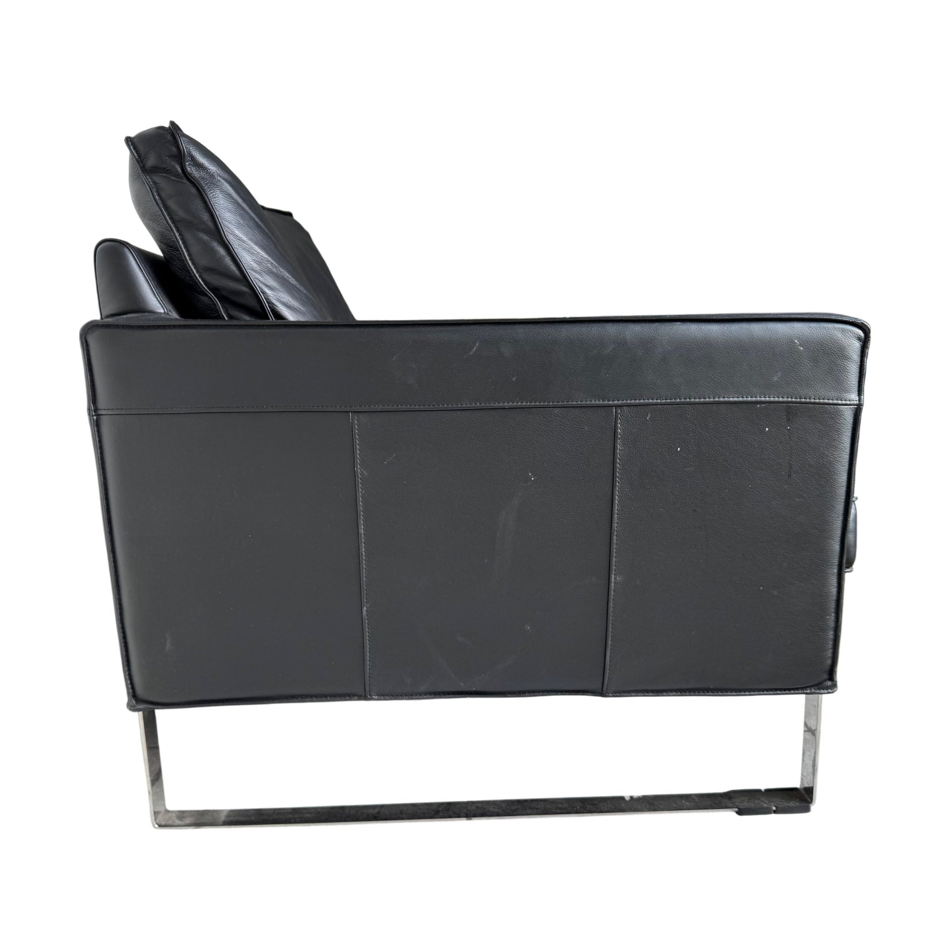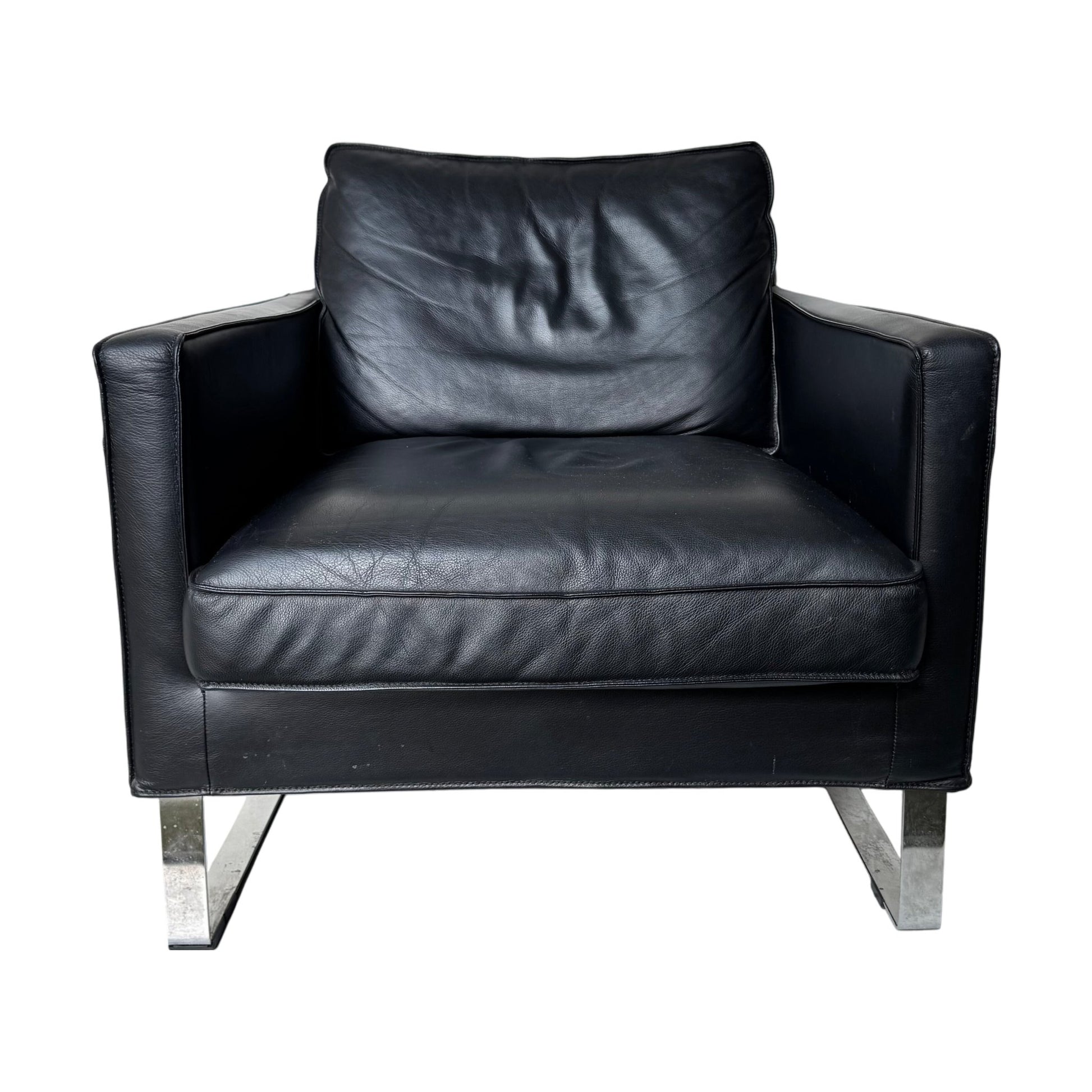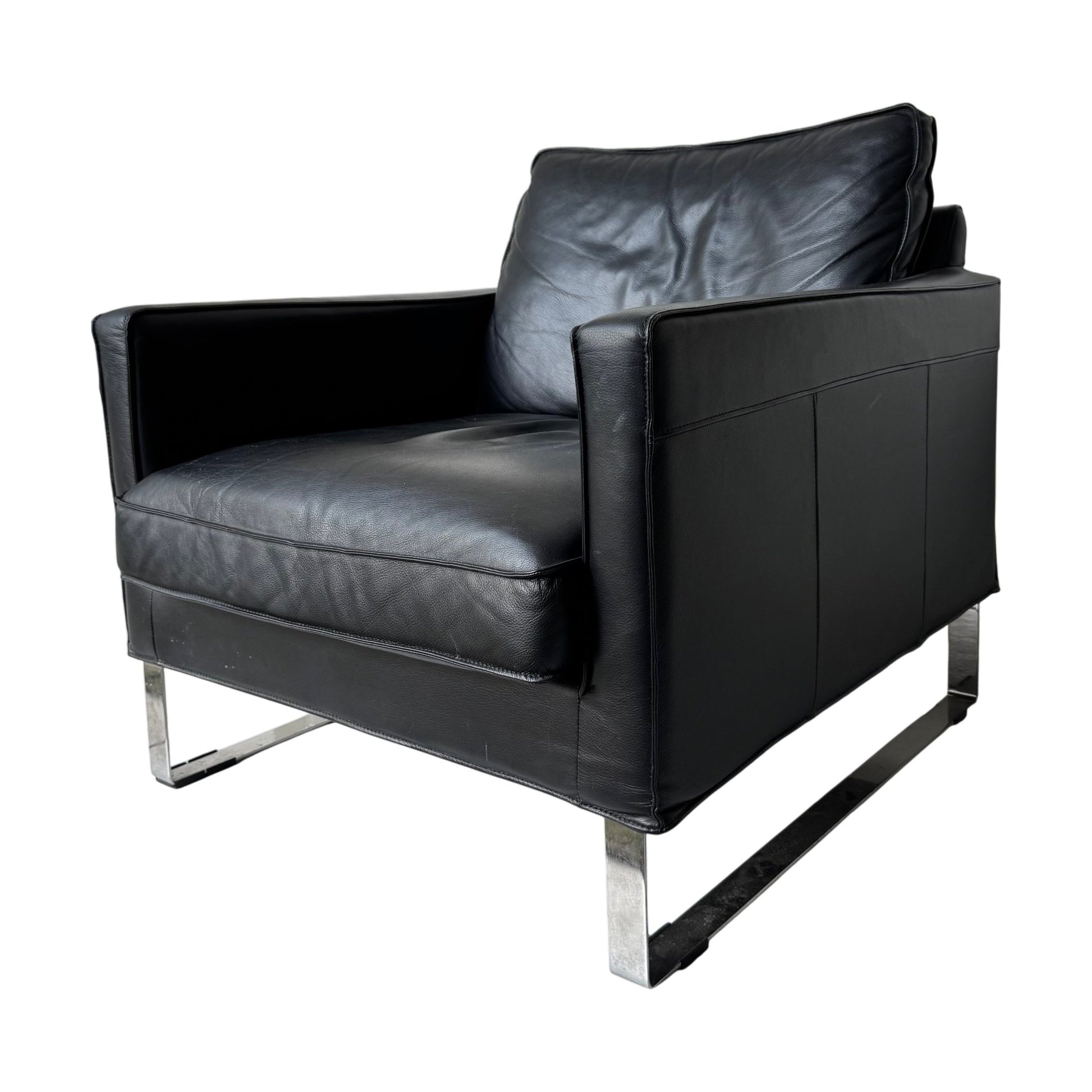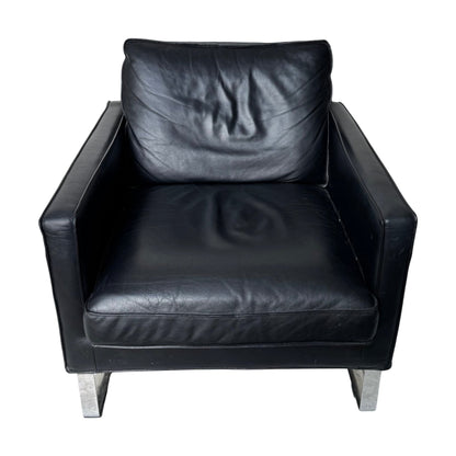 Komfortabel lenestol i skinn med minimalistisk design. Den svarte fargen og enkle stil passer perfekt i moderne interiører. Stolen har en robust konstruksjon og gir en god sitteopplevelse, selv om skinnet har begynt å vise tegn til slitasje.