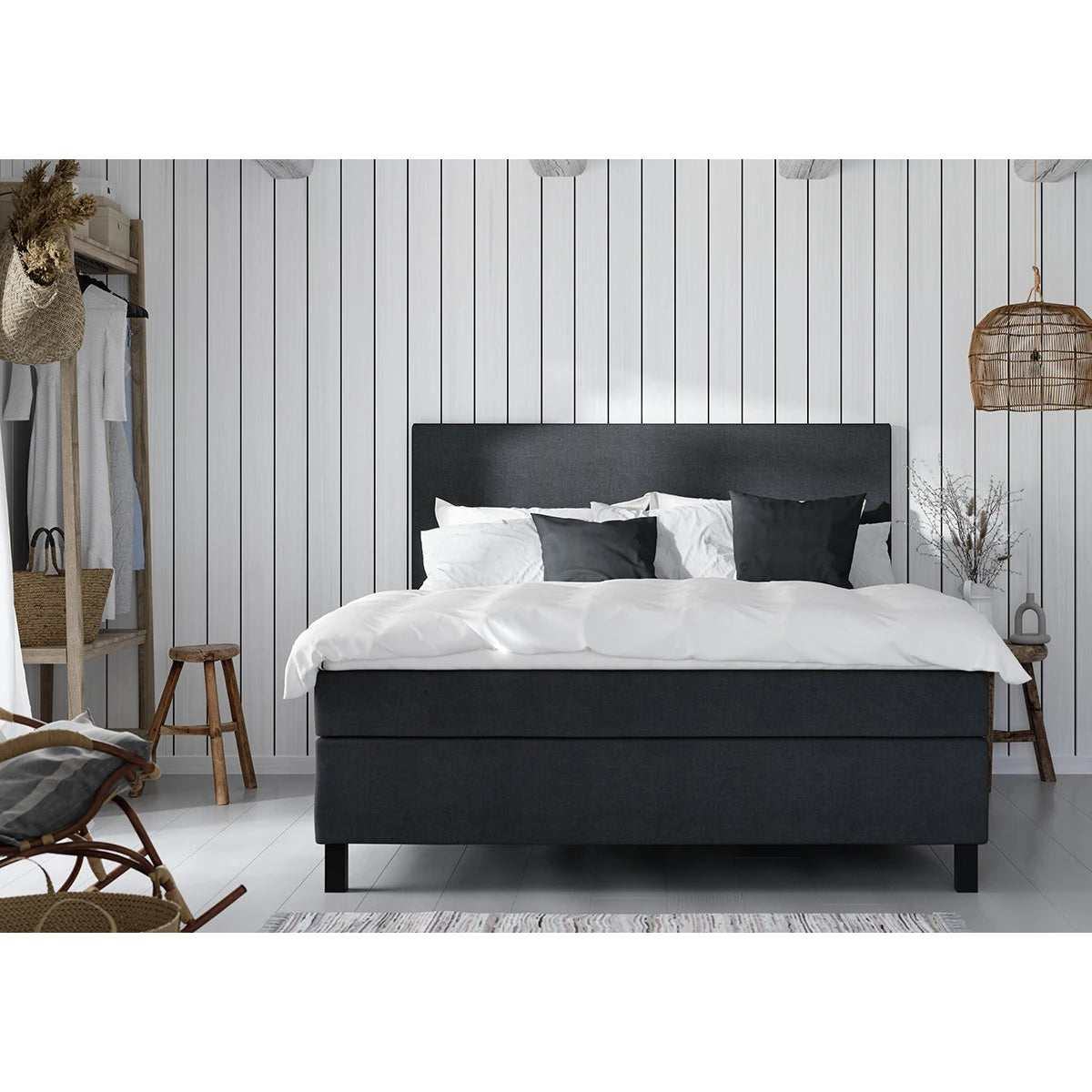 Elegant og komfortabel kontinentalseng fra Wonderland, perfekt for de som ønsker en stilren og moderne soveromsløsning. Sengen har et minimalistisk design med en stilren sengegavl, trukket i slitesterkt svart tekstil, som gir et sofistikert uttrykk. Den høye sengen gir ikke bare en behagelig liggeopplevelse, men også en visuell høyde i rommet, noe som skaper en luftig og åpen atmosfære. Sengen er bygget med Premium Hyperflex-madrass for optimal støtte og komfort, og den medium/fast fastheten tilpasser seg kroppen for en god natts søvn. Overmadrass følger med.