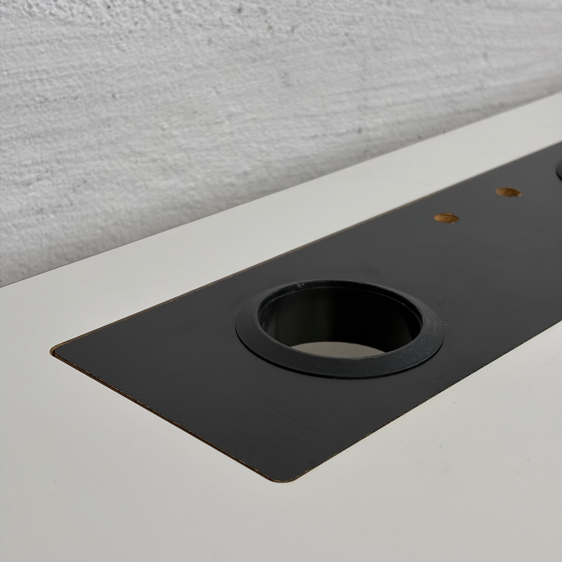 Dette skrivebordet er i god stand med normale brukstegn. Bordplaten er uten dype riper eller skader, og det solide beinet sikrer stabilitet og støtte i alle høyder.