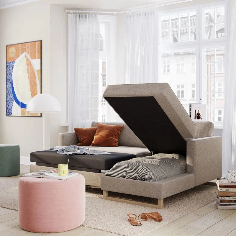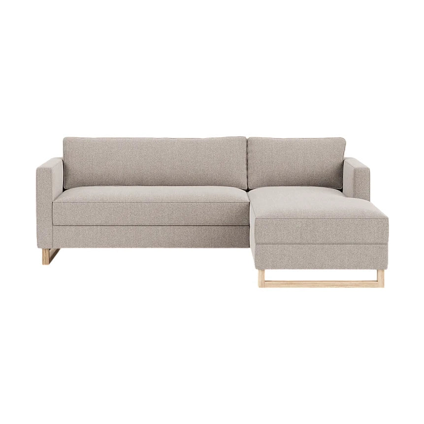 Madison er en sovesofa i et enkelt og klassisk skandinavisk design. De minimalistiske trebenene i tre skaper en flott kontrast til det myke setet og løse ryggputene, og gir sofaen et lett og moderne uttrykk. Du kan enkelt forvandle Madison fra en sofa til en komfortabel dobbeltseng ved å trekke i skuffeuttrekket i bunnen, og i chaiselongdelen kan du også oppbevare sengetøy når den ikke er i bruk.