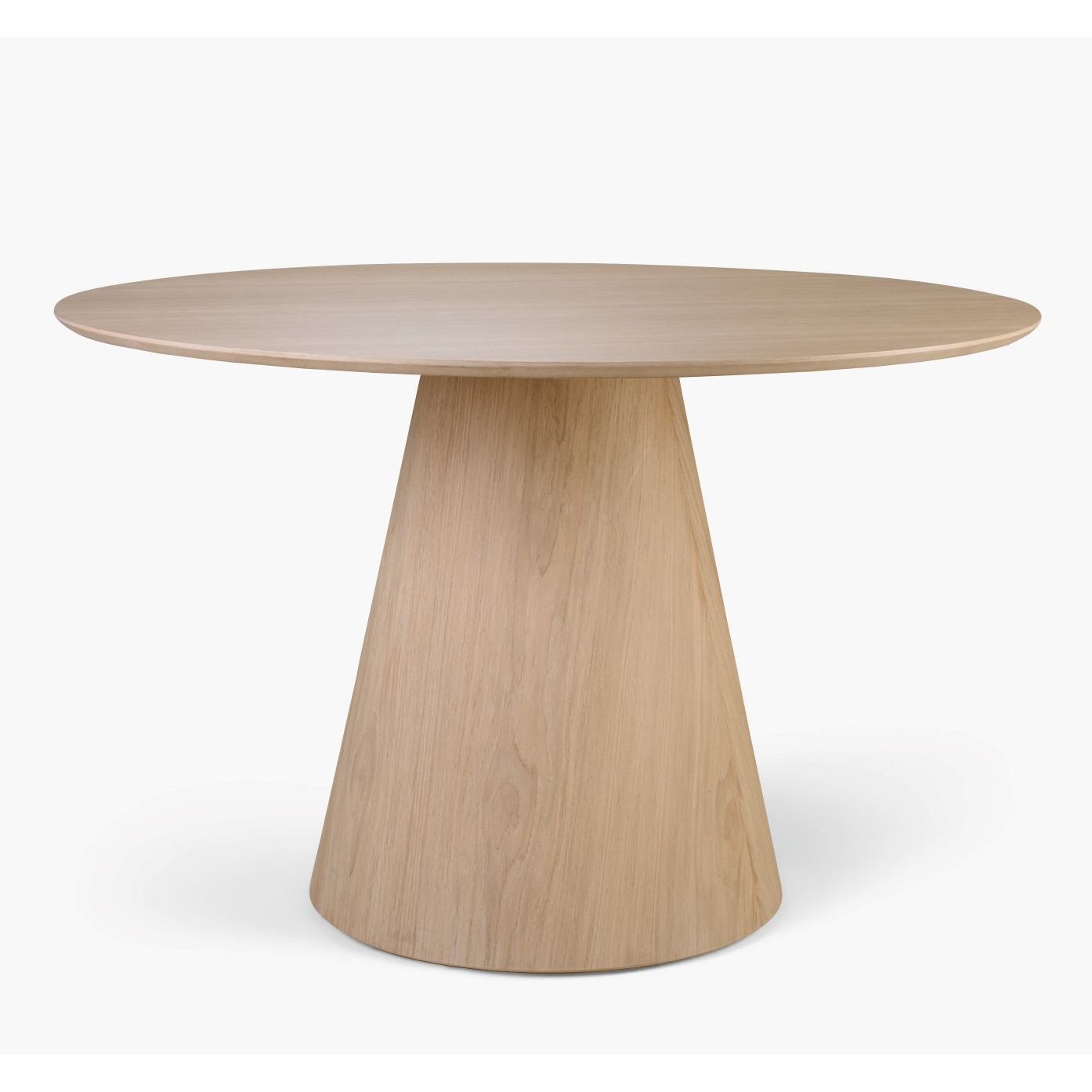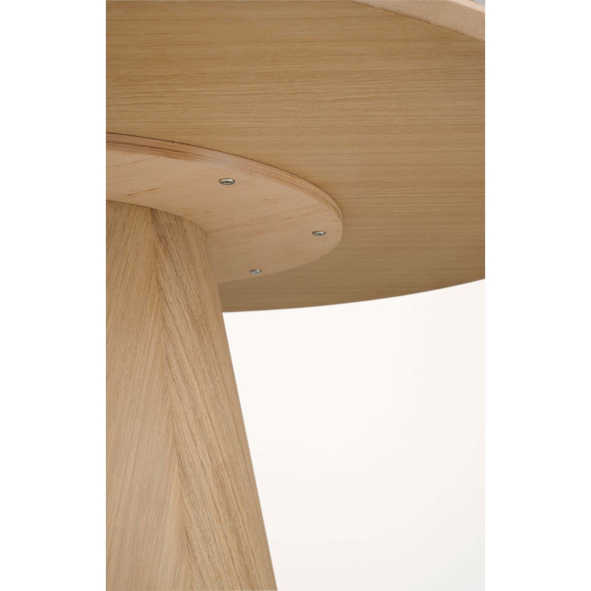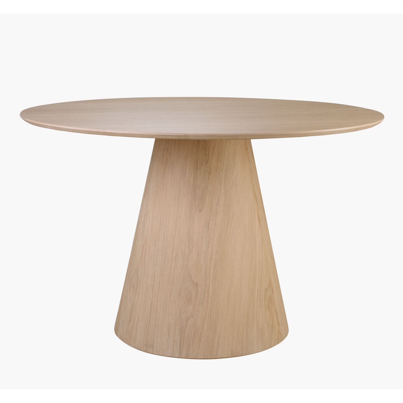 Stilrent og moderne spisebord fra Kid, perfekt for enhver spisestue. Bordet har en diameter på 120 cm og en elegant, naturlig finish som fremhever treets struktur. Den solide konstruksjonen, med et unikt konisk understell, gir bordet et lett og delikat uttrykk. Ideelt for både hverdagsmåltider og spesielle anledninger.