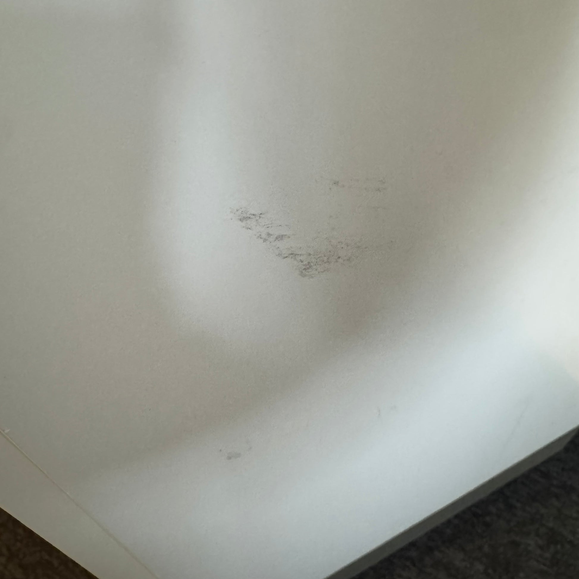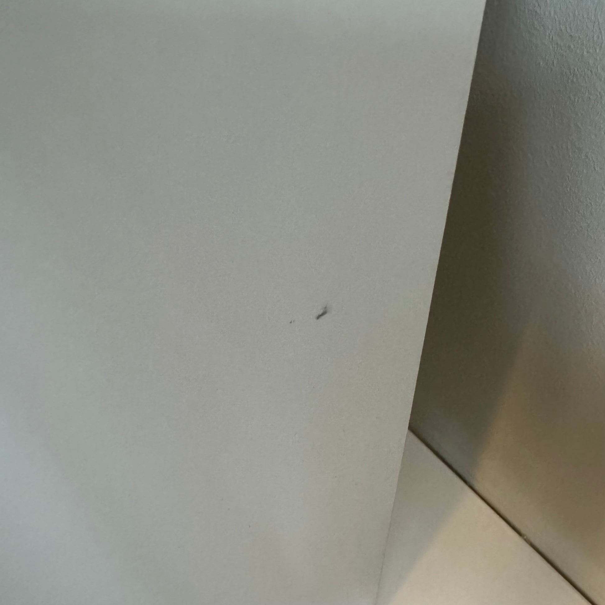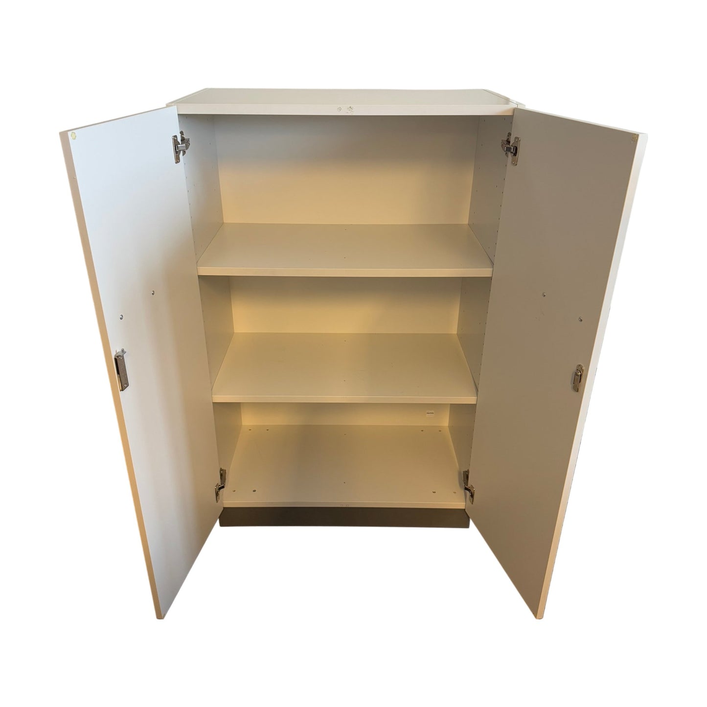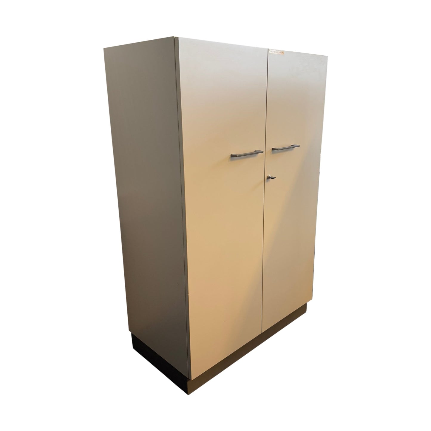 Skapet har noen hakk og merker som er synlige. Til tross for disse bruksmerkene er skapet solid og funksjonelt, og det tilbyr fortsatt god lagringskapasitet for alle dine behov på kontoret.