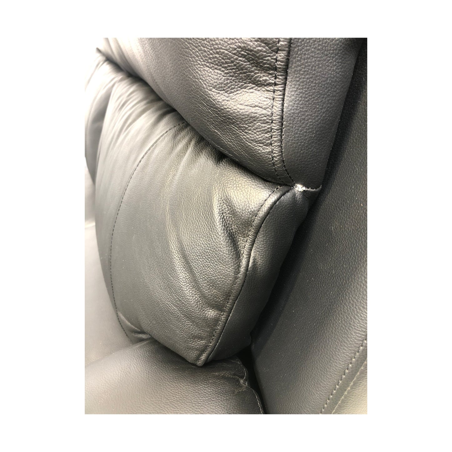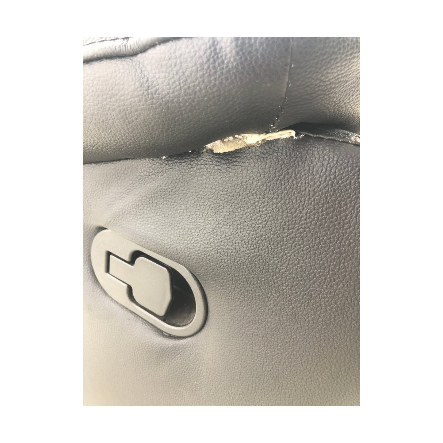 Sofaen er i god stand, men har en rift under det ene armlenet samt et par mindre bruksmerker på ryggstøttene. Til tross for disse mindre bruksmerkene, er materialet i hud/PVC pent bevart, og recliner-funksjonen fungerer uten problemer.