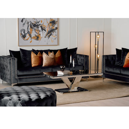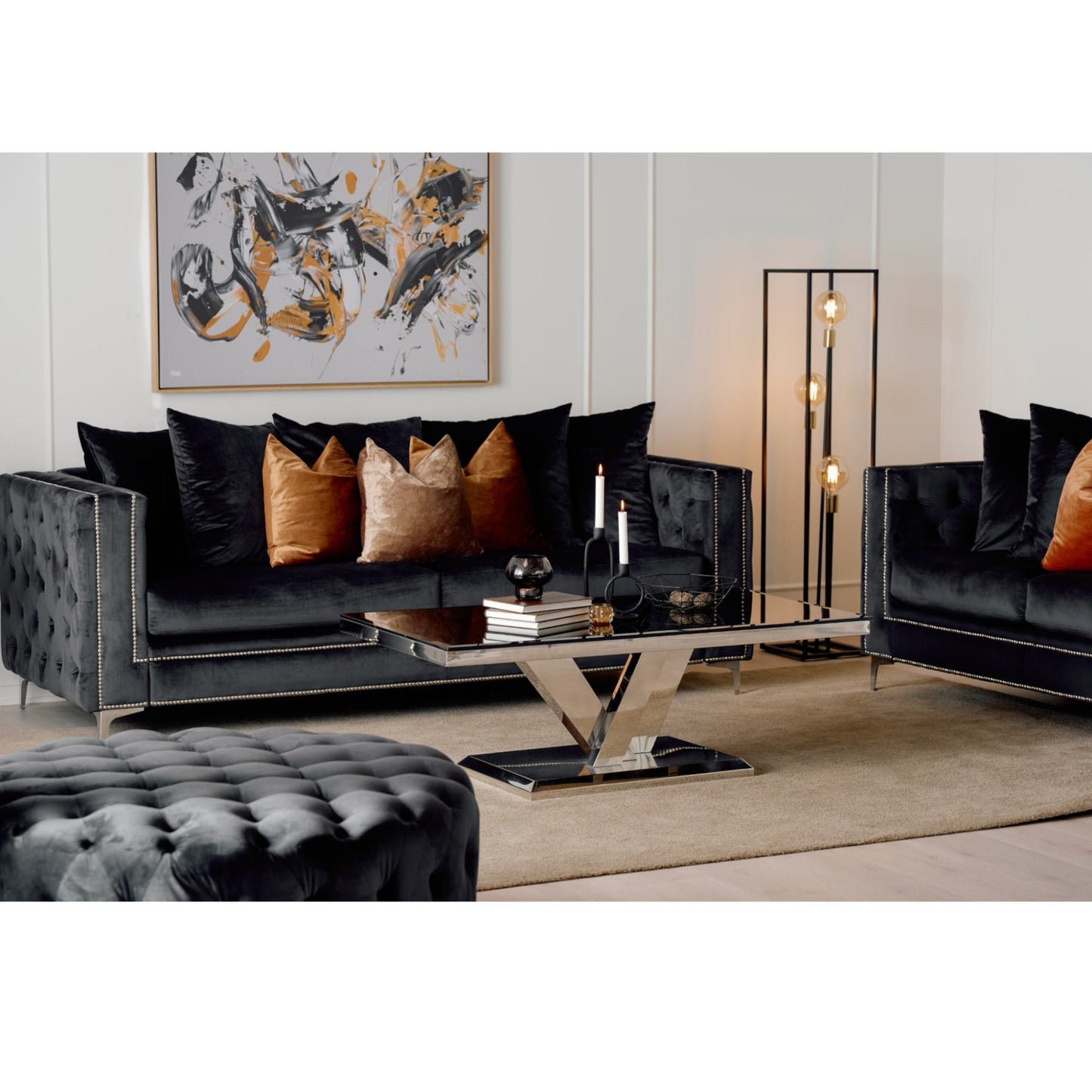 Messina sofabord er et elegant og stilfullt møbel som vil gi et sofistikert preg til enhver stue. Med sin sorte glassplate og sølvfargede v-formede sokkel, skiller dette sofabordet seg ut som et midtpunkt i rommet. Det moderne designet kombinerer estetikk og funksjonalitet, og gir en eksklusiv følelse som komplimenterer enhver innredning.