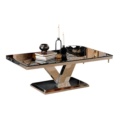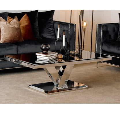 Messina sofabord er et elegant og stilfullt møbel som vil gi et sofistikert preg til enhver stue. Med sin sorte glassplate og sølvfargede v-formede sokkel, skiller dette sofabordet seg ut som et midtpunkt i rommet. Det moderne designet kombinerer estetikk og funksjonalitet, og gir en eksklusiv følelse som komplimenterer enhver innredning.