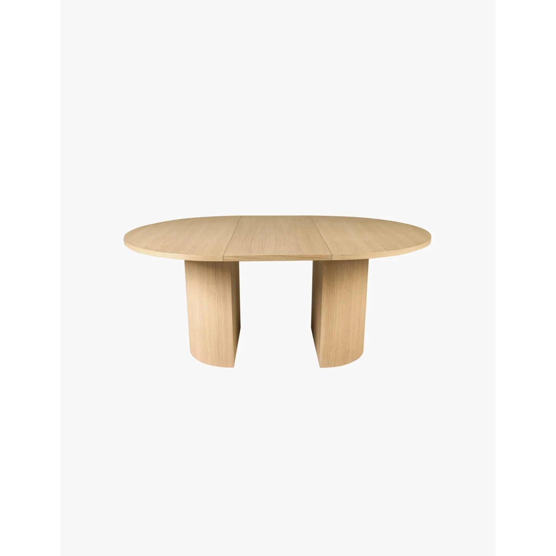 Praktisk, solid og stilsikkert spisebord med rund form og mulighet for to ileggsplater (en ileggsplate er inkludert). Bordet har en minimalistisk, matt og slett finish i eikefiner som gir et eksklusivt preg, og den runde formen tilfører et tidsriktig uttrykk i rommet. Et rundt bord inviterer også til sosiale, hyggelige middager! Legg også merke til den praktiske utformingen med sokkel i midten i stedet for bordben. Dette gjør det enklere å plassere stoler rundt bordet, samtidig som uttrekksmekanismen ikke bygger nedover under bordplaten og det blir god plass til bena. Den naturlige overflaten i eik gir hvert bord naturlige variasjoner fra bord til bord. En unik finish laget av de naturlige mønstrene i treverket.